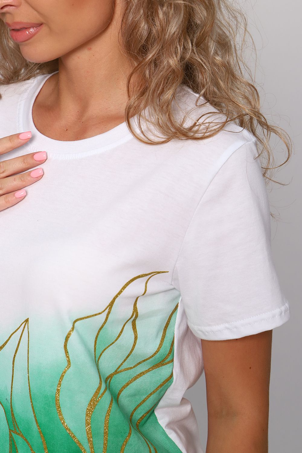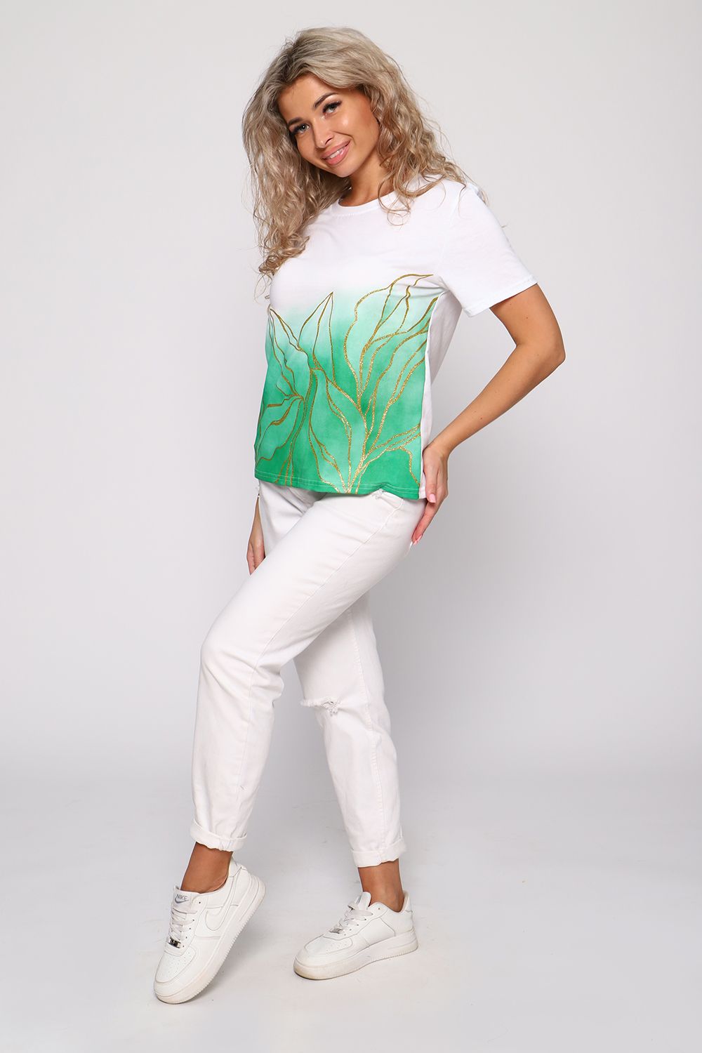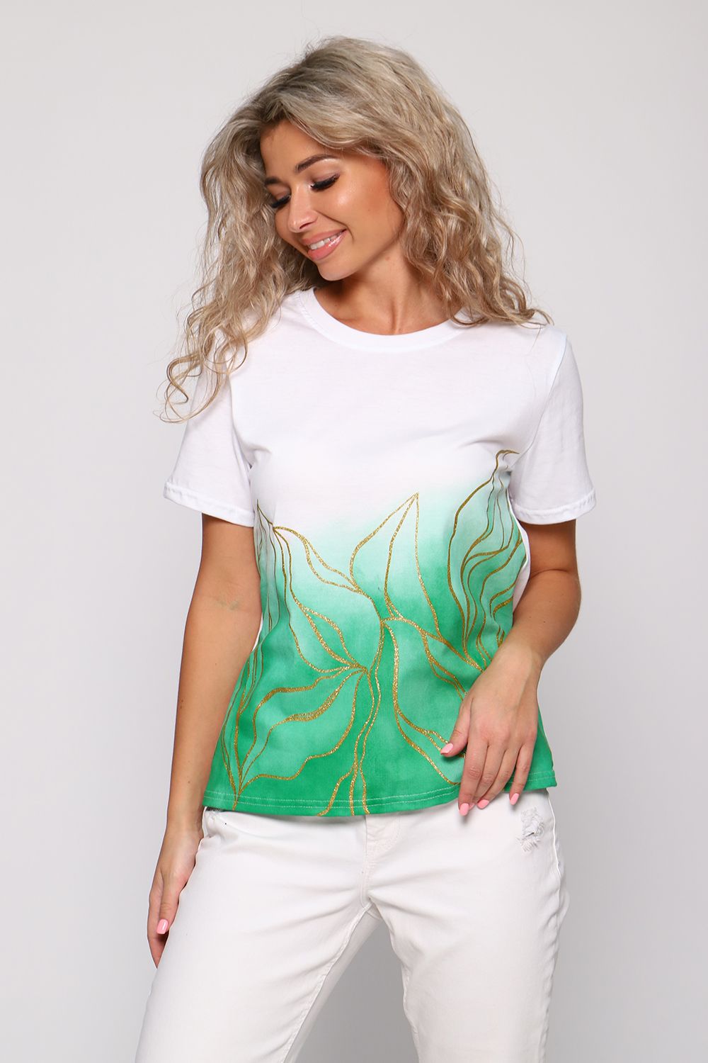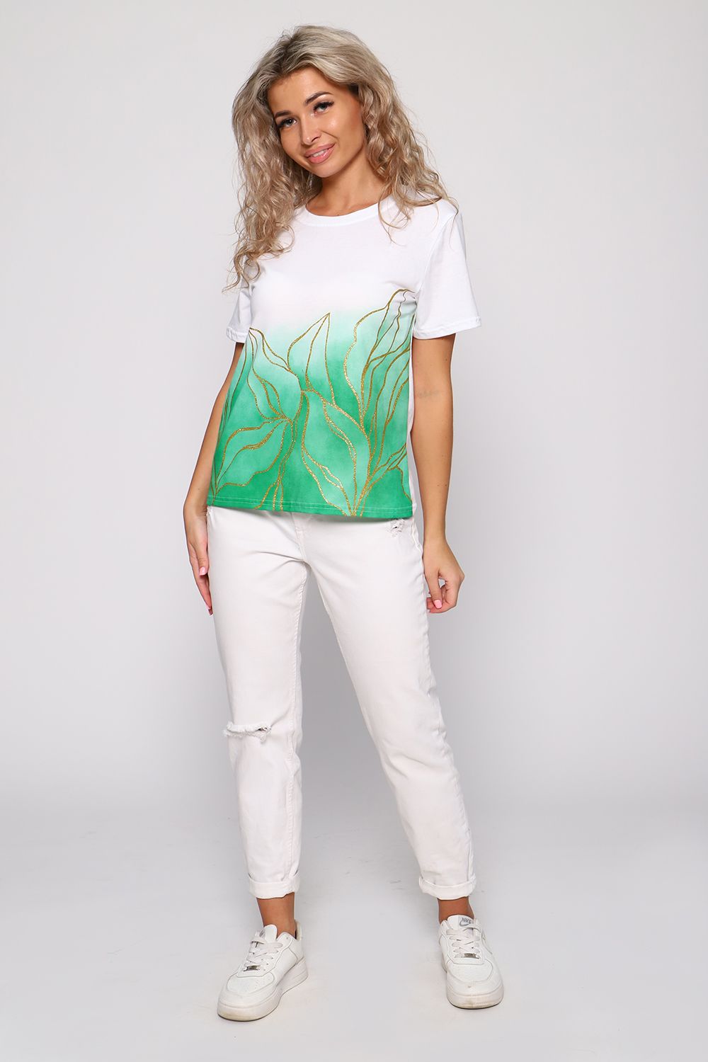 Футболка классического фасона, прямого кроя, с коротким рукавом и округлым вырезом. Декорирована принтом. Универсальная модель футболки отлично подойдет для любого образа и станет необходимой вещью в вашем гардеробе