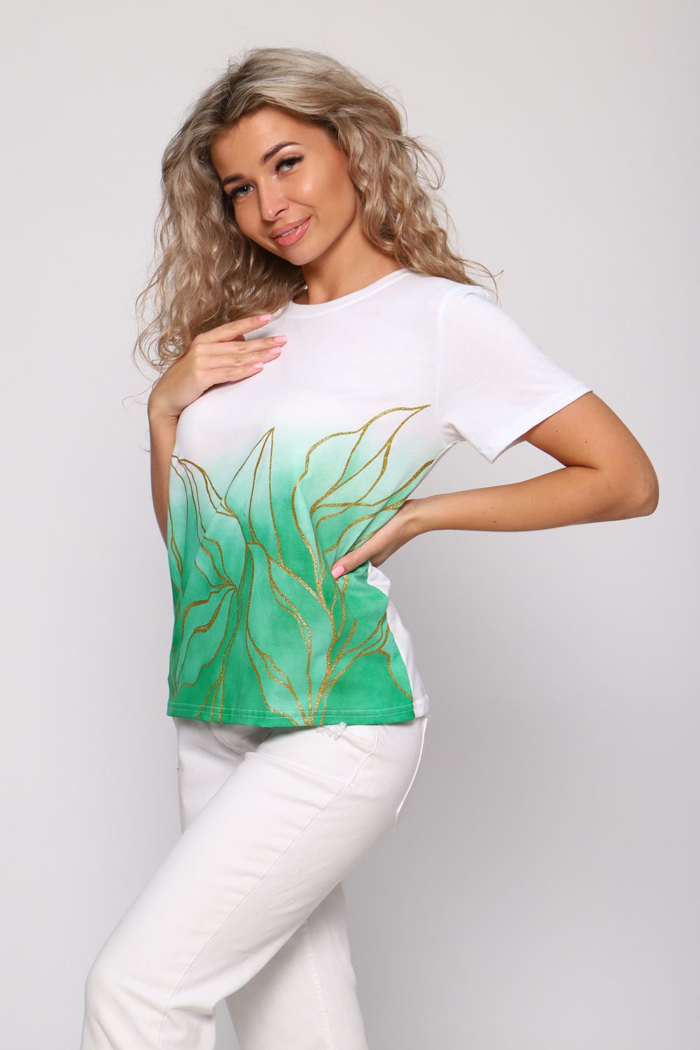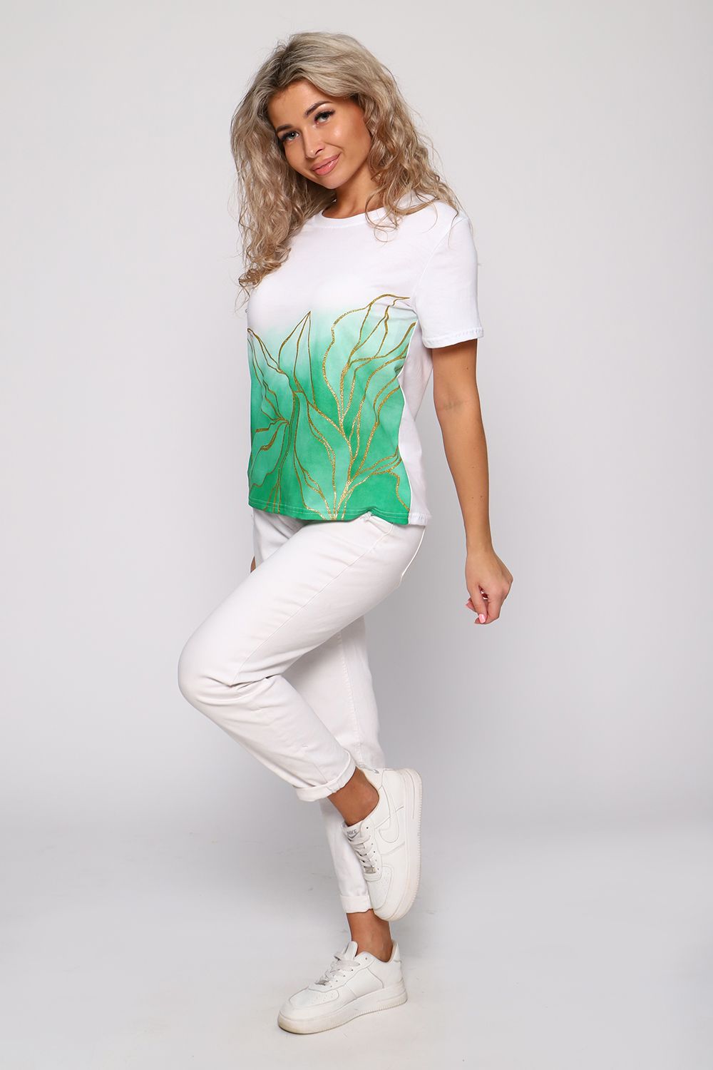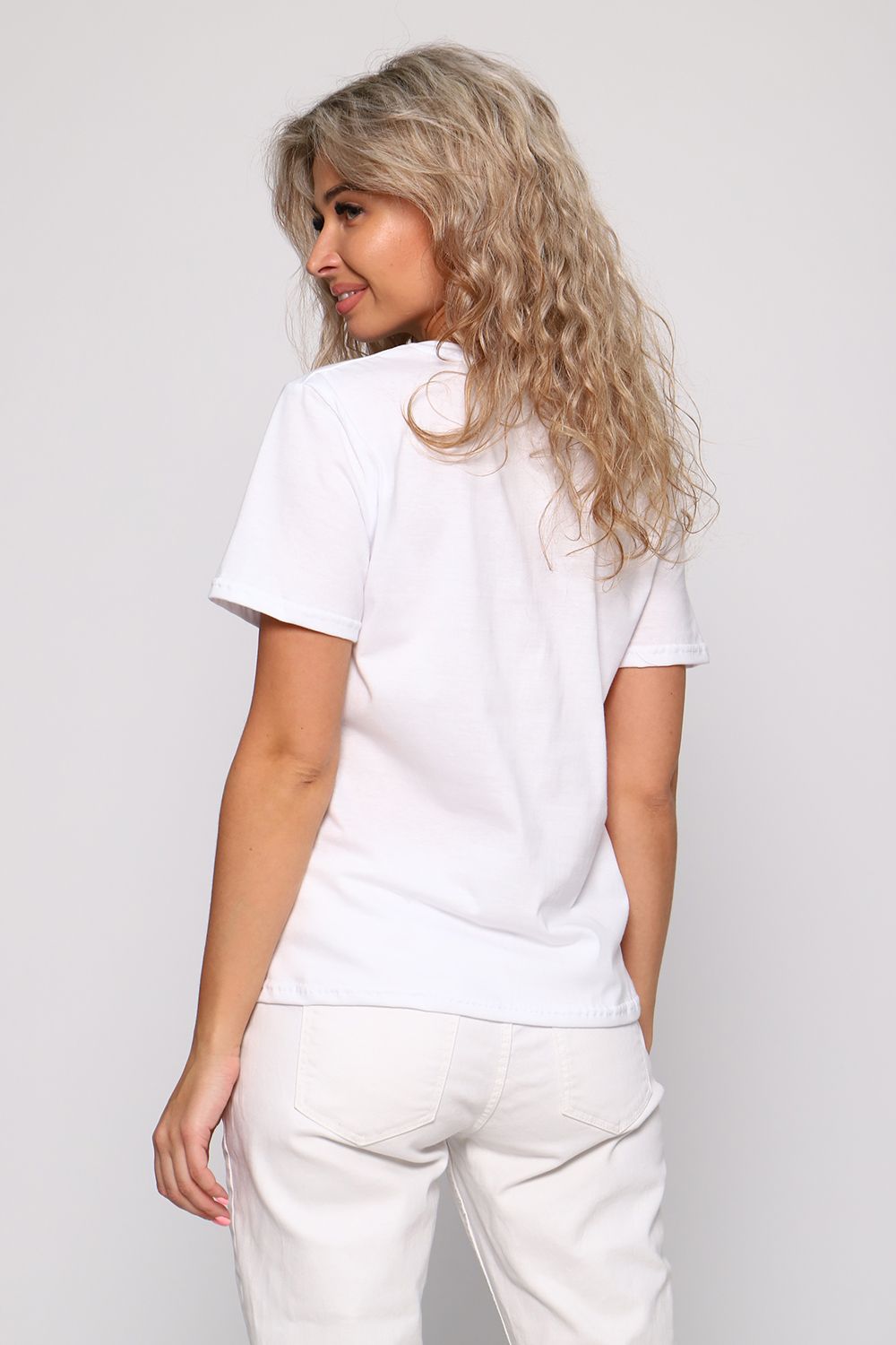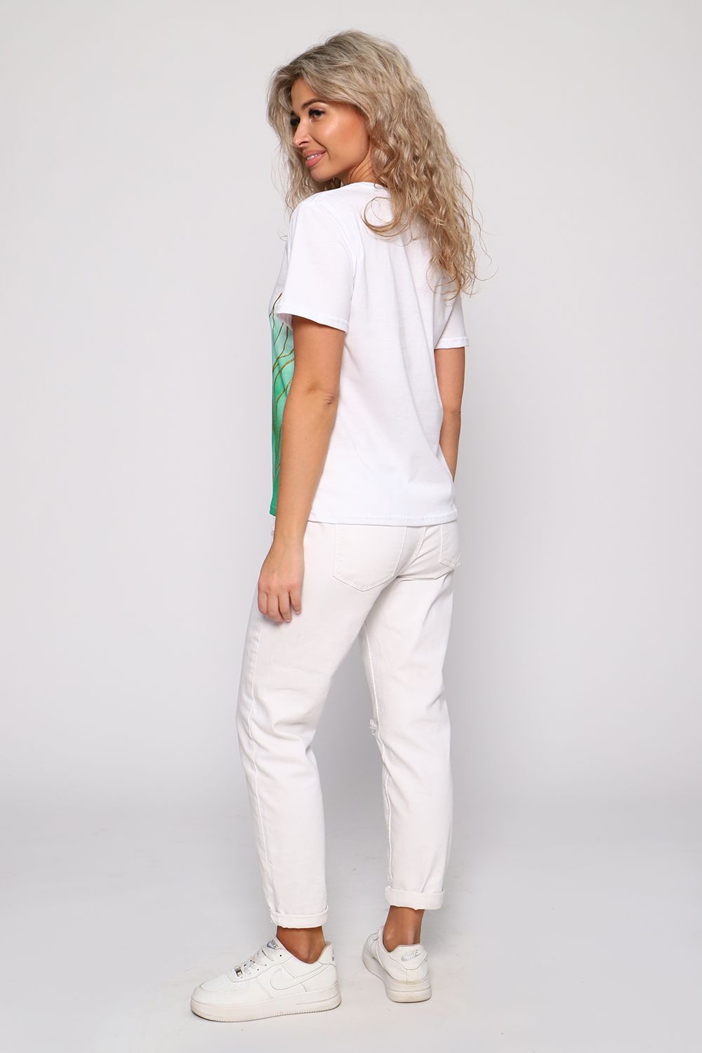 Футболка классического фасона, прямого кроя, с коротким рукавом и округлым вырезом. Декорирована принтом. Универсальная модель футболки отлично подойдет для любого образа и станет необходимой вещью в вашем гардеробе