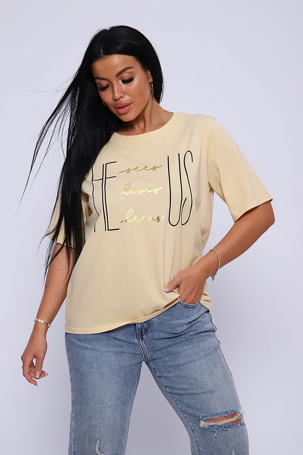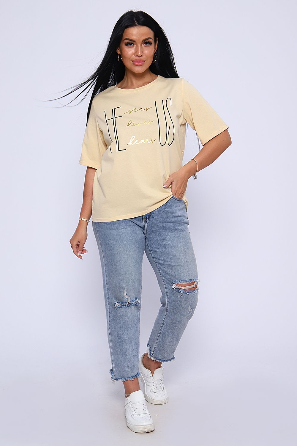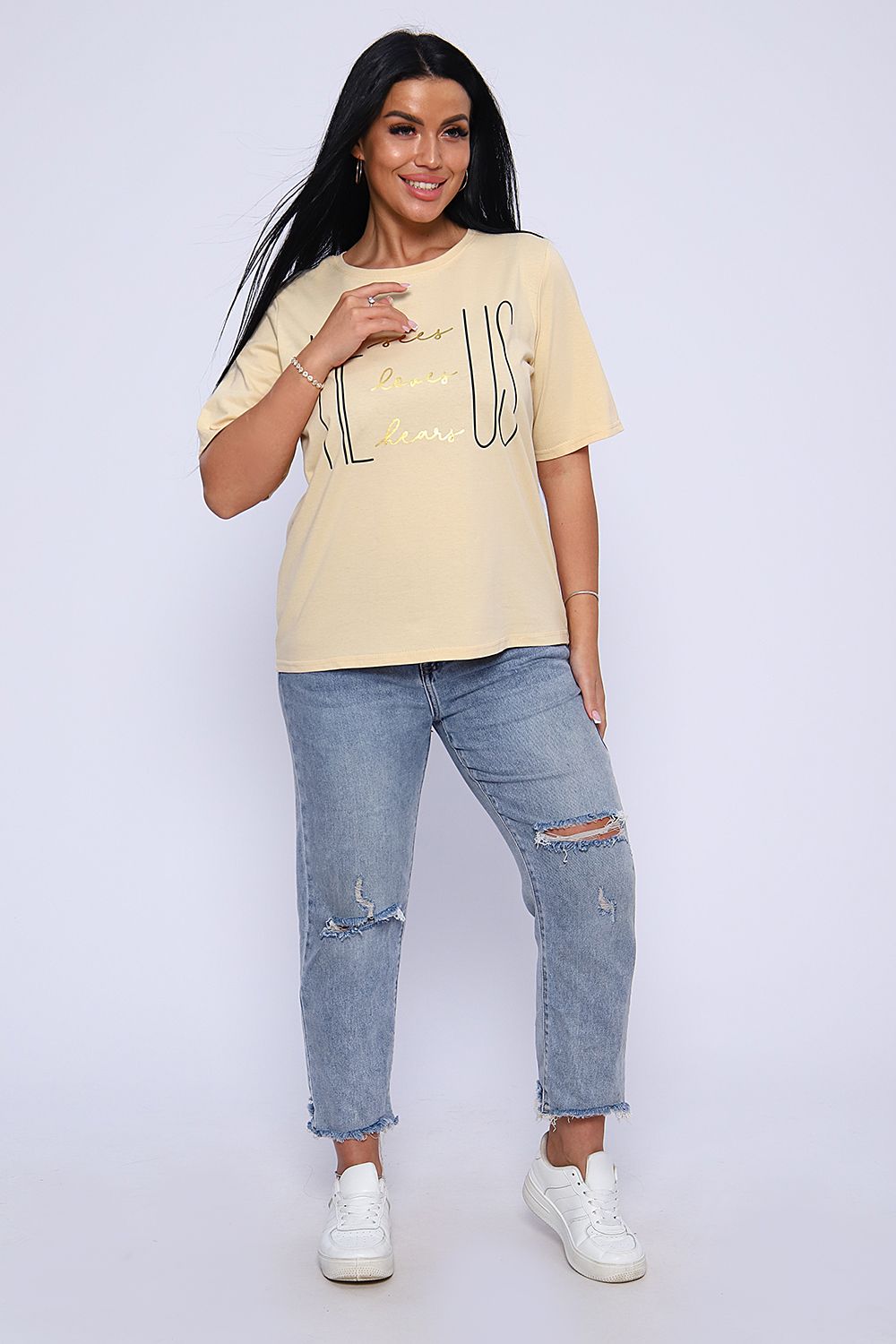 Футболка с благородным блеском золота на необыкновенно женственном принте HE US притягивает взгляд и позволяет чувствовать себя необыкновенной! Прямой силуэт, выверенная длина рукава до локтя, обработка деталей вкруговую с закрепкой. Горловина выполнена из основной ткани. Большие размеры!