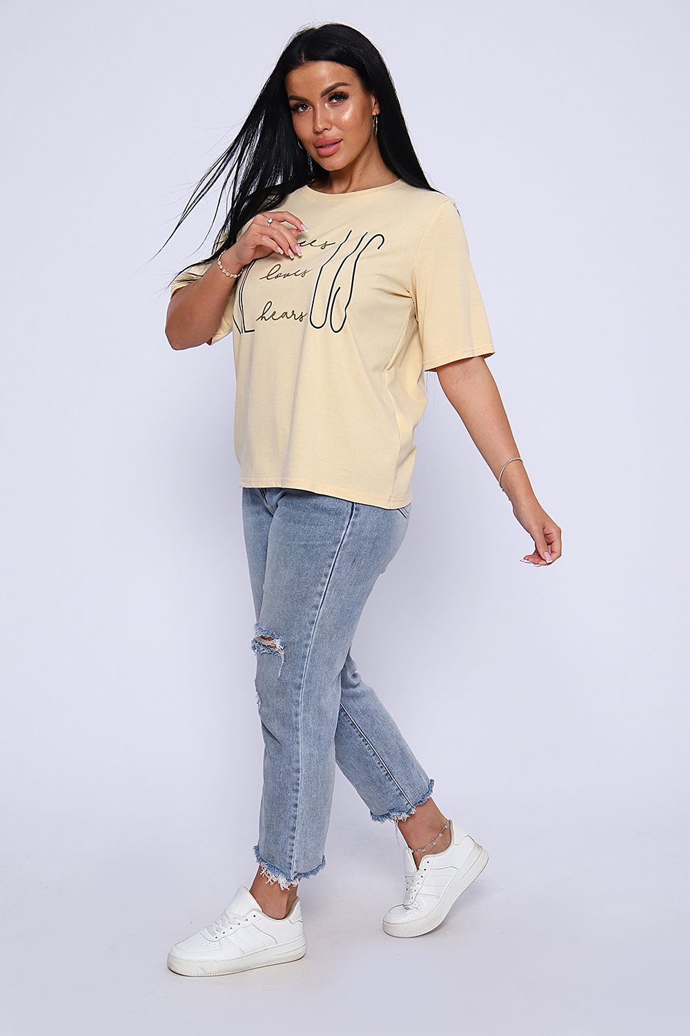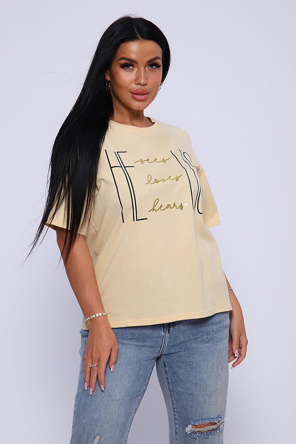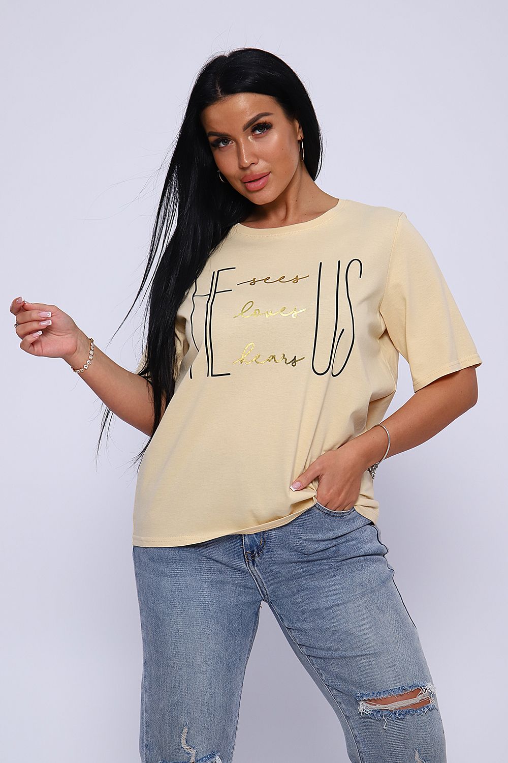 Футболка с благородным блеском золота на необыкновенно женственном принте HE US притягивает взгляд и позволяет чувствовать себя необыкновенной! Прямой силуэт, выверенная длина рукава до локтя, обработка деталей вкруговую с закрепкой. Горловина выполнена из основной ткани. Большие размеры!
