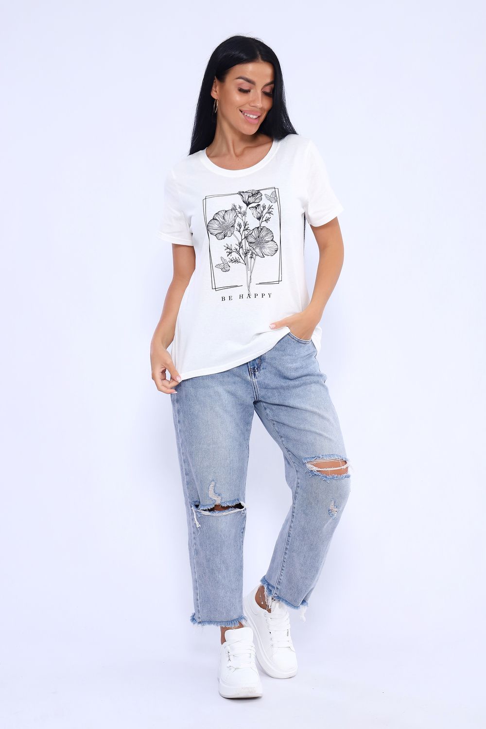 Прекрасный вариант для летнего отдыха и комфортного "лука" на каждый день! Спокойные, "летние" цвета. Футболка изготовлена из мягкого 100% хлопка. Фасон приталенный. Горловина обработана обтачкой с последующей отстрочкой. Рукава и низ изделия в подгибку.