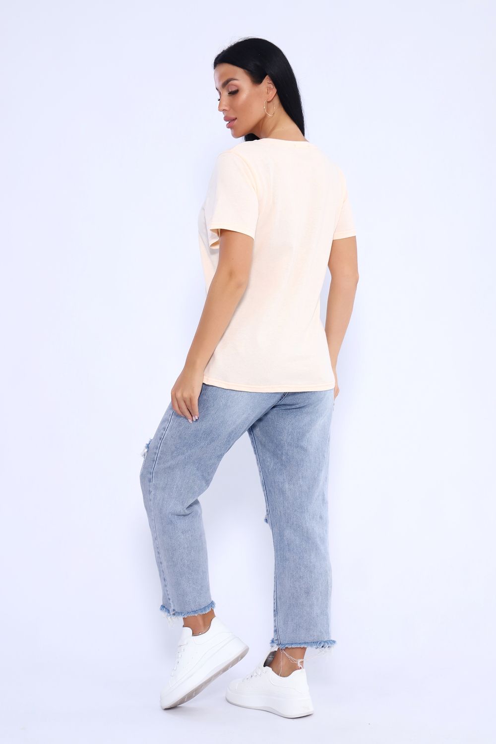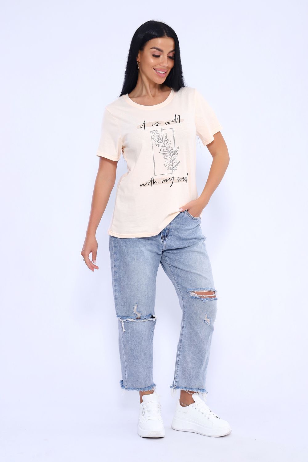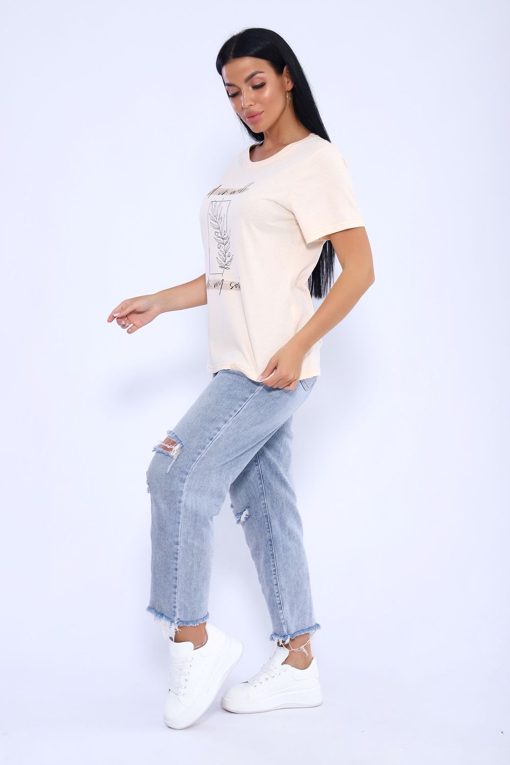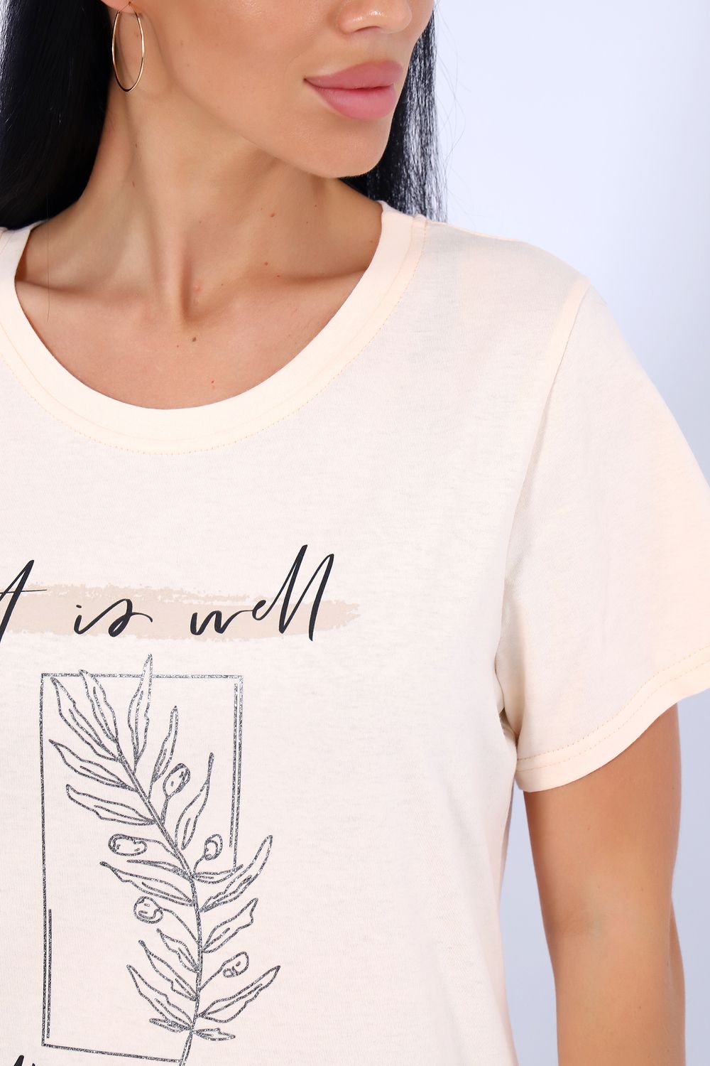 Прекрасный вариант для летнего отдыха и комфортного "лука" на каждый день! Нежные, пастельные расцветки и принт с "французским блеском" придают стиль и шарм. Футболка изготовлена из мягкого 100% хлопка. Фасон приталенный. Горловина обработана обтачкой с последующей отстрочкой. Рукава и низ изделия в подгибку.