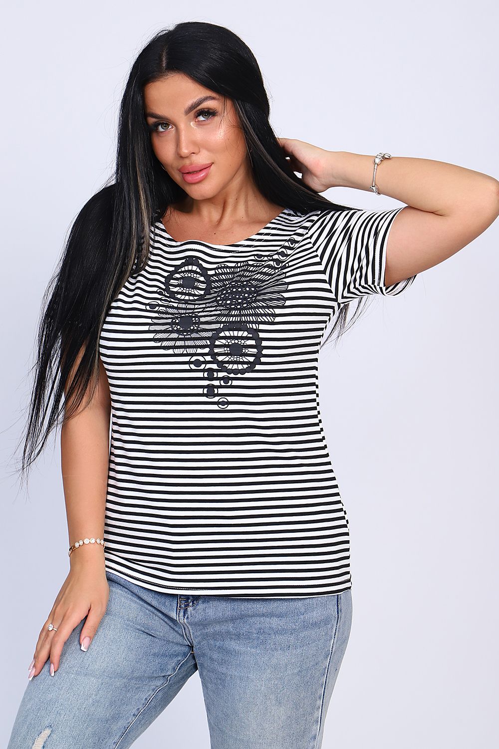 Стильная женская футболка из вискозы в полоску - настоящая находка для модниц, любящих комфорт и красивый вид. Модель с круглым вырезом горловины и коротким рукавом , слегка приталенного силуэта красиво подчеркнет изгибы фигуры и сделает вас женственной в любом наряде: в дерзком молодежном или сдержанном классическом. Футболку украшает изящный рисунок-цветок, что делает ее неповторимой и оригинальной. Универасальная модель женской футболки на каждый день способна стать частью офисного, нарядного, вечернего и повседневного образа.