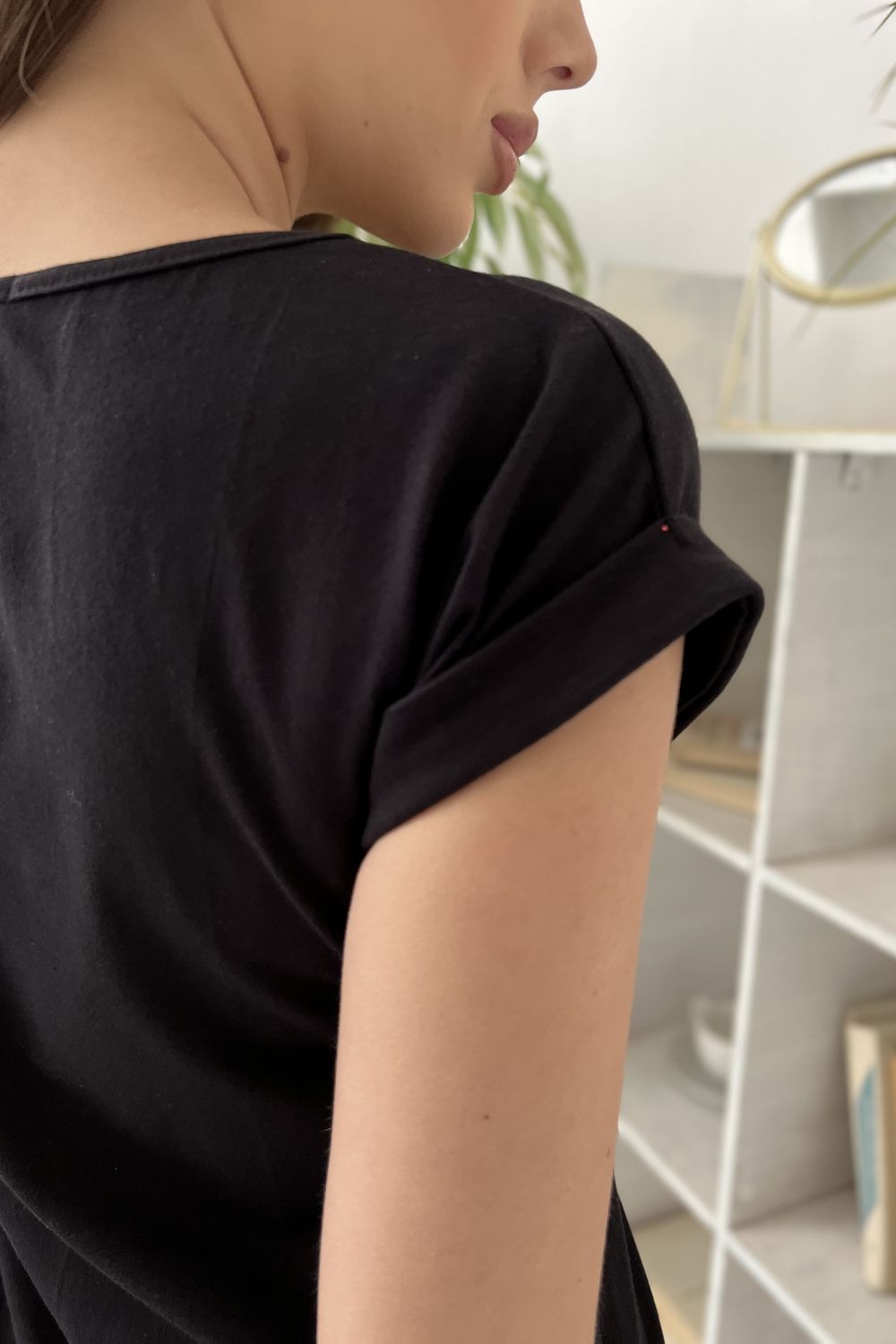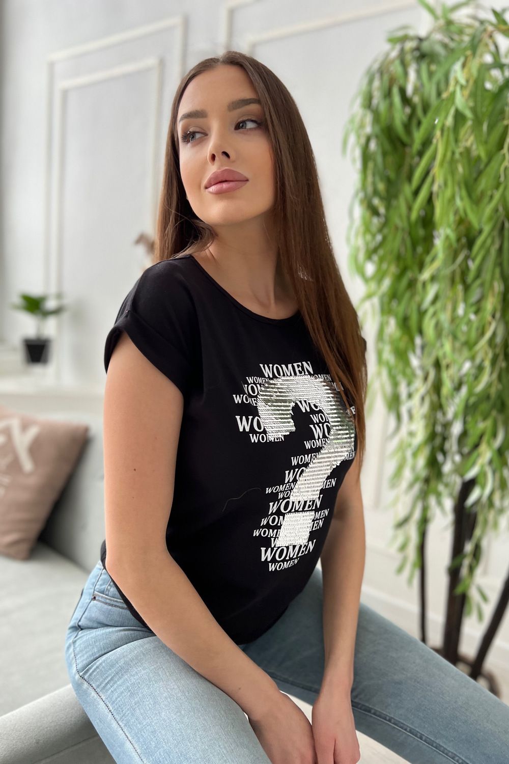Футболка полуприлегающего силуэта, средней длины, с округлой горловиной. Рукав цельнокроеный, короткий, на манжете с отворотом. На полочке эффектная печать с аппликацией из пайеток