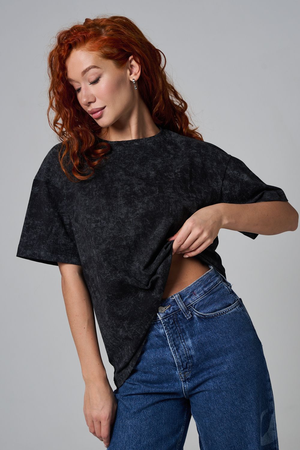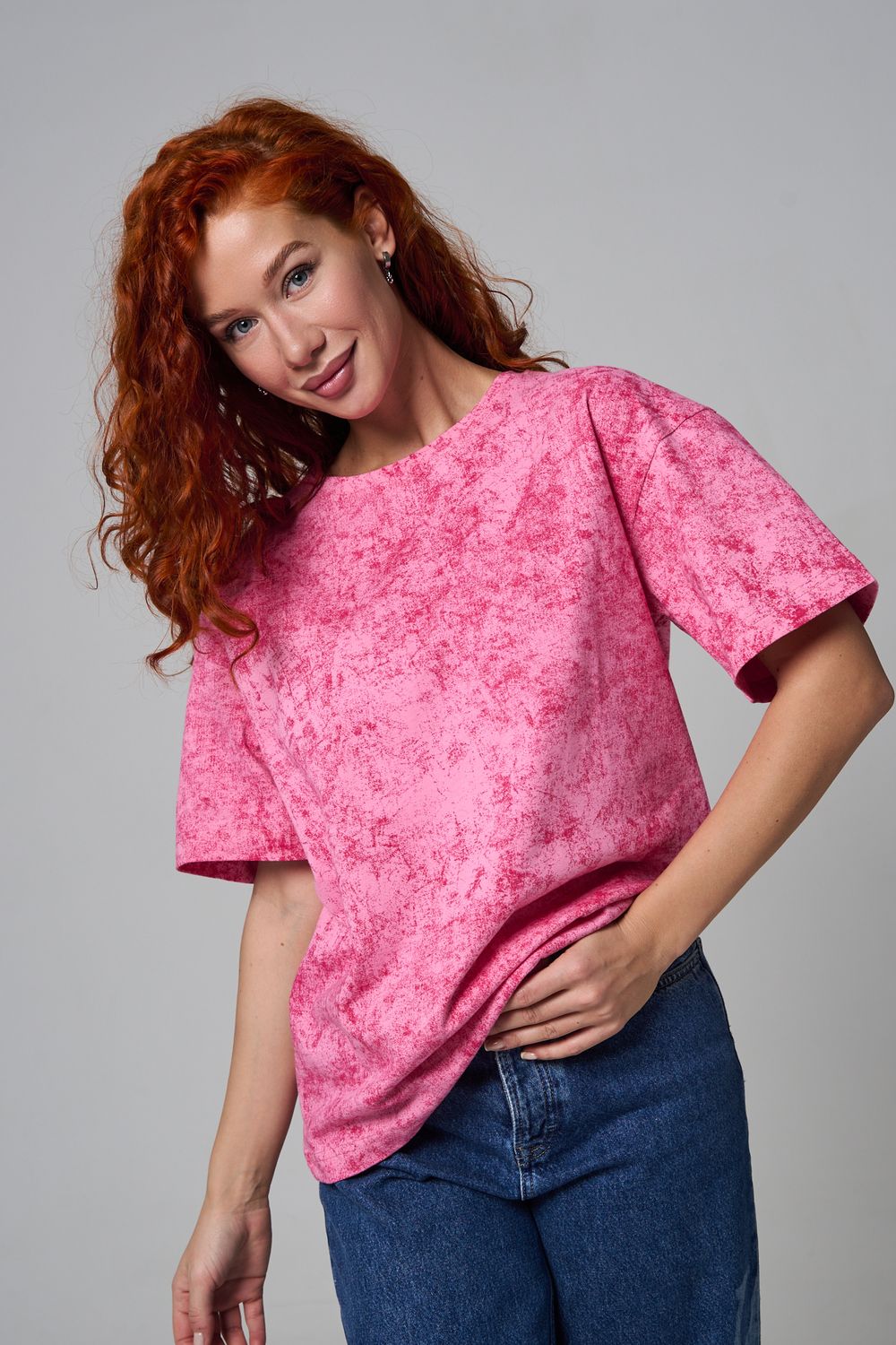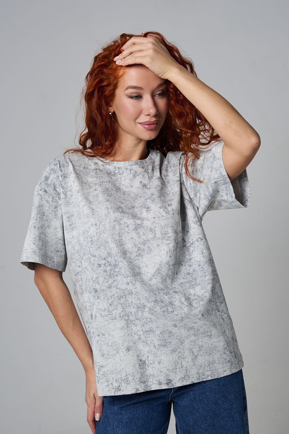 Футболка прямого силуэта, с округлой горловиной, длиной до середины бедра. Рукав втачной, короткий. Горловина обработана бейкой из основного полотна. На полочке эффектная переливающаяся аппликация с пайетками