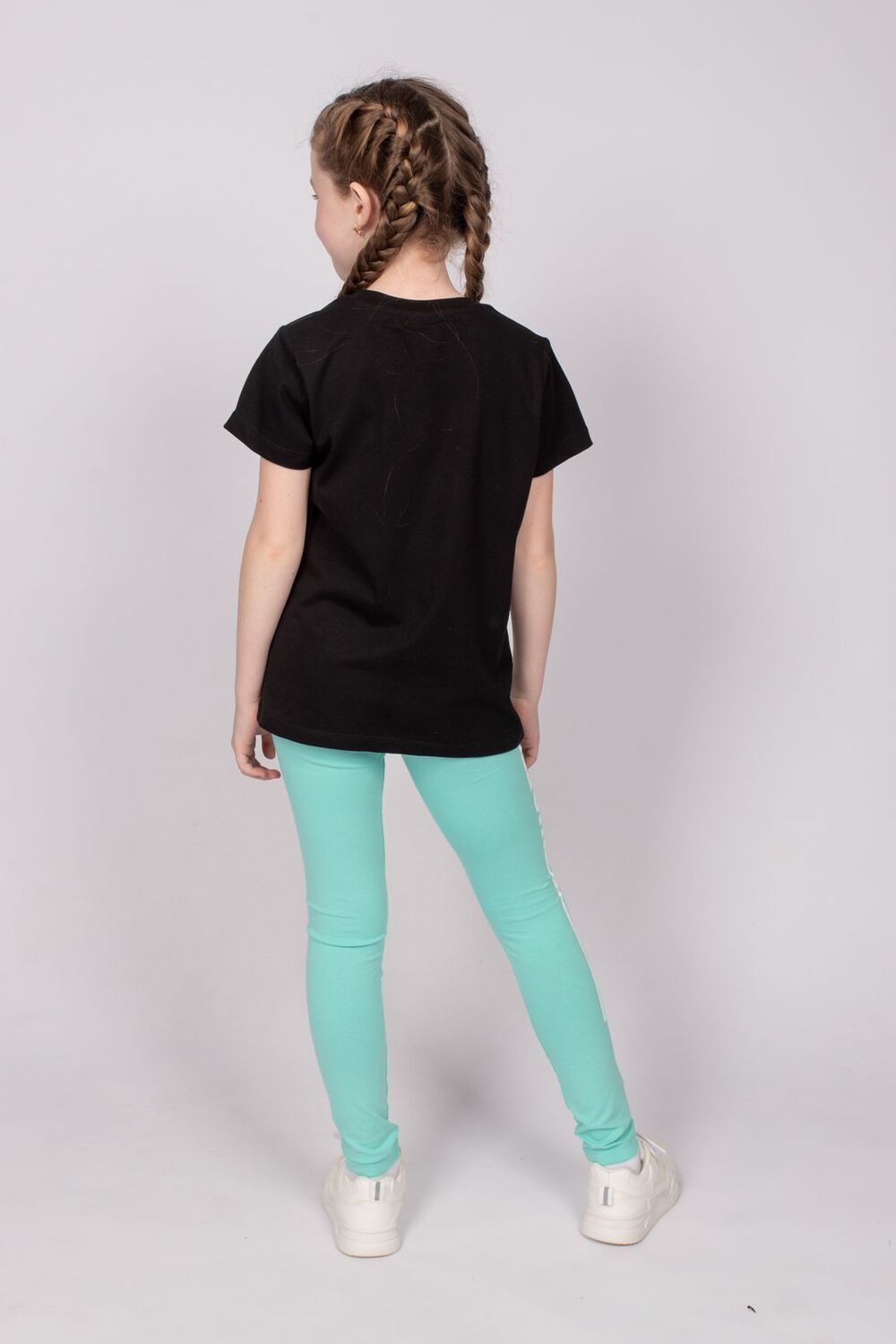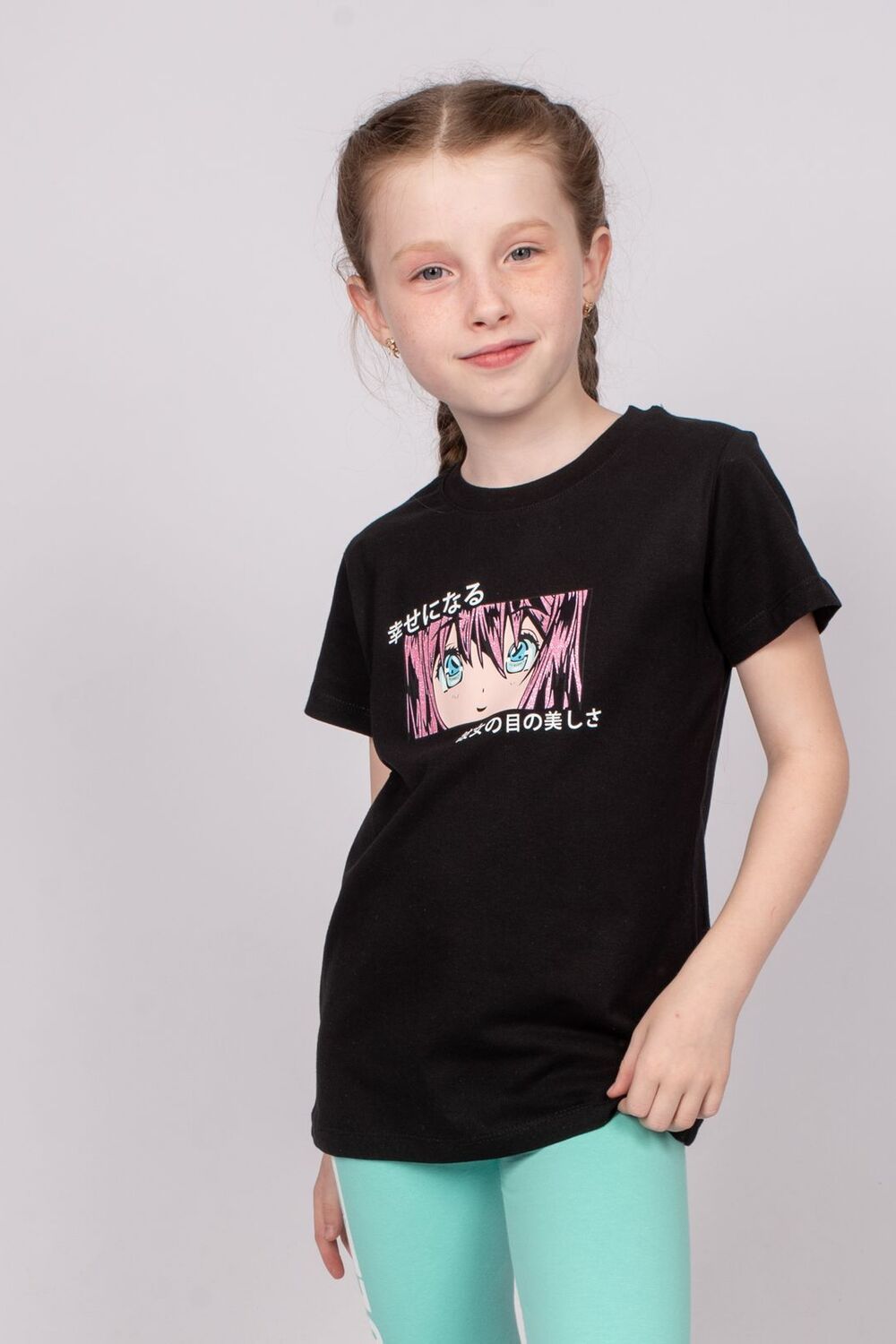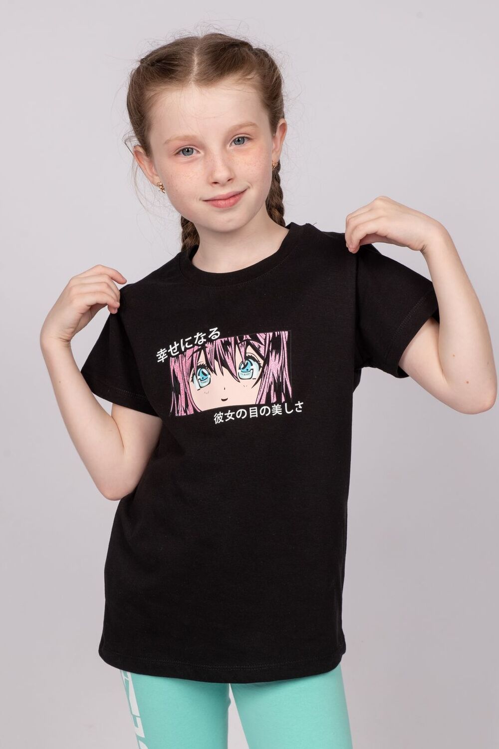Футболка для девочки прямого силуэта, с втачным коротким рукавом. Горловина круглая, обработана воротником из рибаны. По горловине полочки отделочная строчка. Низ изделия и рукава обработан швом вподгибку. На полочке принт Шелкография с глиттером. Надпись переводится как "Будь счастлива, красота в её глазах".