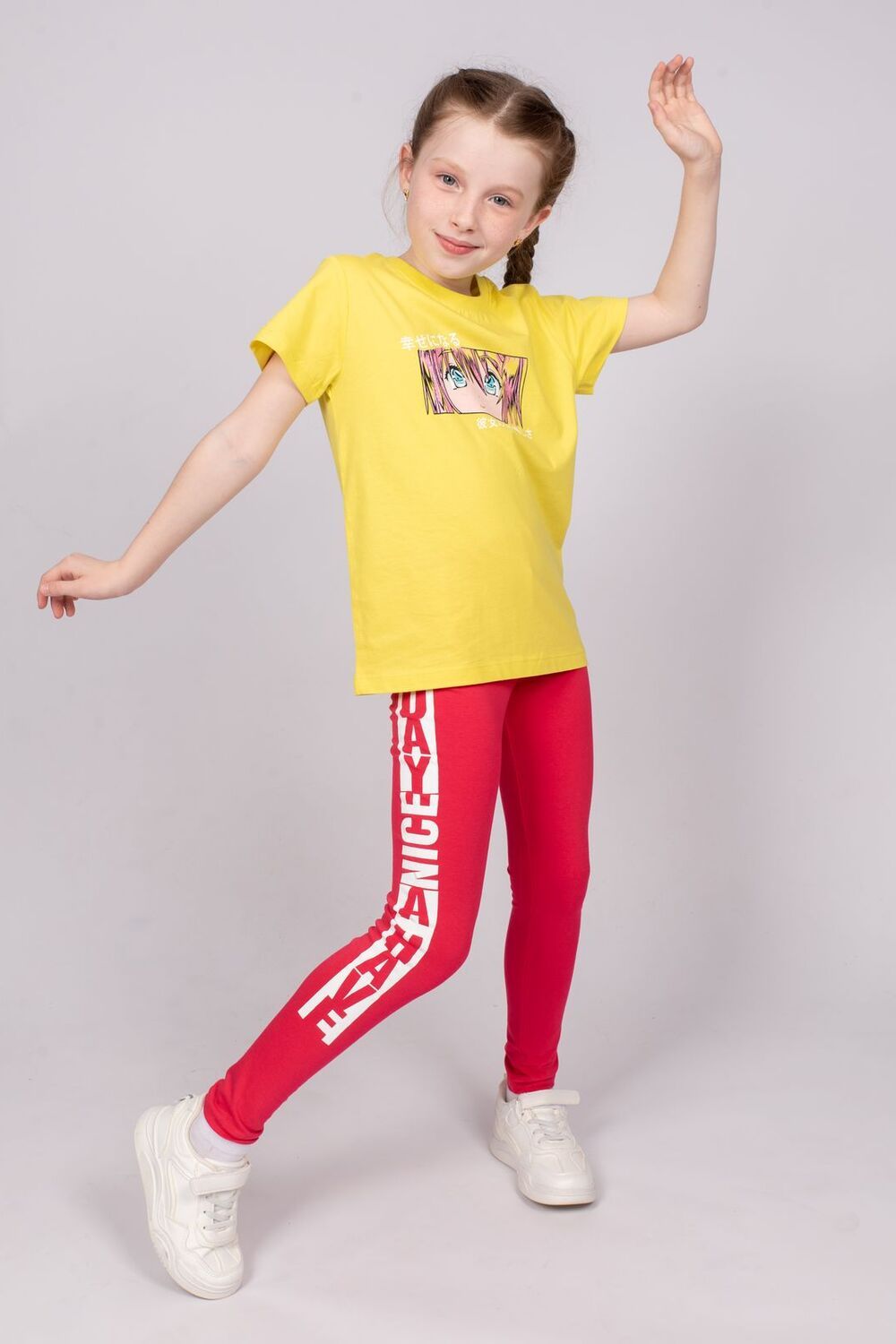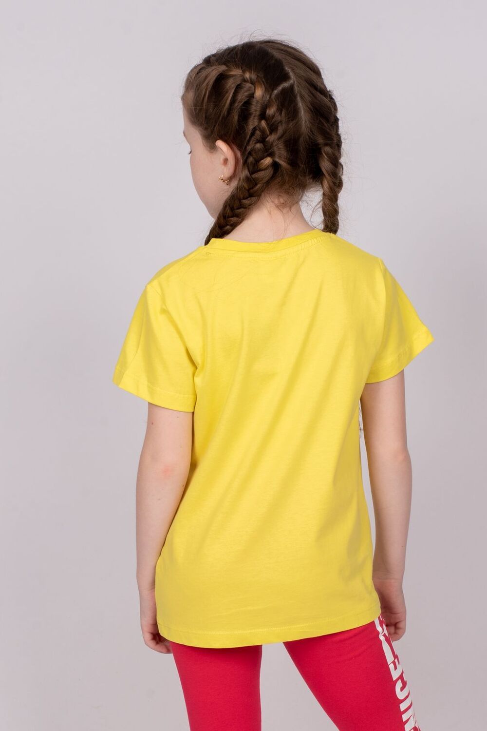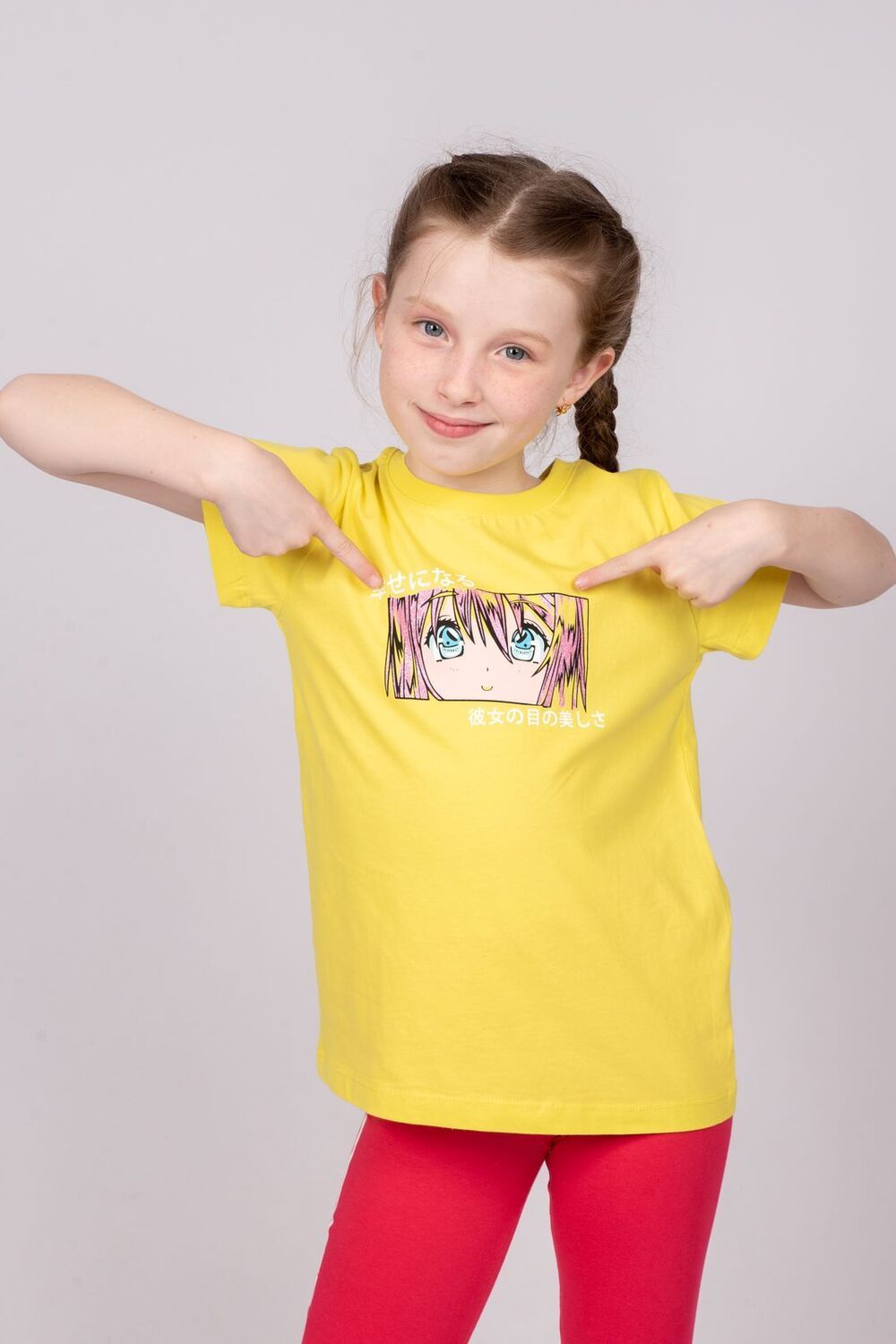 Футболка для девочки прямого силуэта, с втачным коротким рукавом. Горловина круглая, обработана воротником из рибаны. По горловине полочки отделочная строчка. Низ изделия и рукава обработан швом вподгибку. На полочке принт Шелкография с глиттером. Надпись переводится как "Будь счастлива, красота в её глазах".