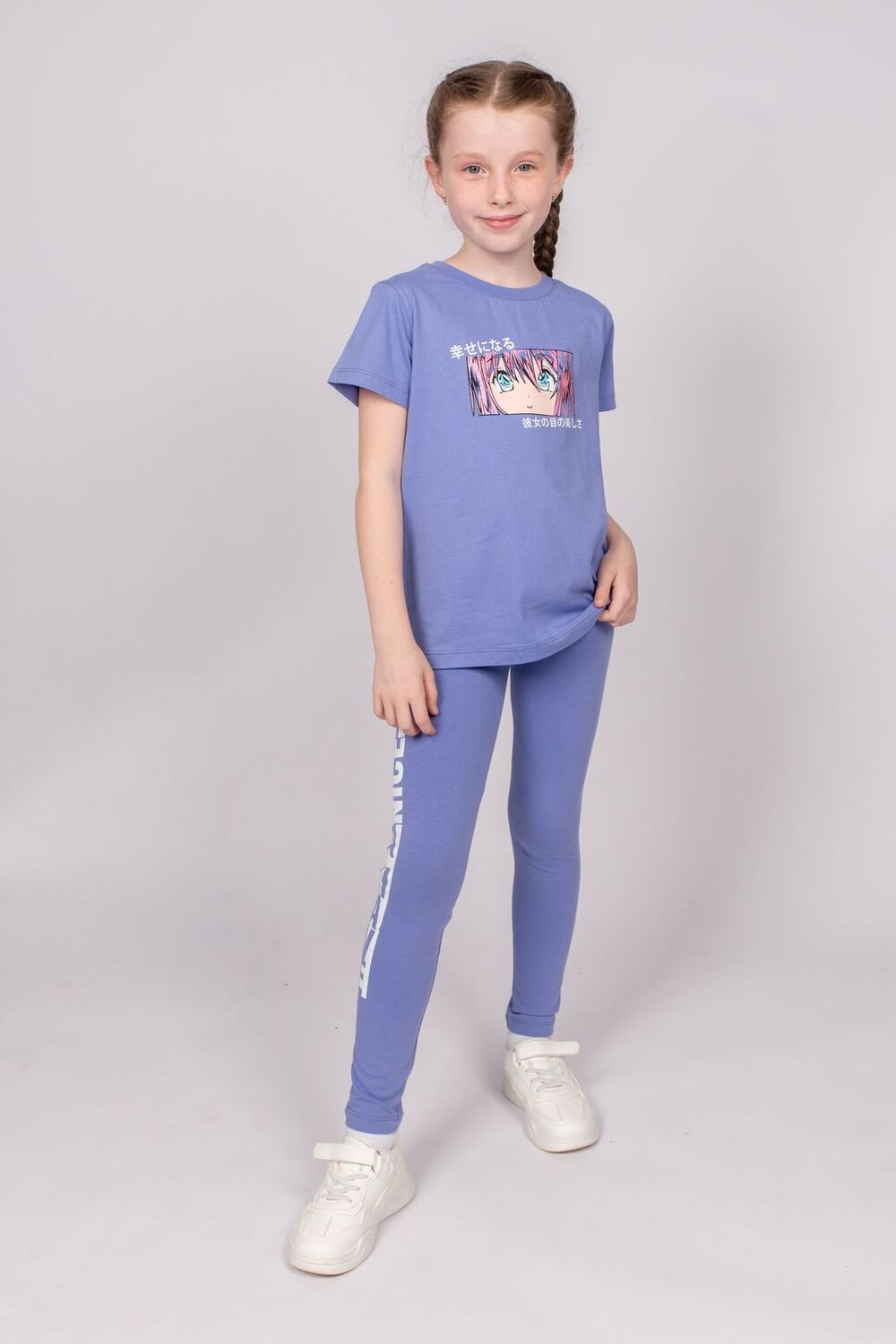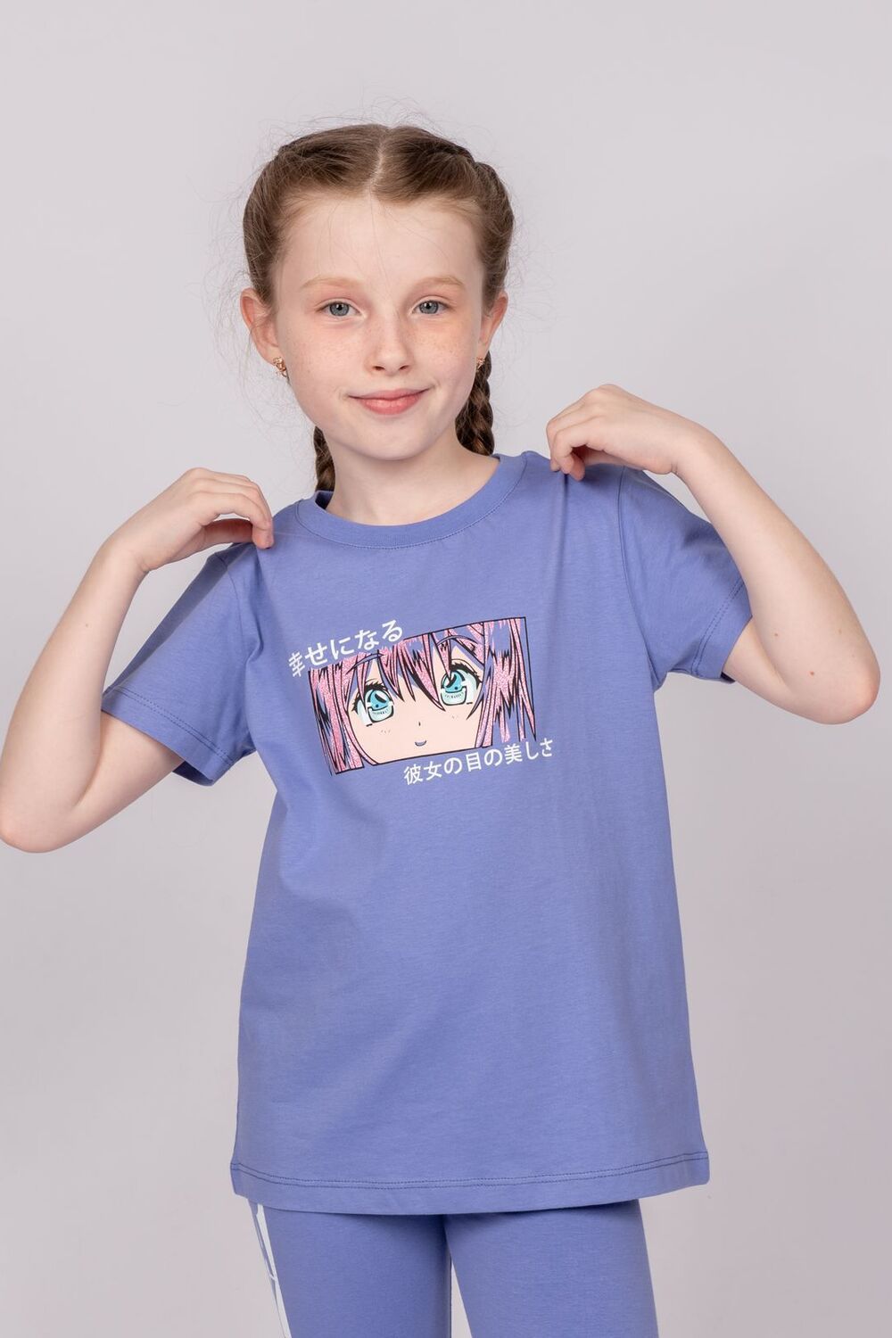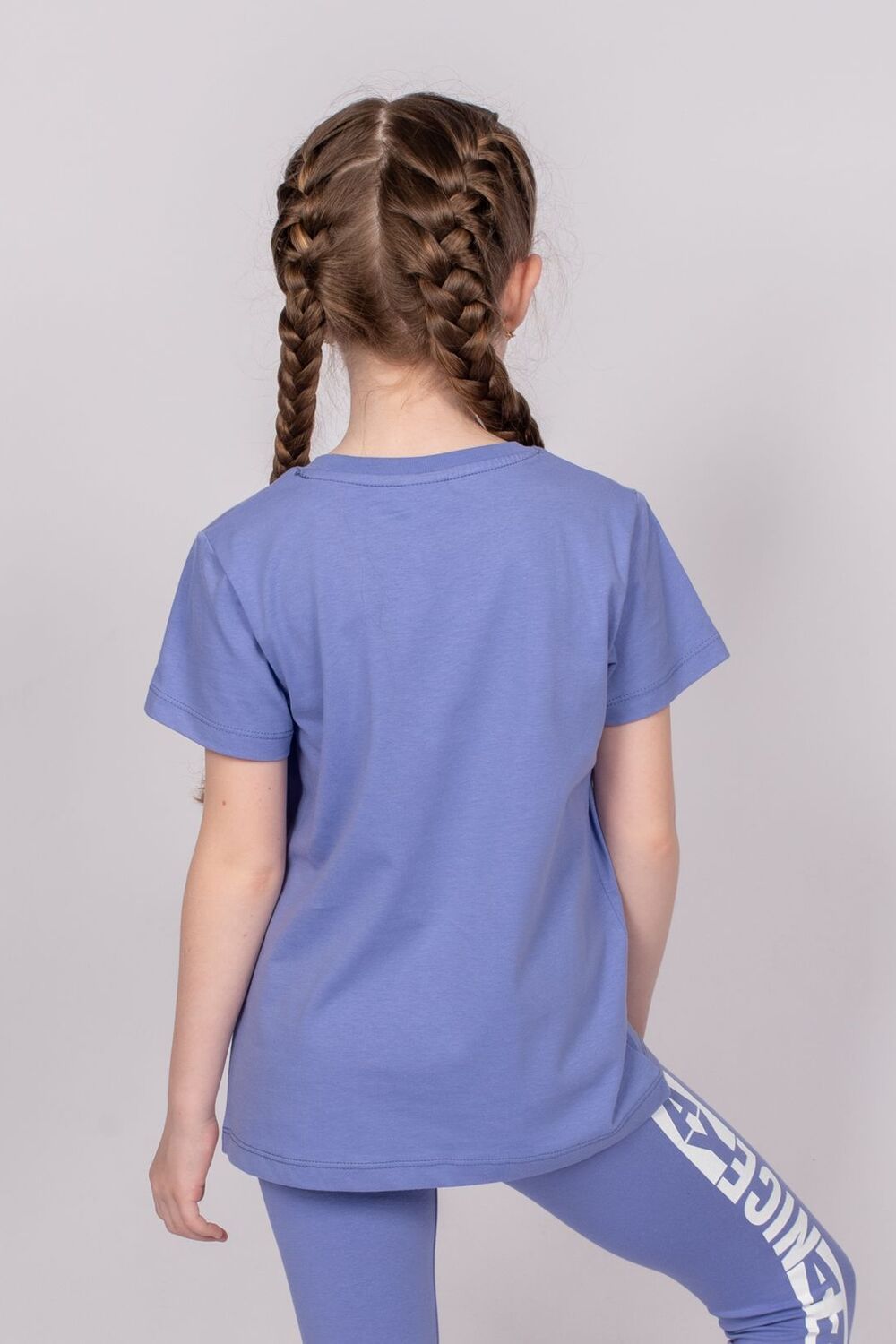 Футболка для девочки прямого силуэта, с втачным коротким рукавом. Горловина круглая, обработана воротником из рибаны. По горловине полочки отделочная строчка. Низ изделия и рукава обработан швом вподгибку. На полочке принт Шелкография с глиттером. Надпись переводится как "Будь счастлива, красота в её глазах".