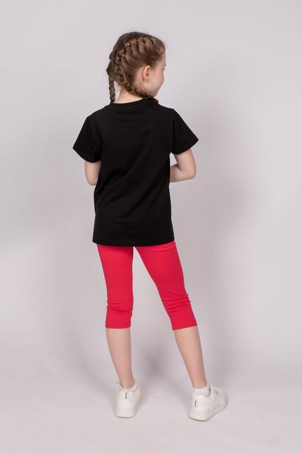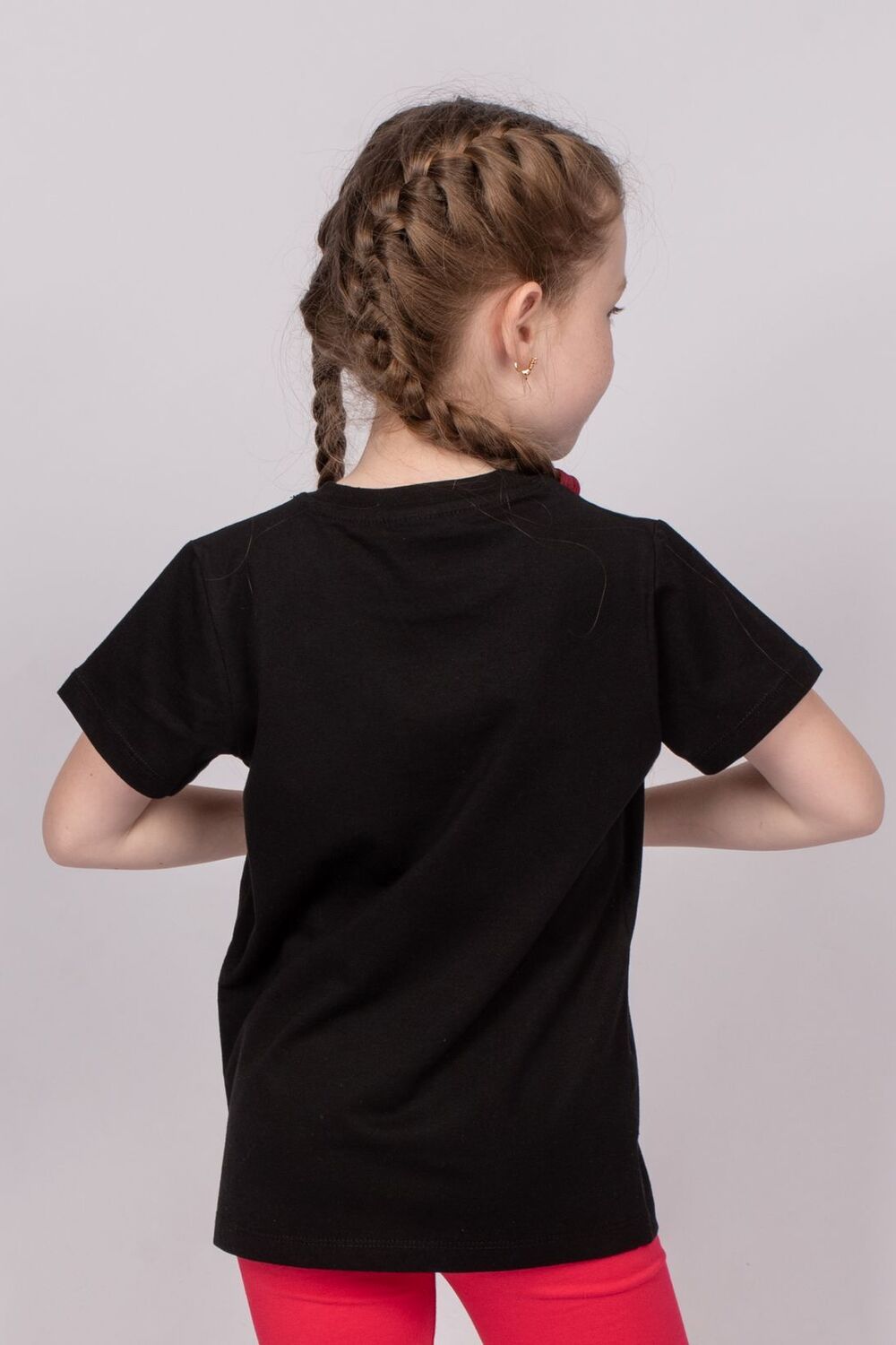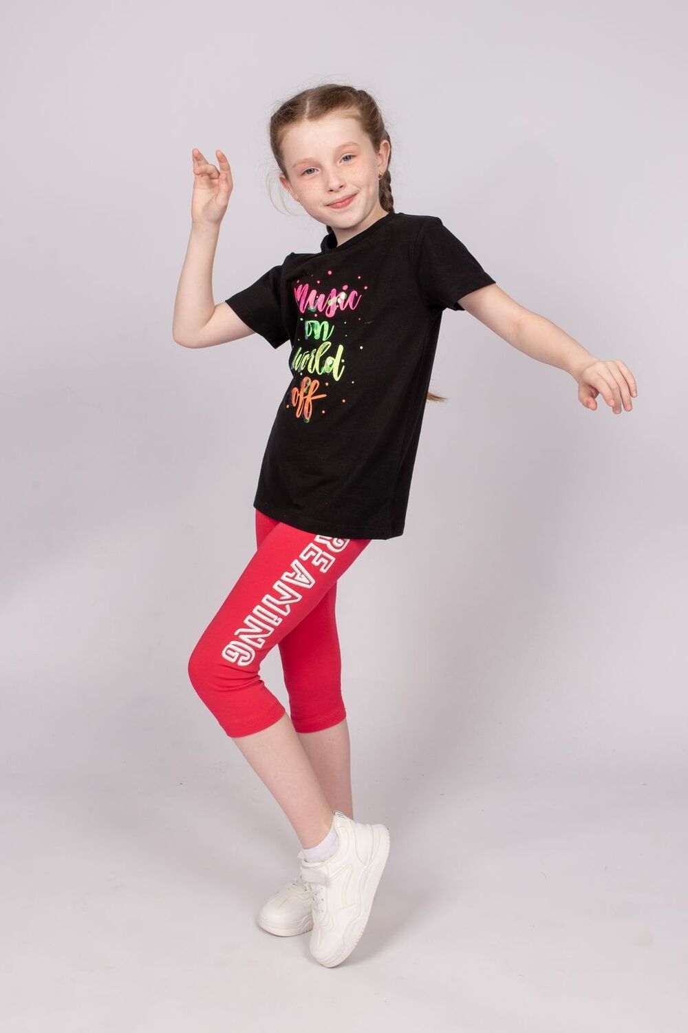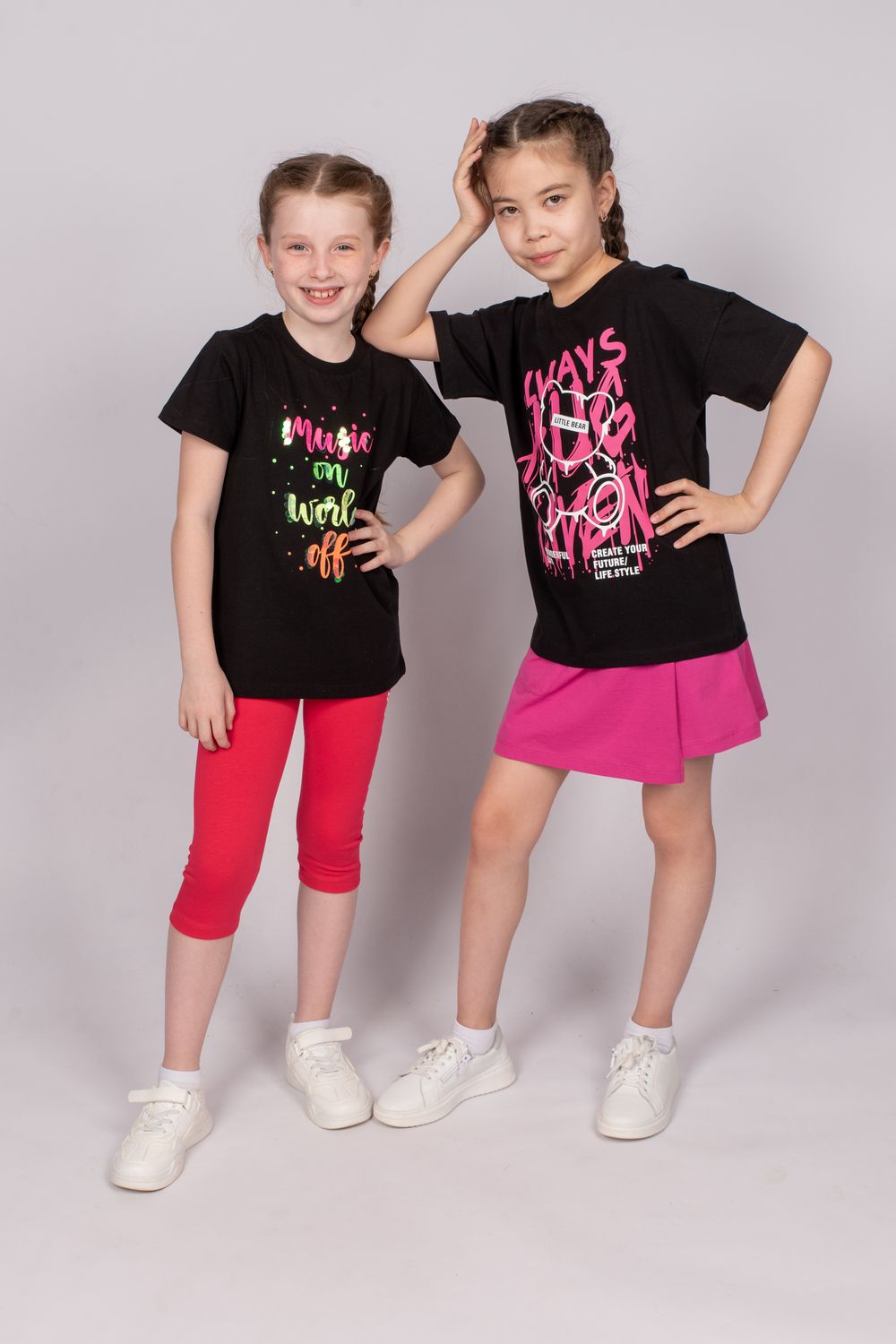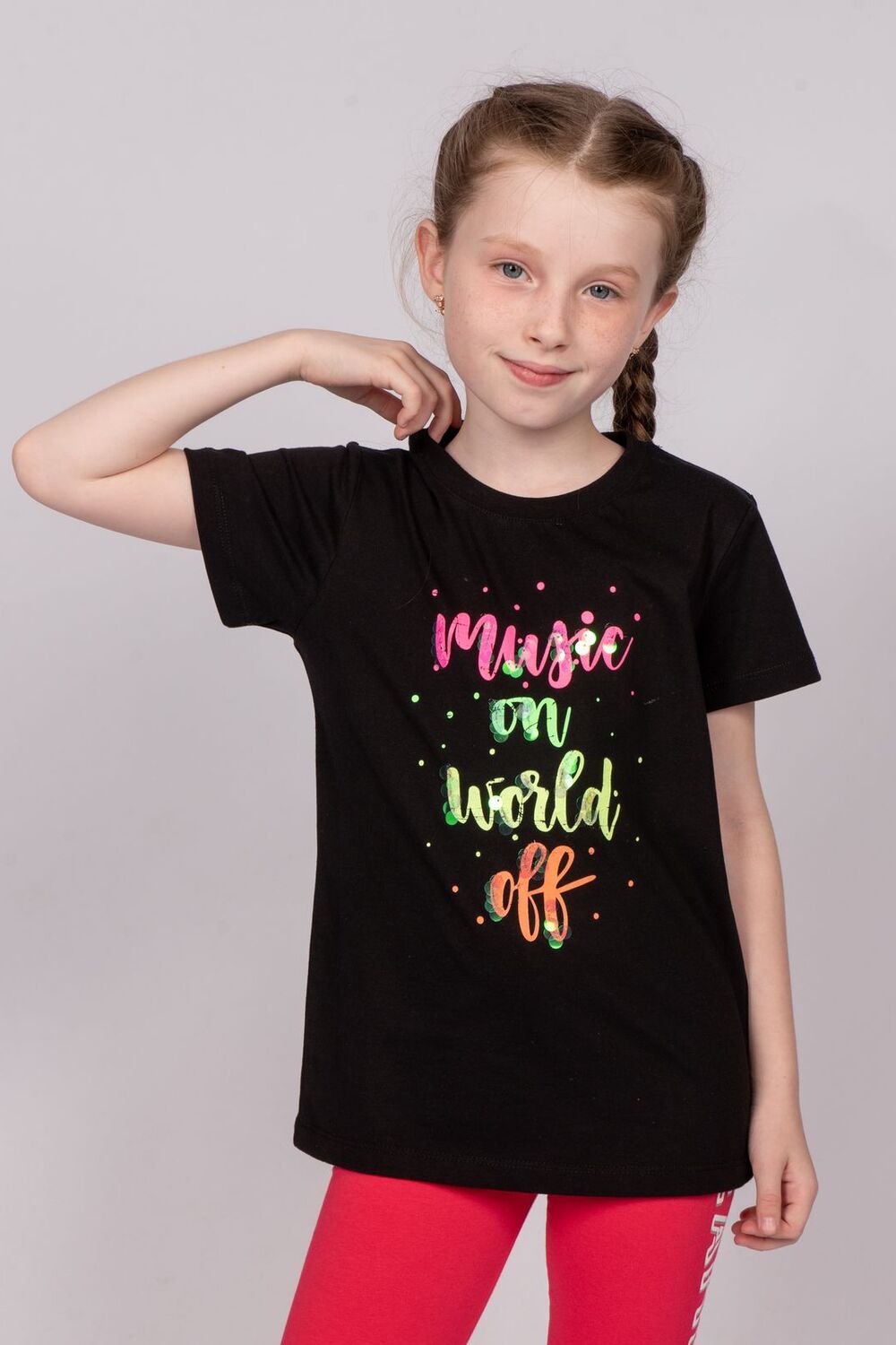 Футболка для девочки прямого силуэта, с втачным коротким рукавом. Горловина круглая, обработана воротником из рибаны. По горловине полочки отделочная строчка. Низ изделия и рукава обработан швом вподгибку. На полочке принт Шелкография с пайетками. Надпись переводится как "Музыка в выключенном мире".