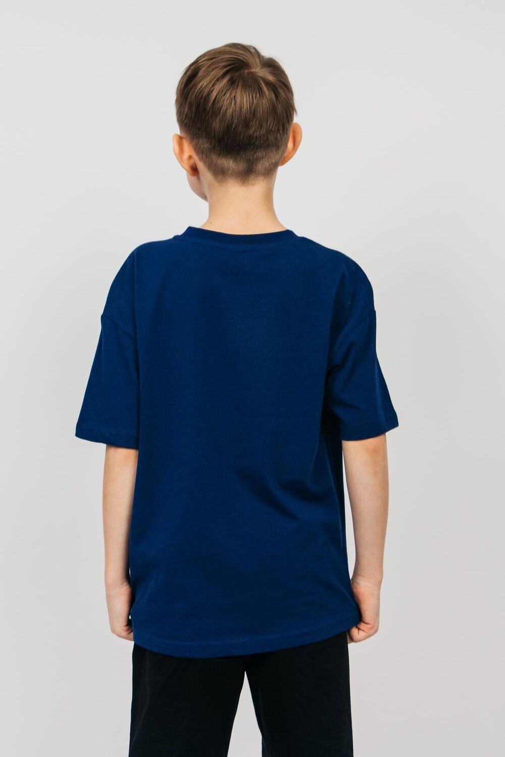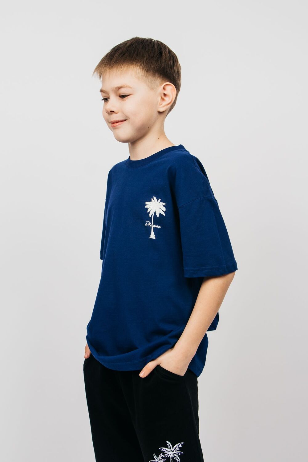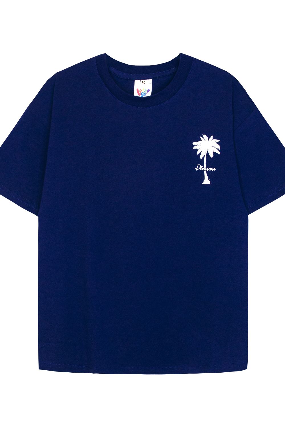 Футболка для мальчика свободного силуэта (оверсайз) с коротким рукавом. Горловина круглая, обработана воротником из рибаны. Горловина спинки внутри укреплена бейкой из кулирки. Низ изделия и рукава обработан швом вподгибку. На полочке принт со вспенкой. Надпись переводится как "Удовольствие; Наслаждение".