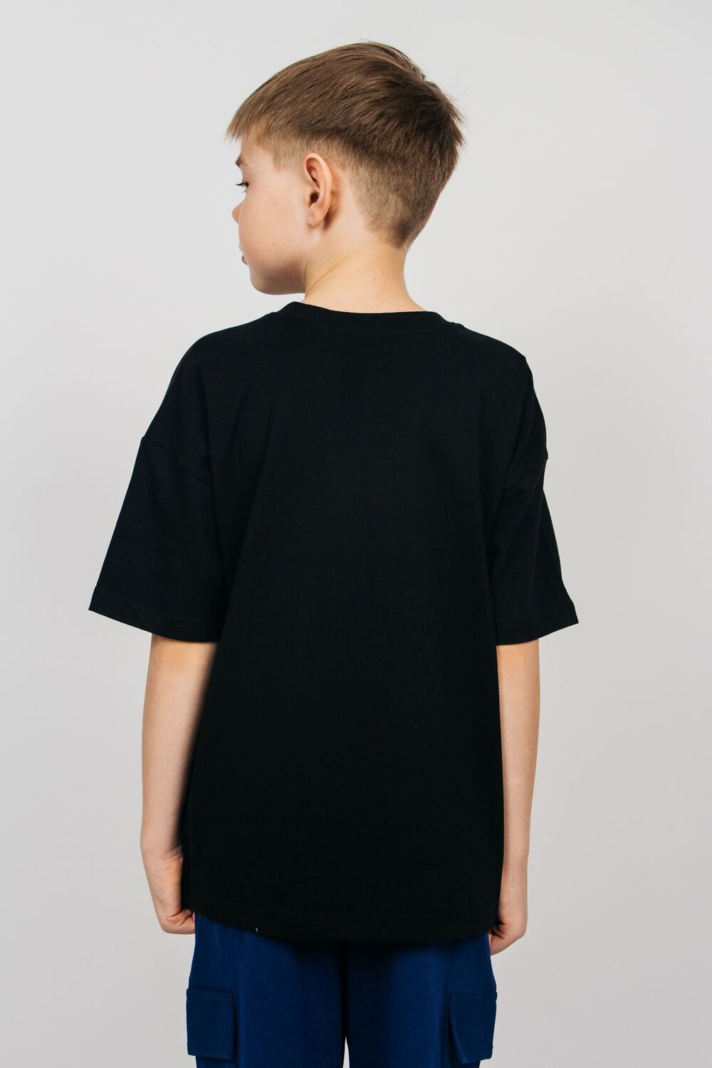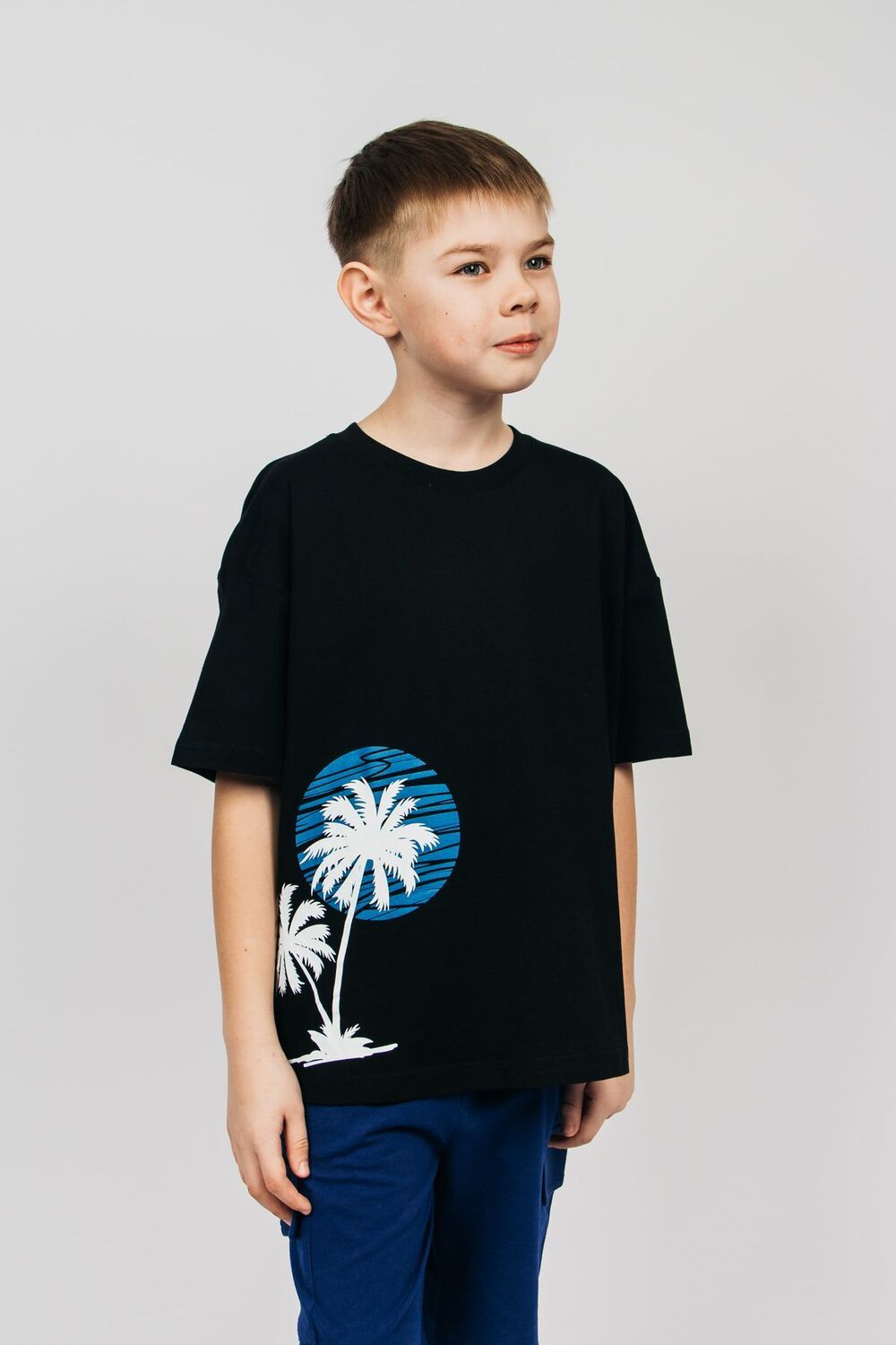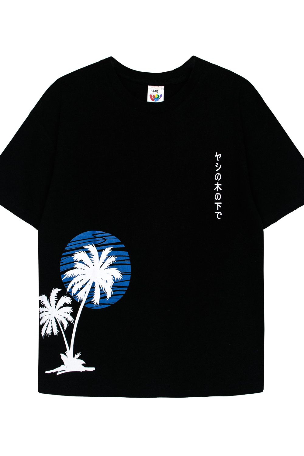 Футболка для мальчика свободного силуэта (оверсайз) с коротким рукавом. Горловина круглая, обработана воротником из рибаны. Низ изделия и рукава обработан швом вподгибку. На полочке принт шелкография. Надпись переводится как "Под пальмой".