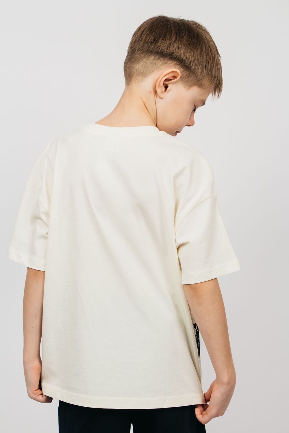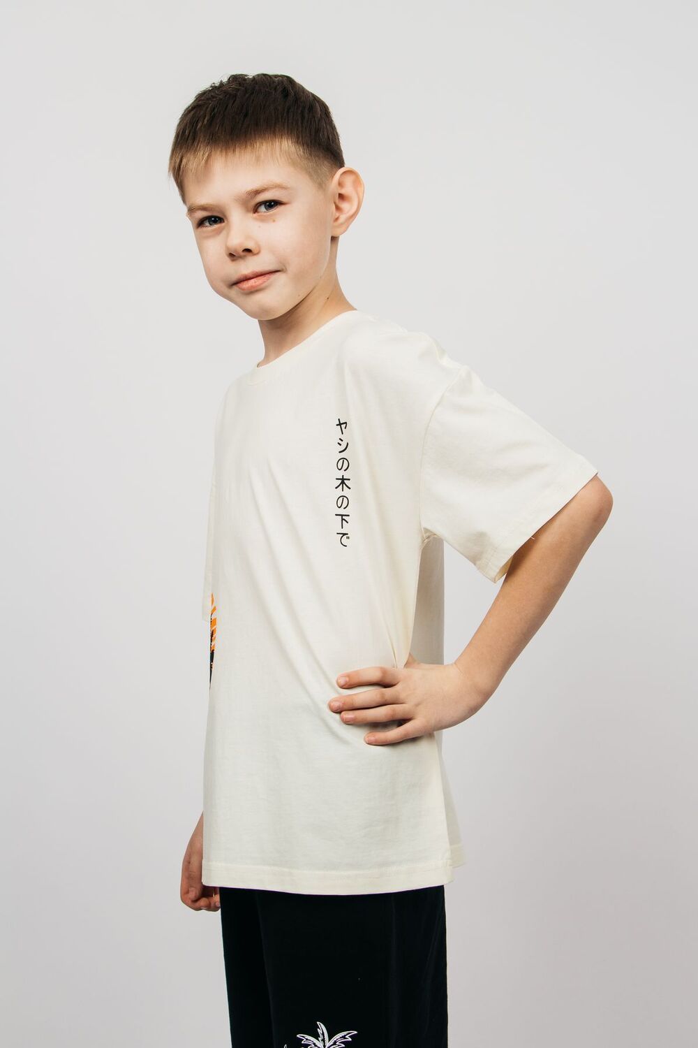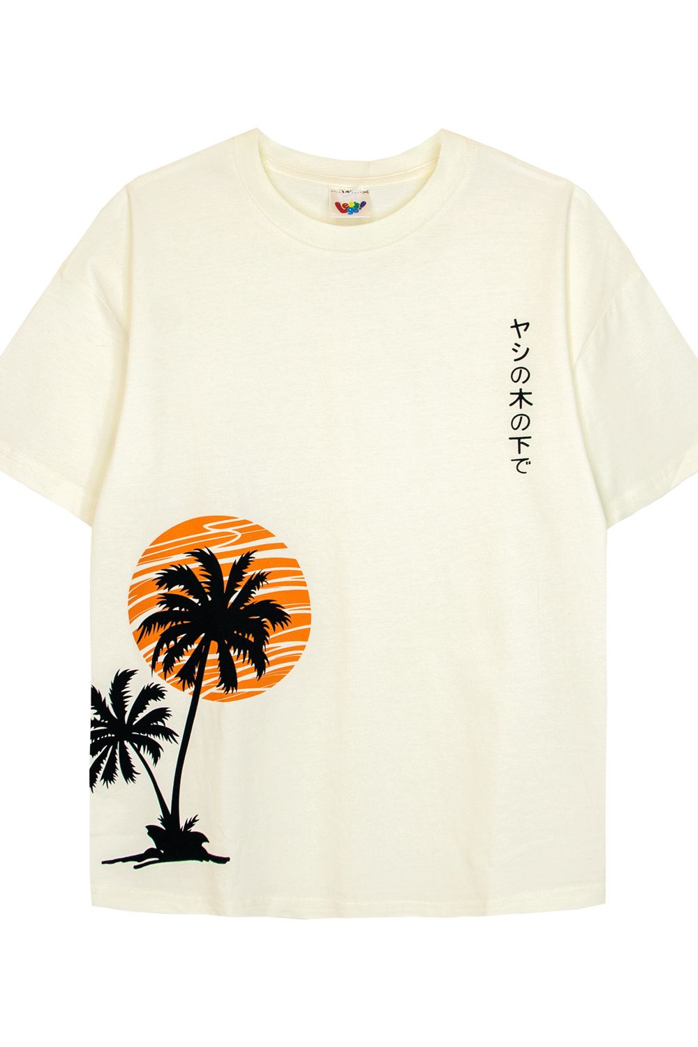 Футболка для мальчика свободного силуэта (оверсайз) с коротким рукавом. Горловина круглая, обработана воротником из рибаны. Низ изделия и рукава обработан швом вподгибку. На полочке принт шелкография. Надпись переводится как "Под пальмой".