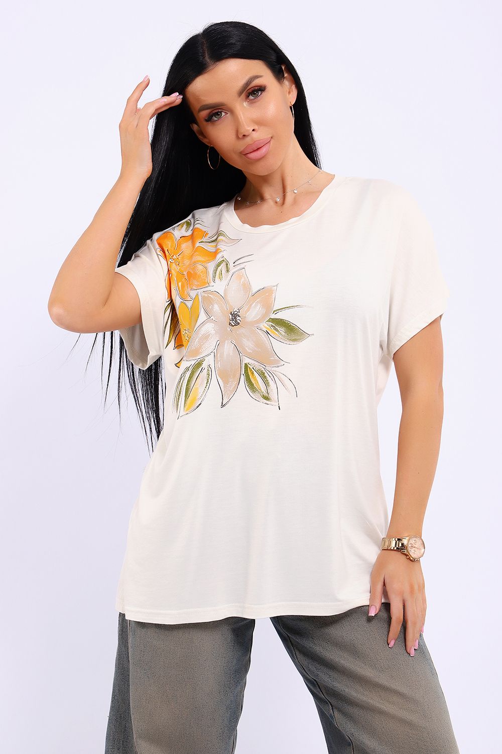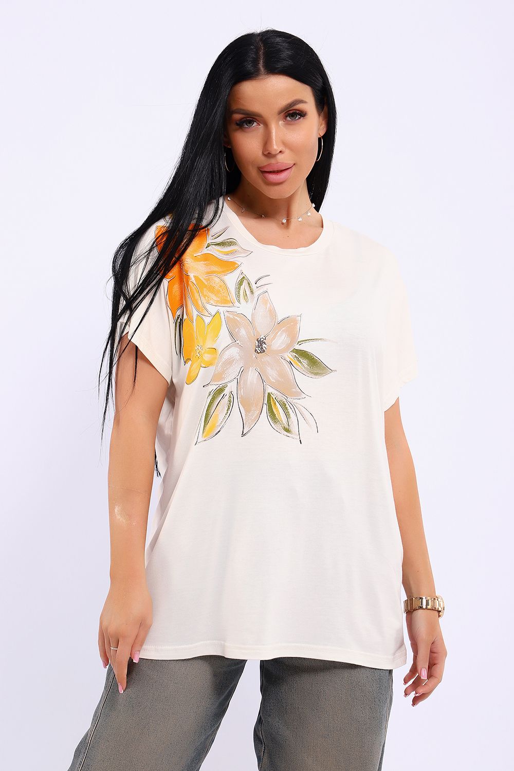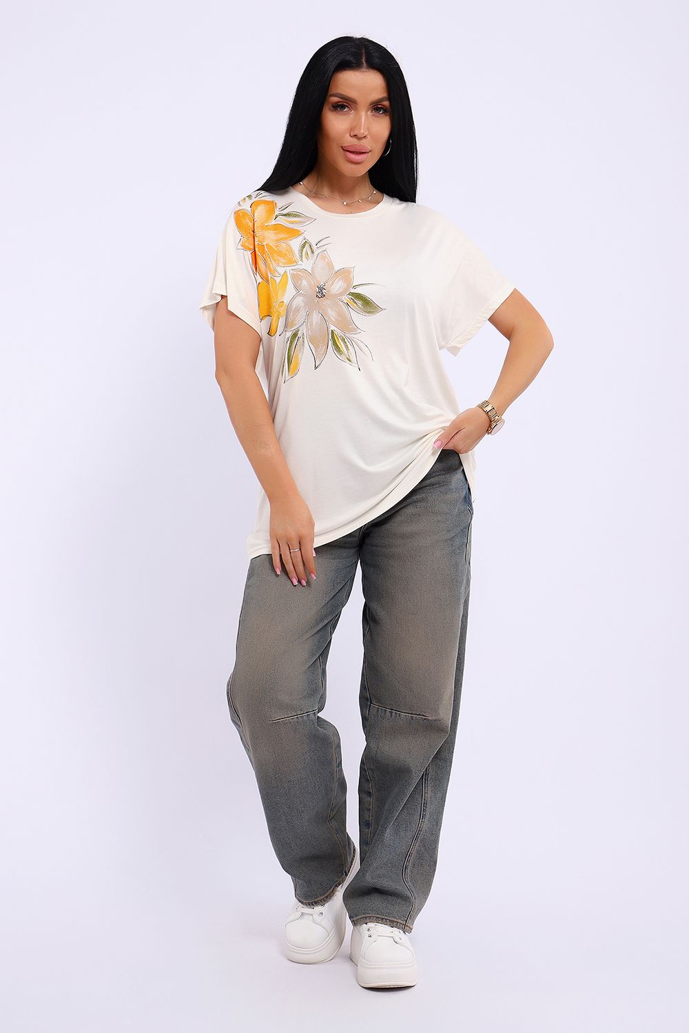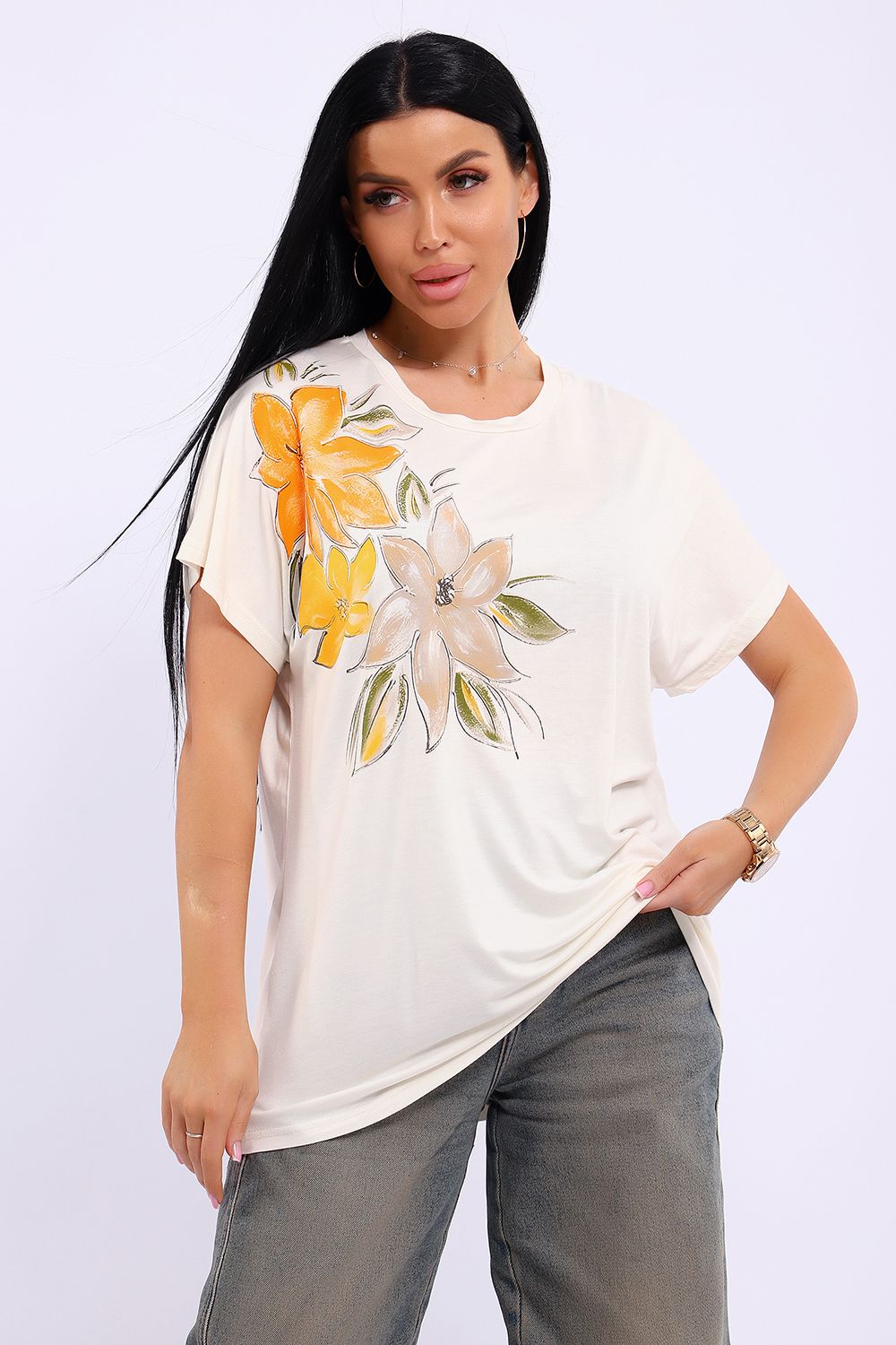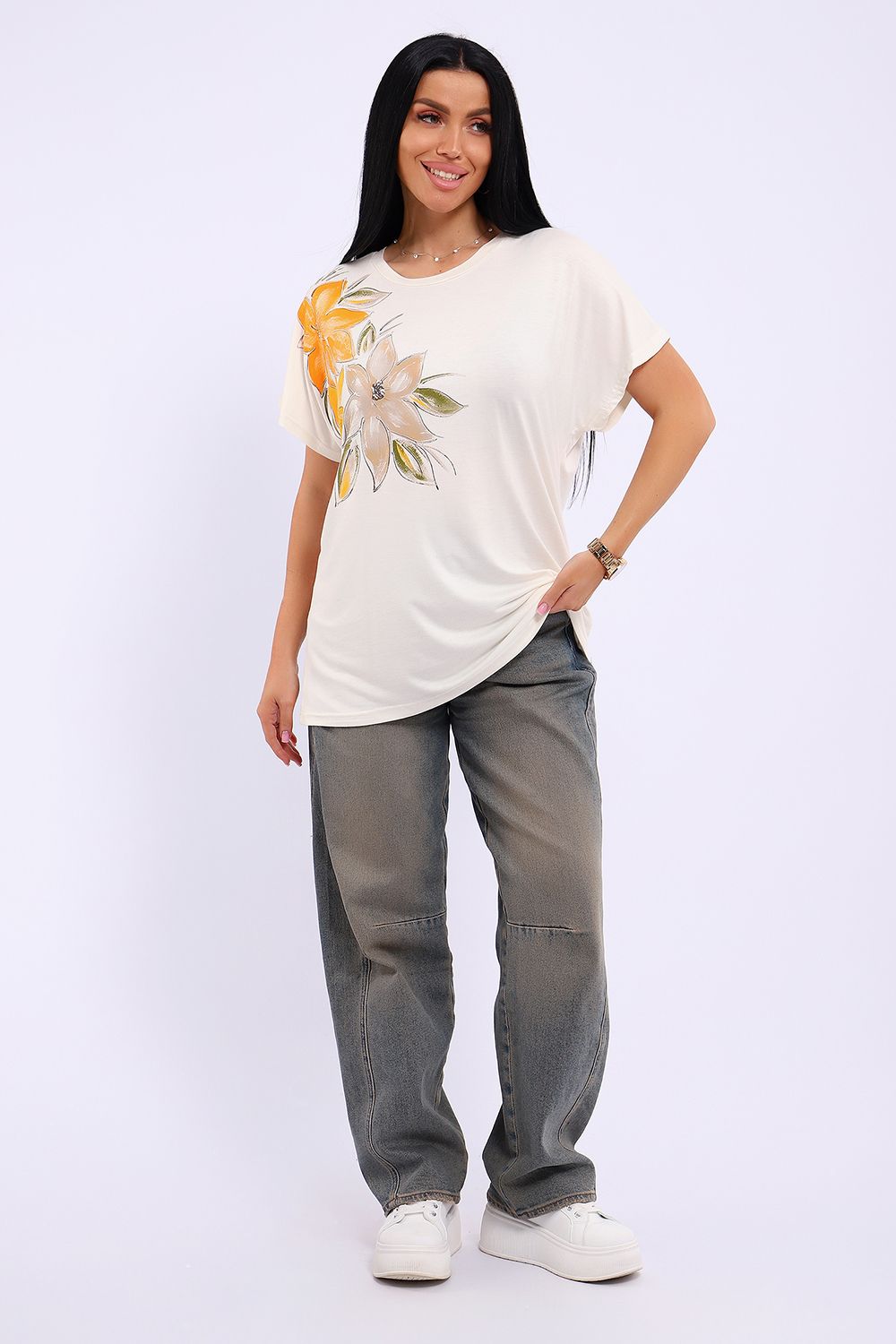 Вискозная, нежного молочного оттенка футболка, украшенная крупным цветочным принтом, расположенным ассиметрично - незаменимая вещь летнего гардероба! Футболка довольно универсальна, она будет уместна, как на прогулке, так и ф офисе или на прогулке. Свободный крой позволит ощущать себя комфортно в любую погоду, а также скроет все недостатки.