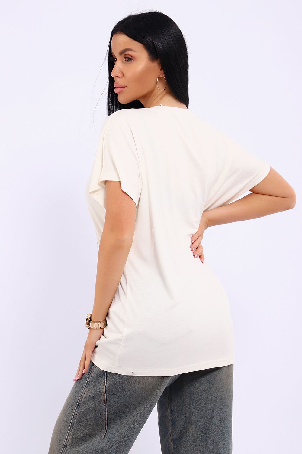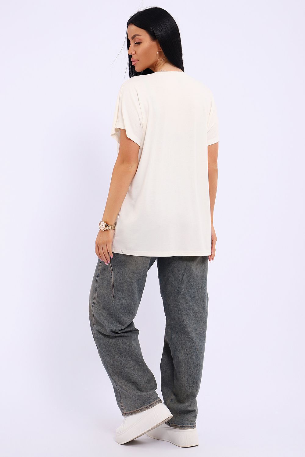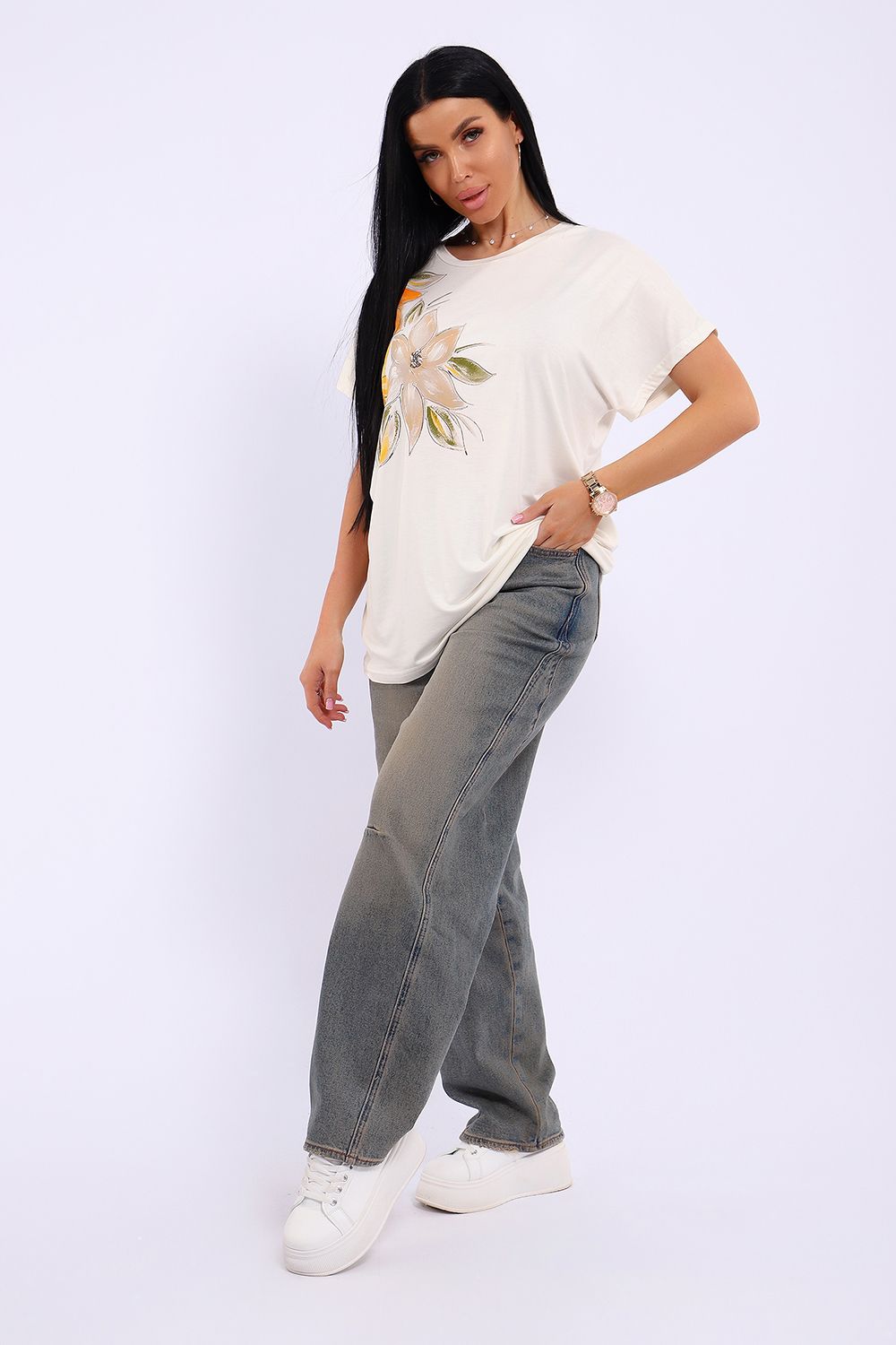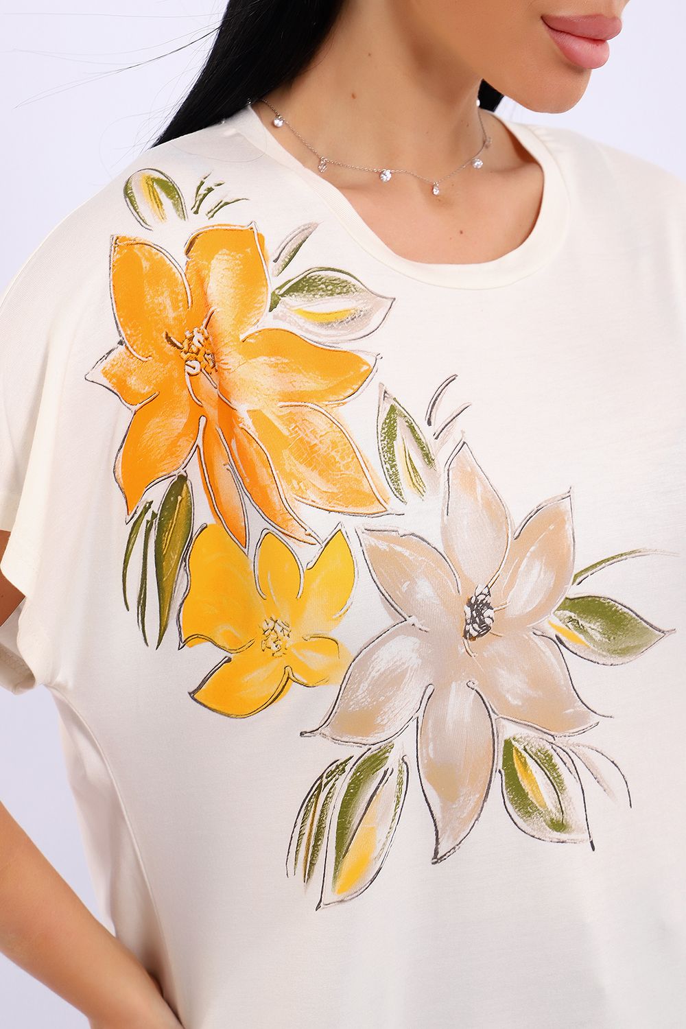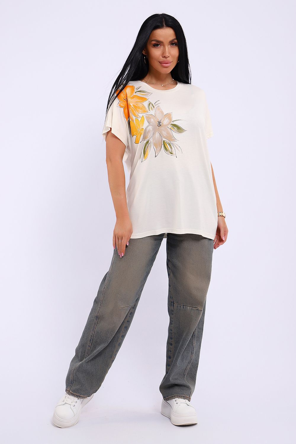 Вискозная, нежного молочного оттенка футболка, украшенная крупным цветочным принтом, расположенным ассиметрично - незаменимая вещь летнего гардероба! Футболка довольно универсальна, она будет уместна, как на прогулке, так и ф офисе или на прогулке. Свободный крой позволит ощущать себя комфортно в любую погоду, а также скроет все недостатки.