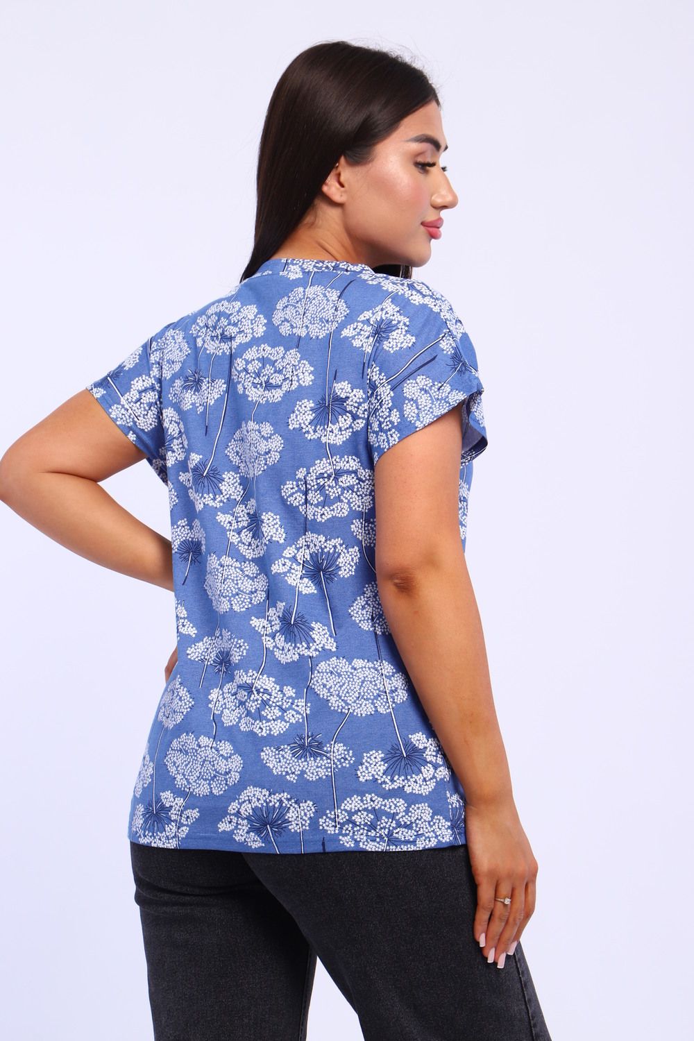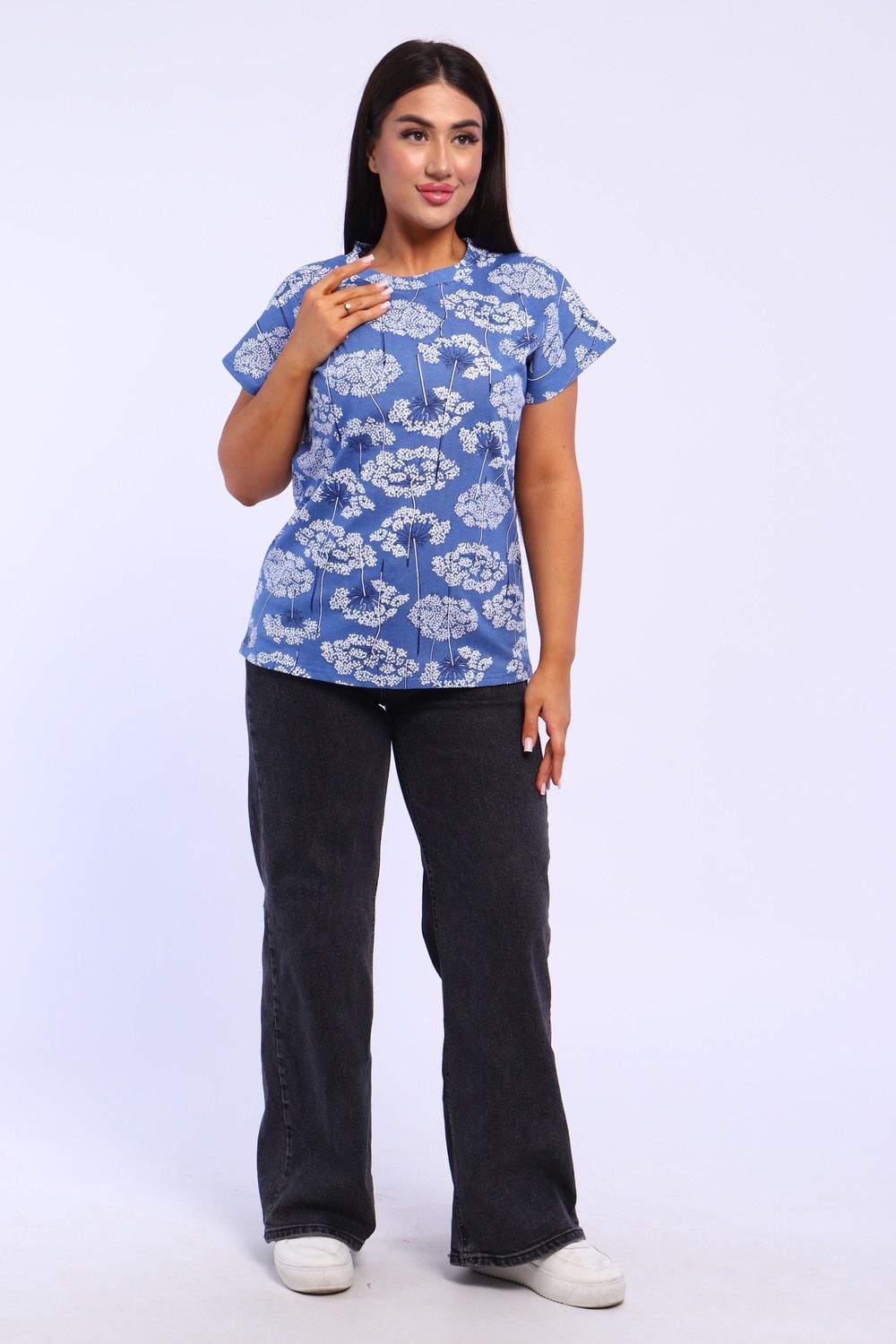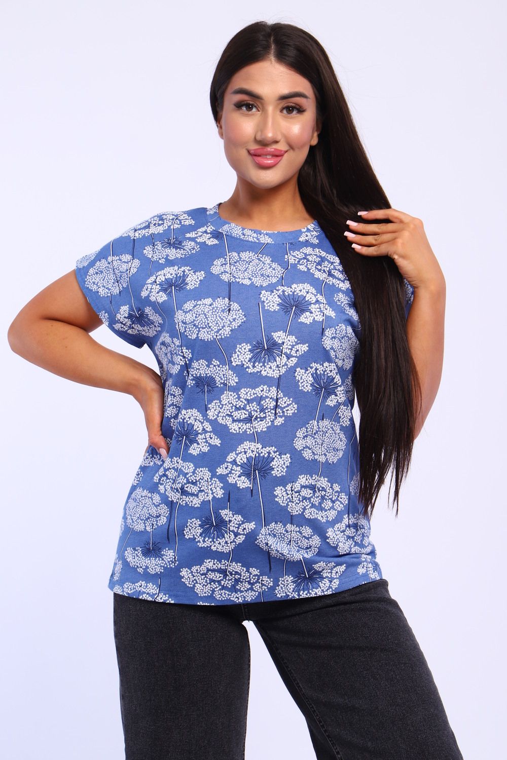 Футболка женская свободного кроя из кулирного полотна, 100% хлопок. Футболка прямого кроя, горловина обработана обтачкой, низ и рукава обработаны на плоскшовной машине. Идеальный вариант для повседневной носки и жаркого лета.