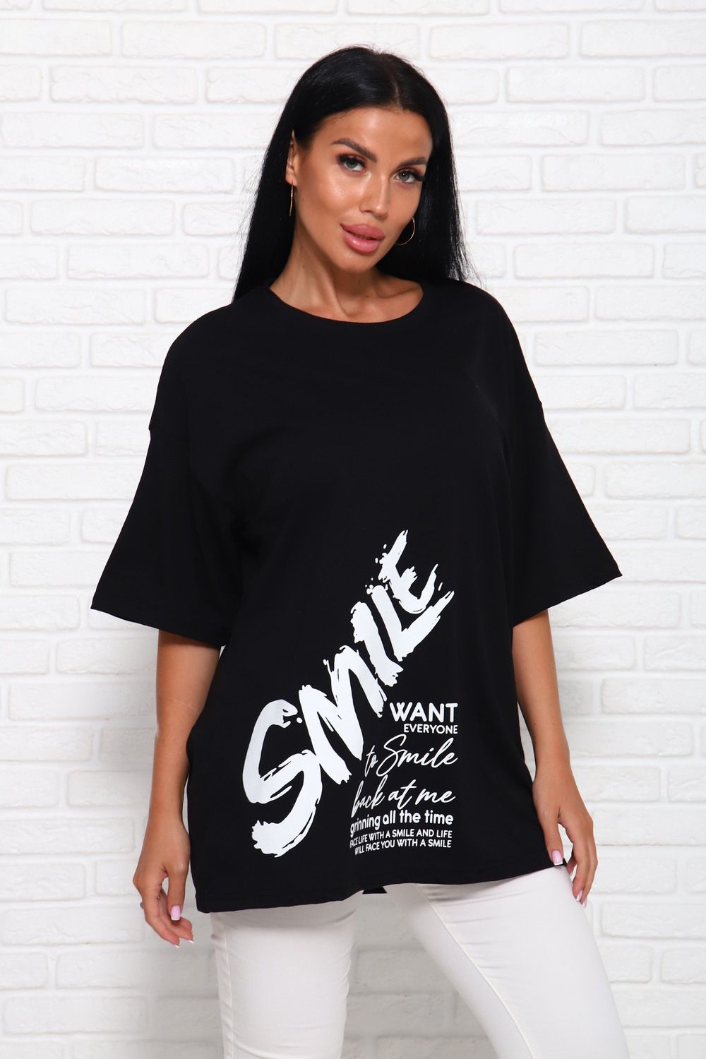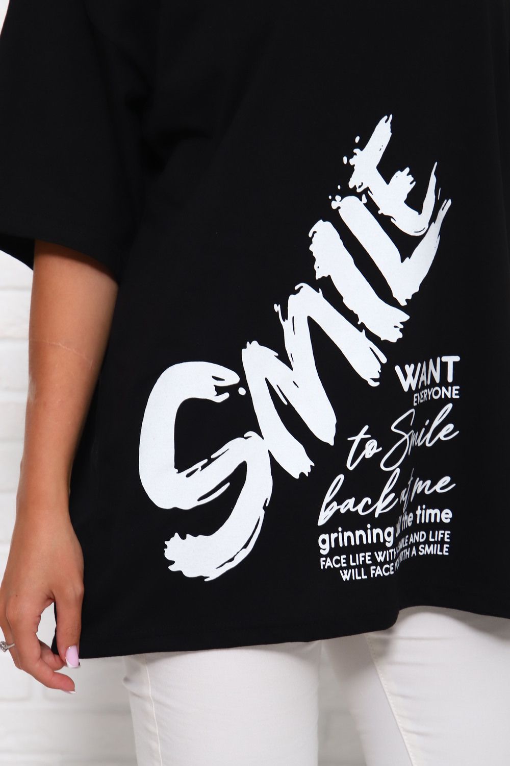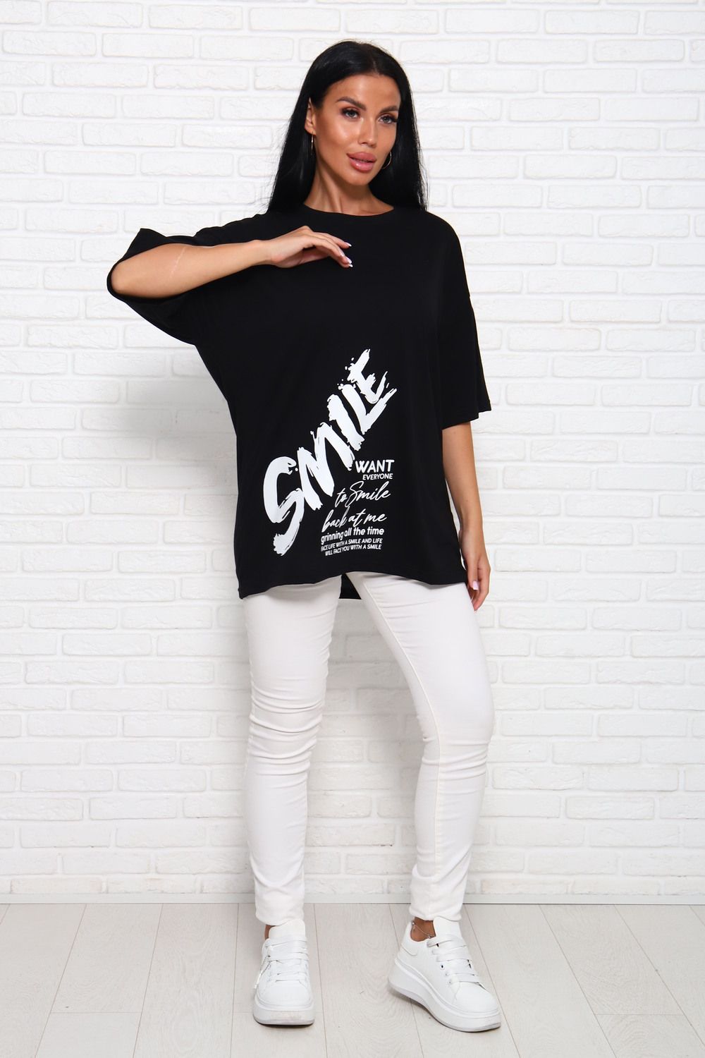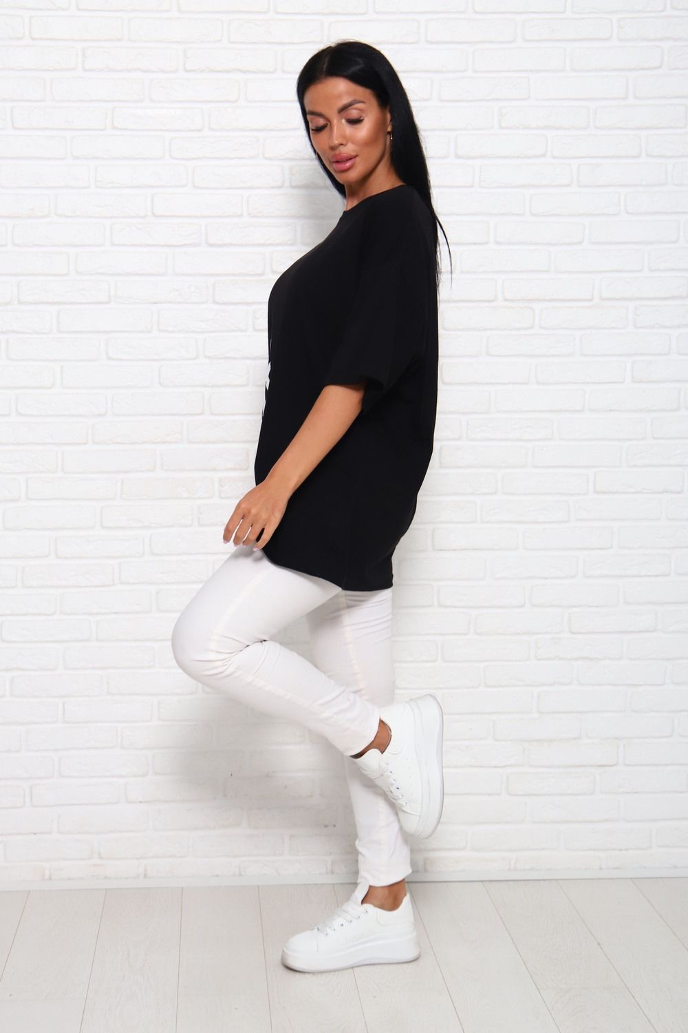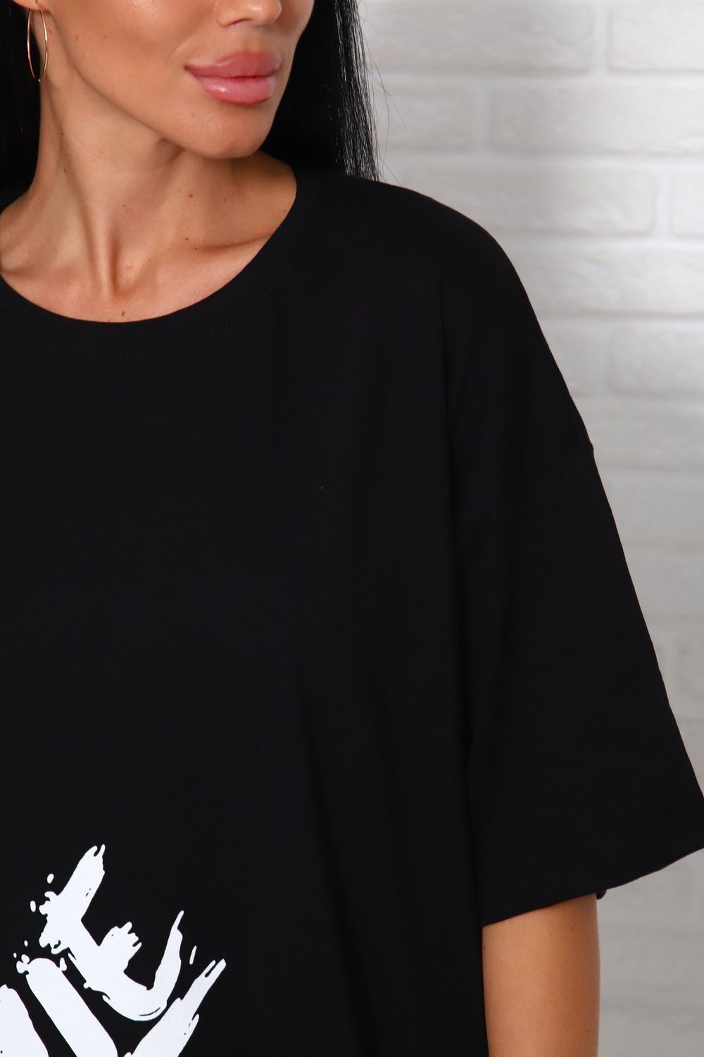 Модель свободного силуэта с принтом шелкография. Горловина круглая обработана обтачкой. Рукав спущенный, выше локтя.
