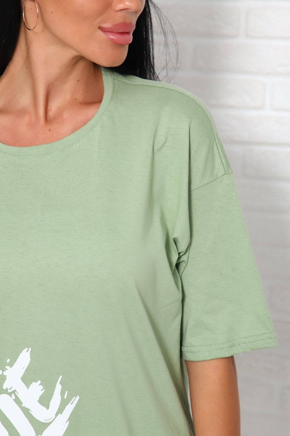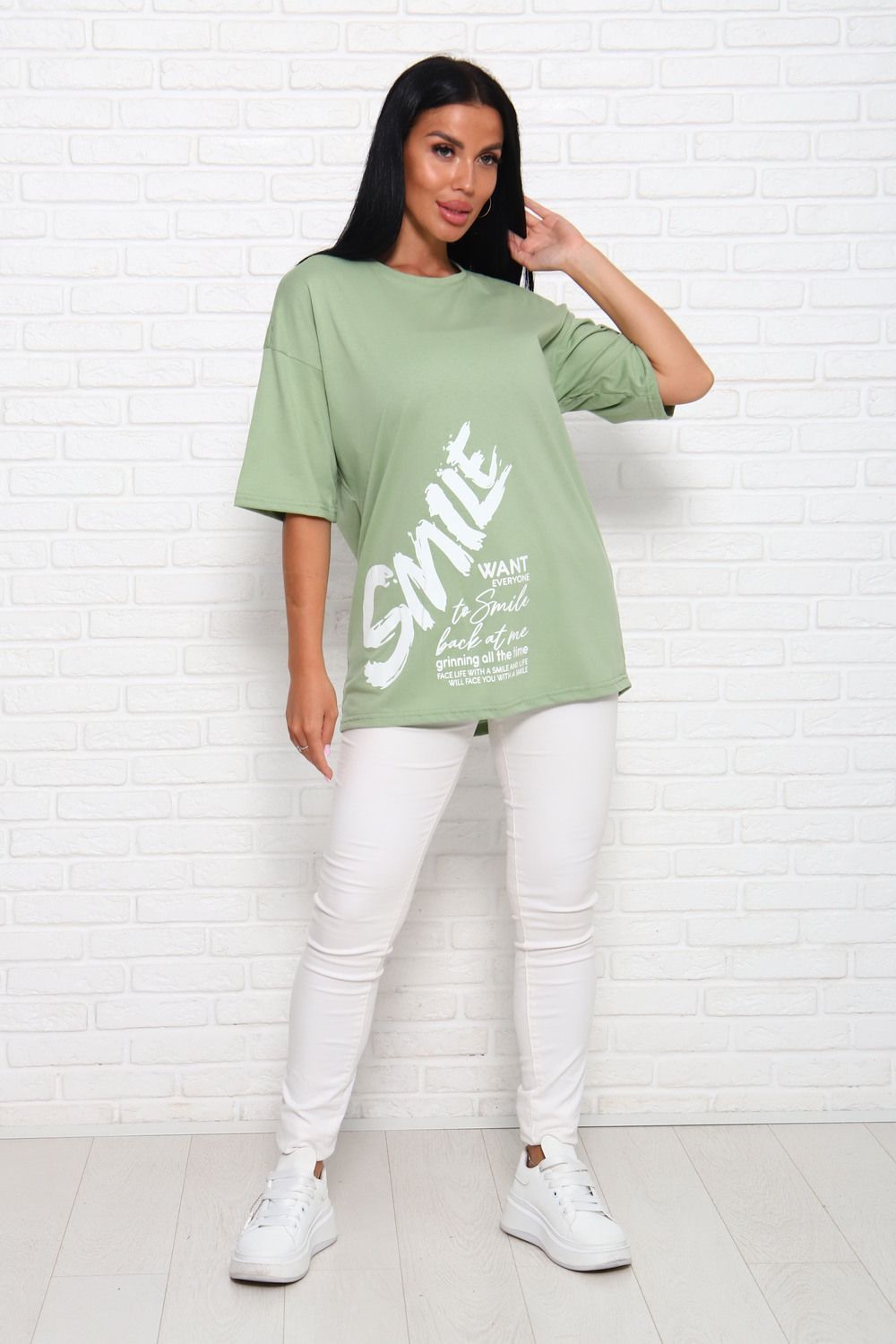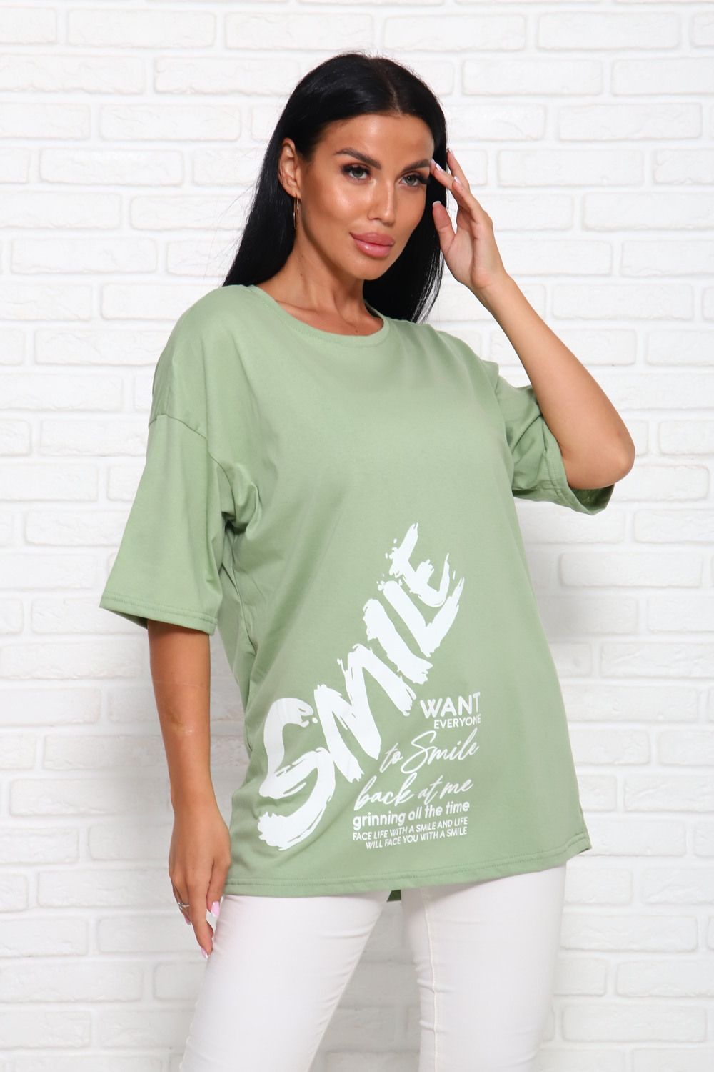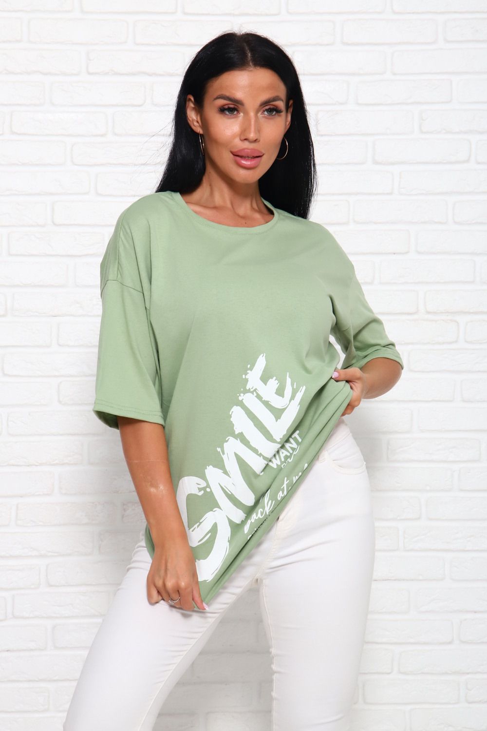 Модель свободного силуэта с принтом шелкография. Горловина круглая обработана обтачкой. Рукав спущенный, выше локтя.