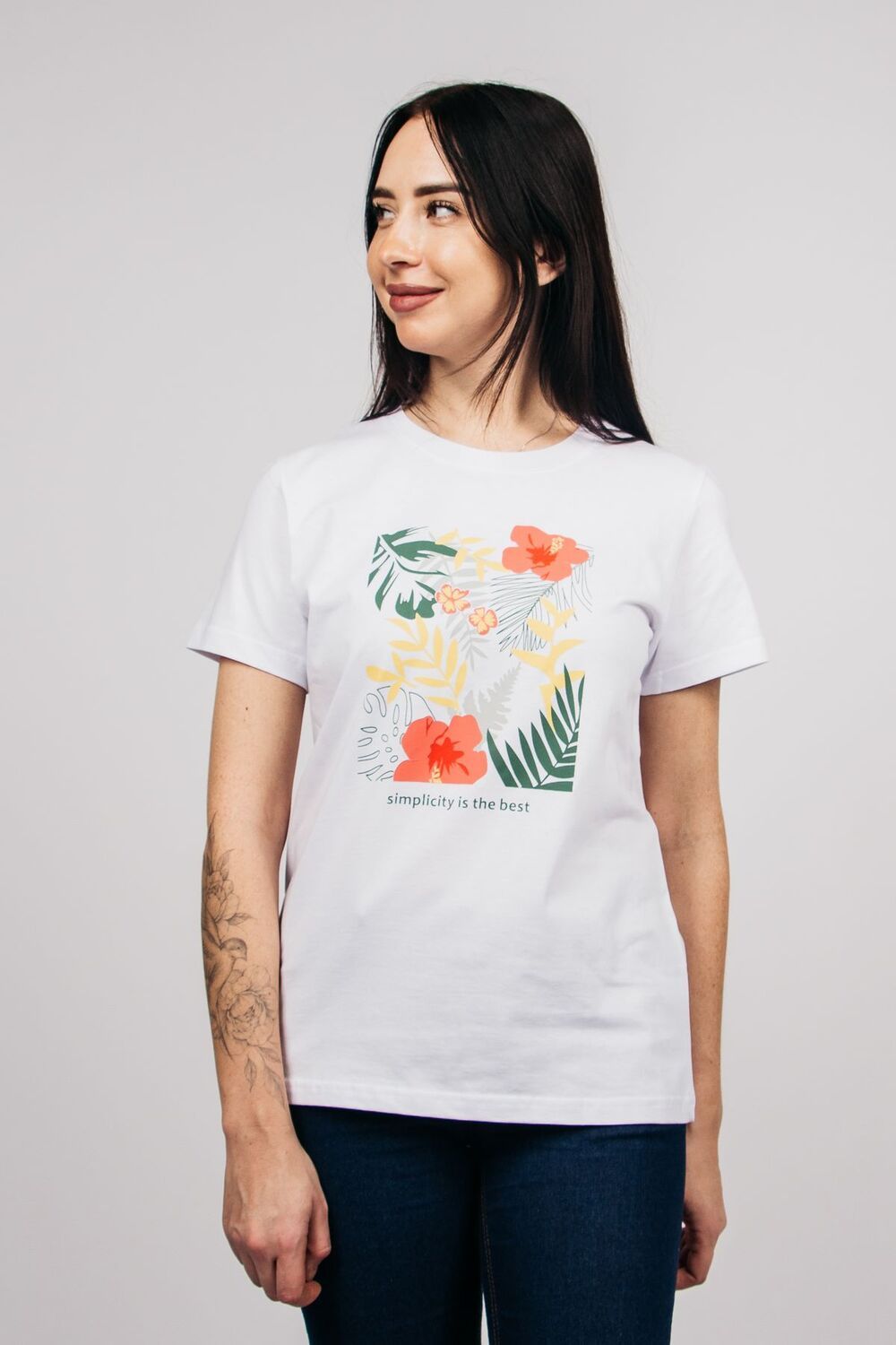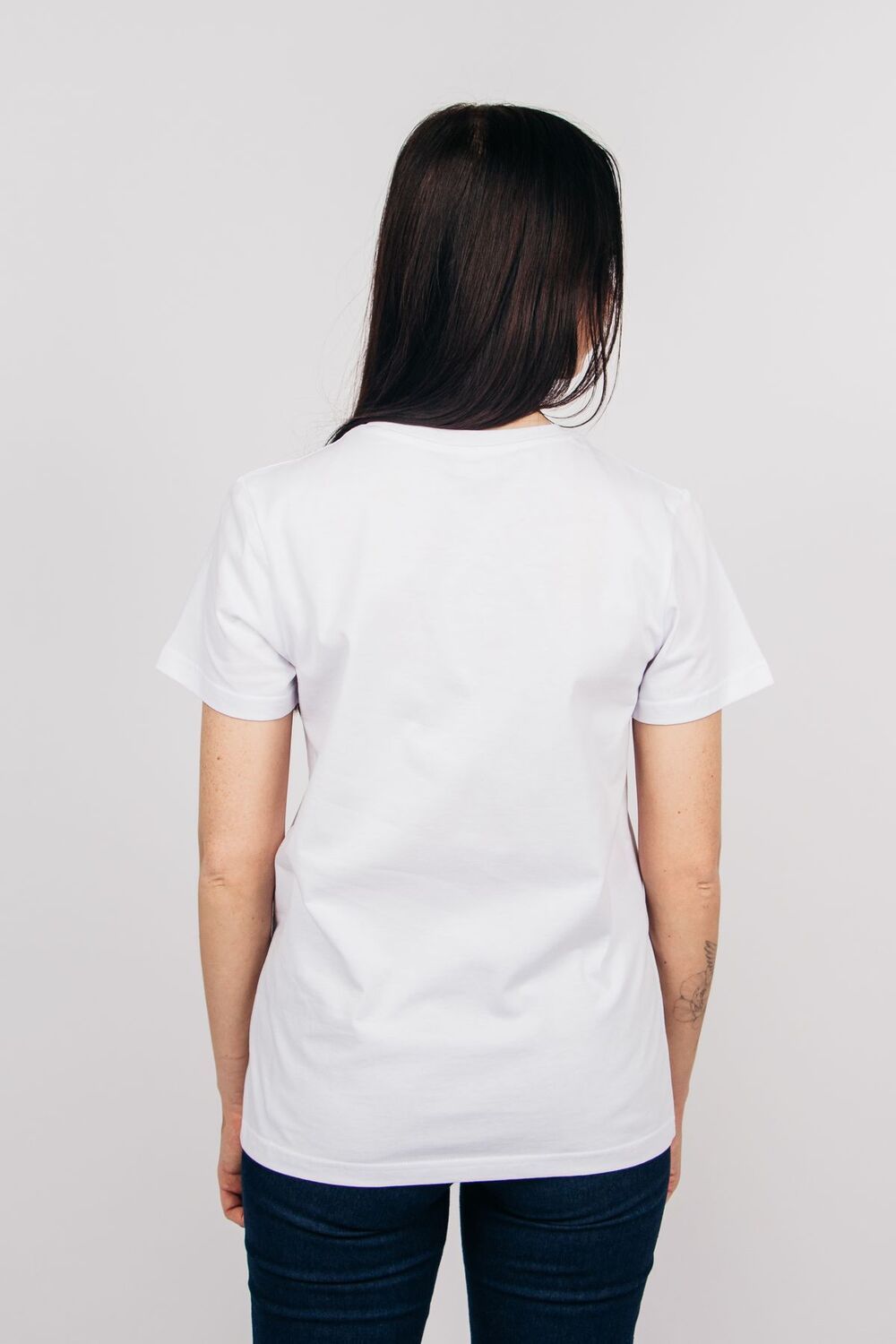 Женская футболка с принтом - шелкография - идеальный выбор для модных женщин, которые ищут базовую одежду. Футболка классического фасона, прямого кроя, с втачным коротким рукавом и круглой горловиной. Футболка новой коллекции подчеркнет ваш гардероб, а также идеально подойдет для создания ярких и стильных образов. Футболку будет удобно носить навыпуск или заправлять, отлично сочетается с юбкой, брюками с джинсами, а также можно одеть под пиджак, жакет или кардиган. Футболка выполнена из мягкого хлопкового полотна. Уход за изделием: стирать футболку с вещами похожего цвета и вынимать сразу после стирки. Гладить с изнаночной стороны. После стирки футболка сохранит свой первозданный вид, горловина не вытягивается, а боковые швы не ведет. Модель рассчитана на рост 164-170см. Полотно: Кулирная гладь-пенье. Состав: 100% Хлопок. Плотность 160 гр.