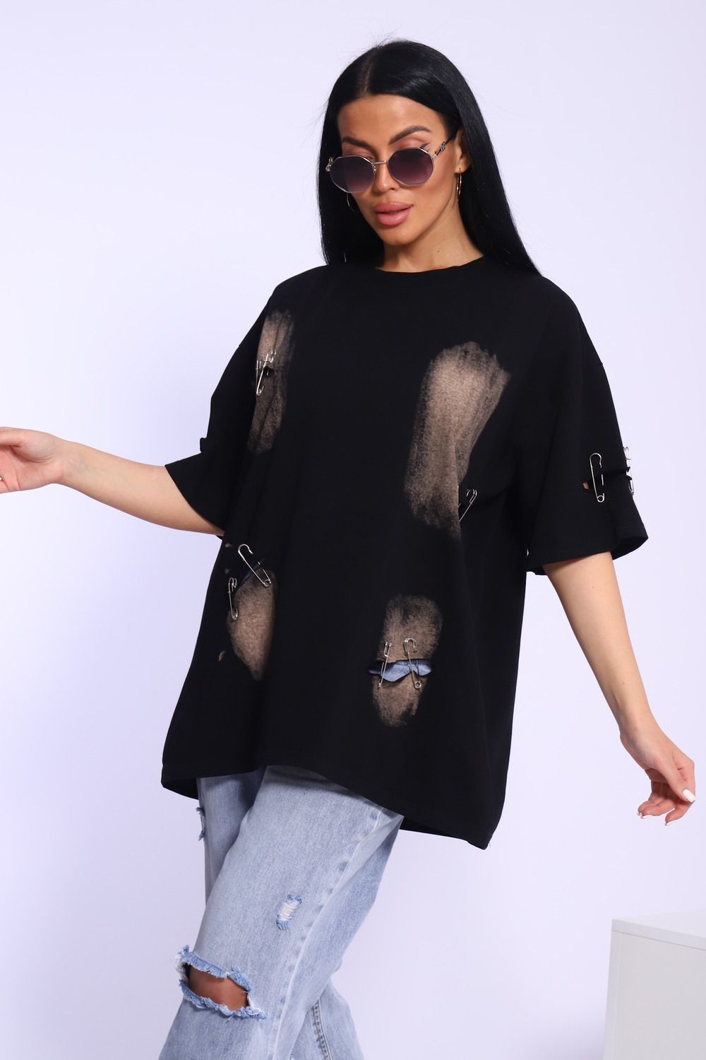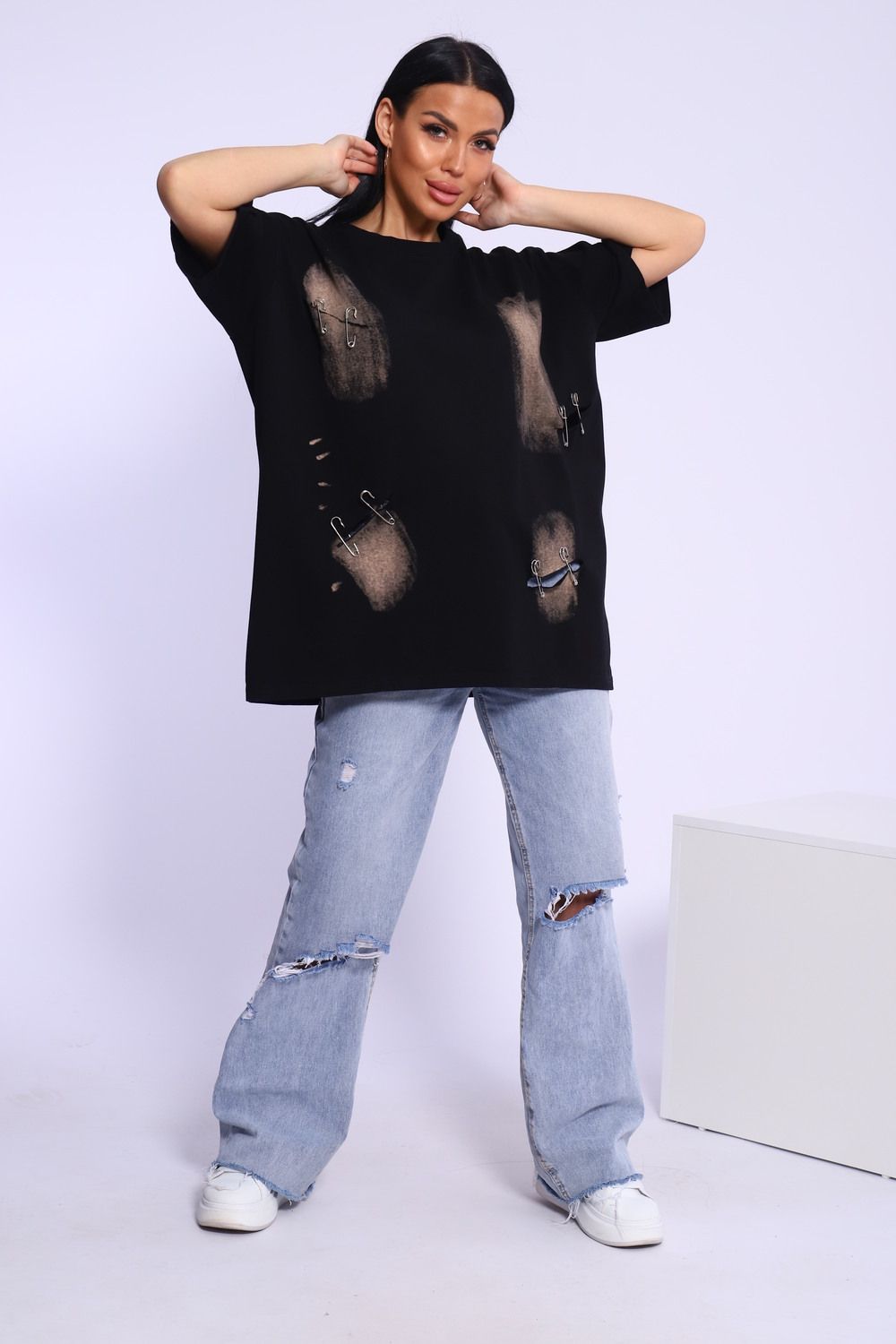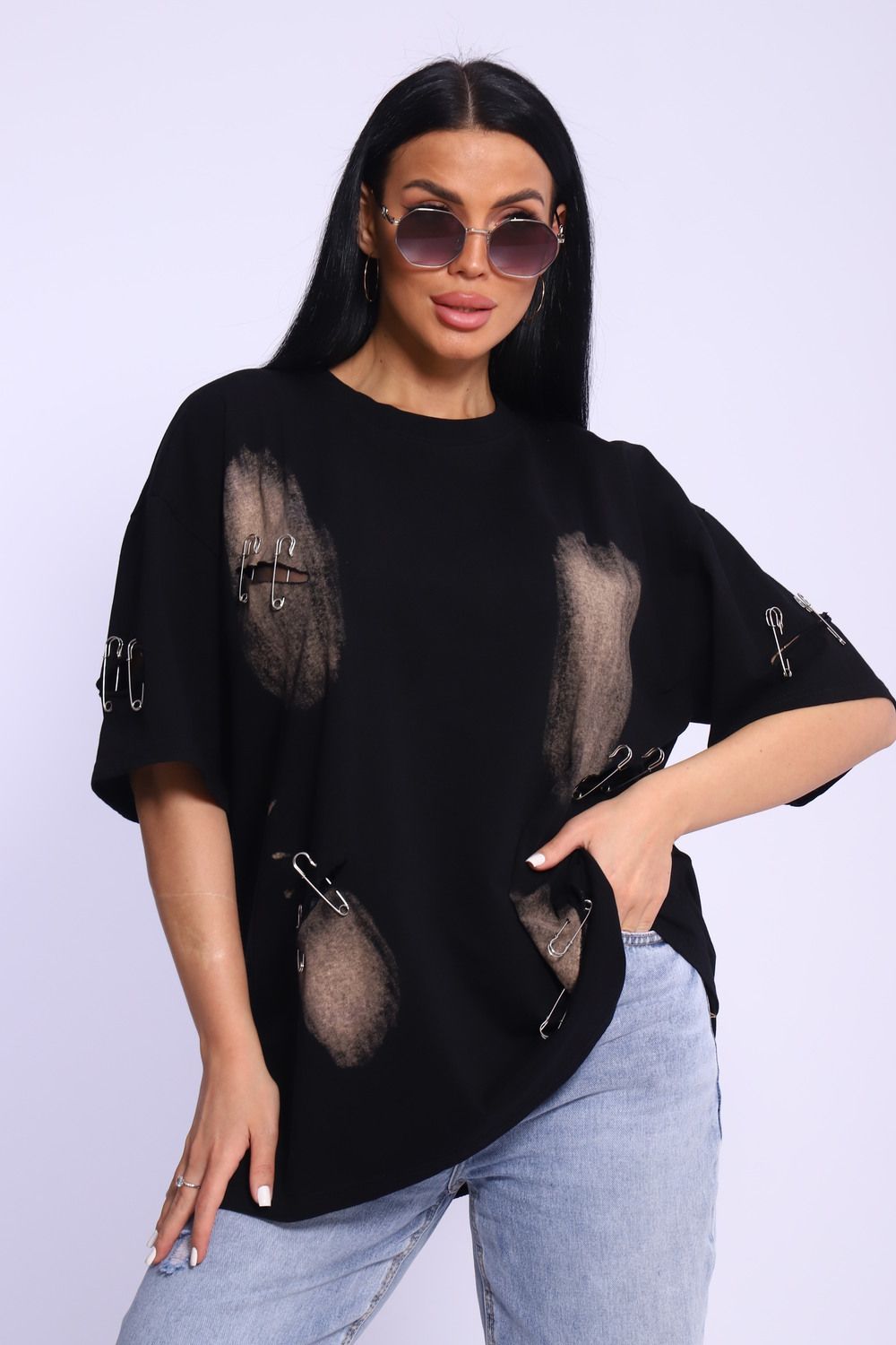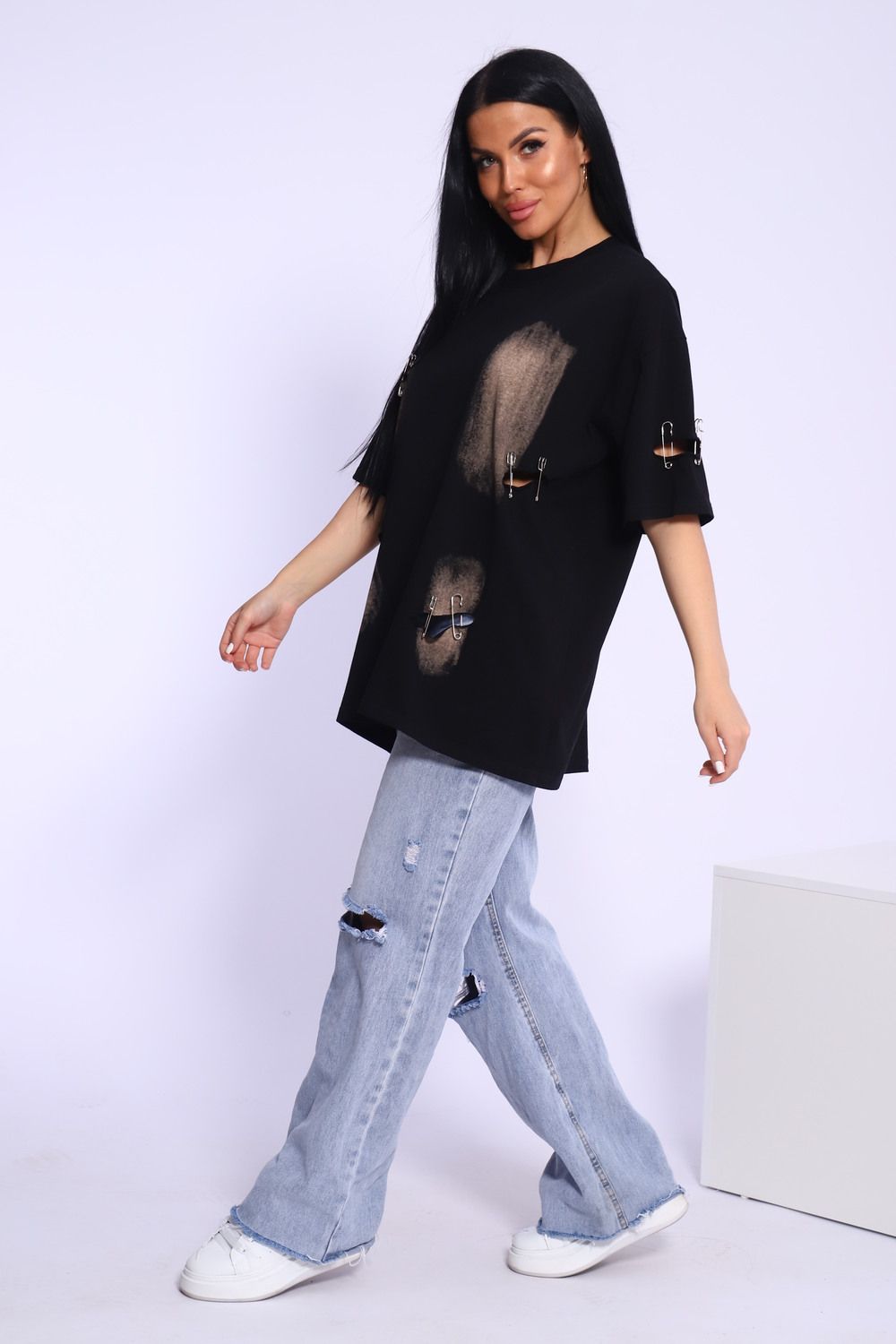 Футболка с булавками oversize - это стильная и комфортная одежда. Изготовлена из хлопка, очень плотная и не просвечивает. Футболка имеет большой размер, что делает ее комфортной и стильной. Она выделается необычным принтом и добавляет в ваш образ изюминку. Футболка удлиненная, что придает ей особый стиль. Идеально подходит на каждый день. Рукав спущенный и не сковывает движения. Длина рукава указана от плечевого шва. Производство Китай.