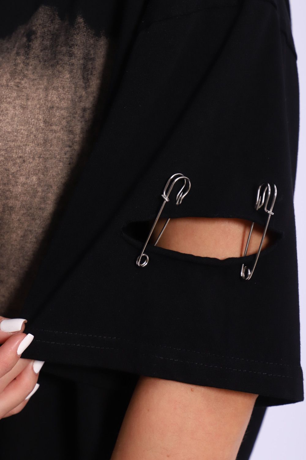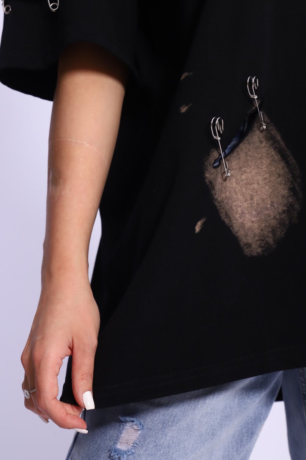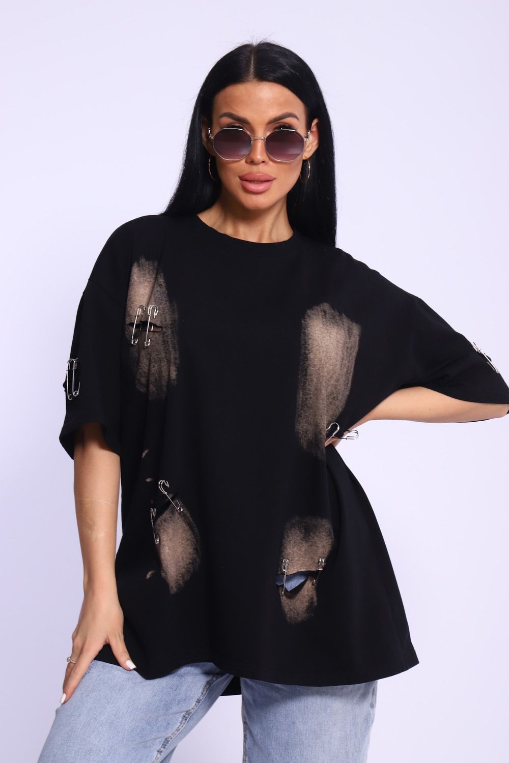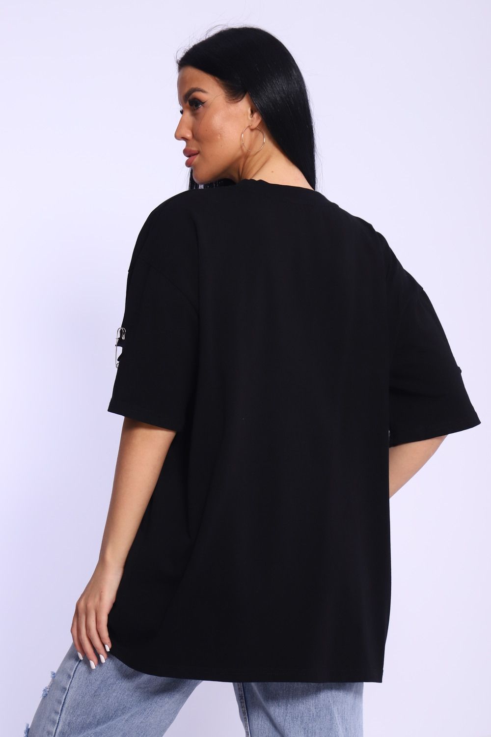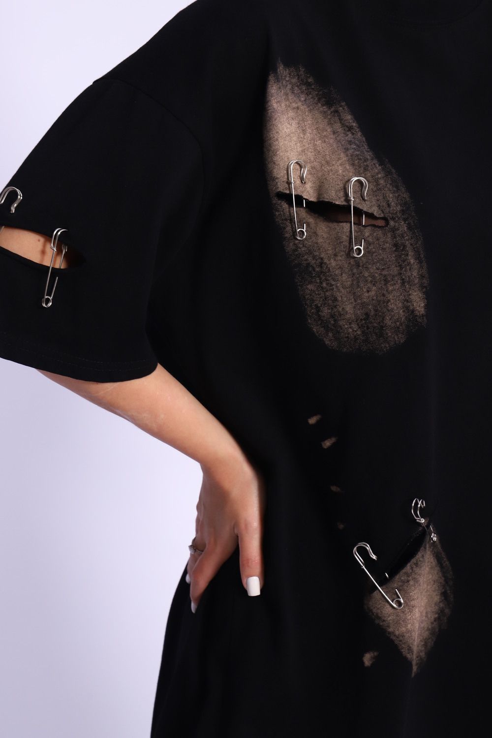 Футболка с булавками oversize - это стильная и комфортная одежда. Изготовлена из хлопка, очень плотная и не просвечивает. Футболка имеет большой размер, что делает ее комфортной и стильной. Она выделается необычным принтом и добавляет в ваш образ изюминку. Футболка удлиненная, что придает ей особый стиль. Идеально подходит на каждый день. Рукав спущенный и не сковывает движения. Длина рукава указана от плечевого шва. Производство Китай.