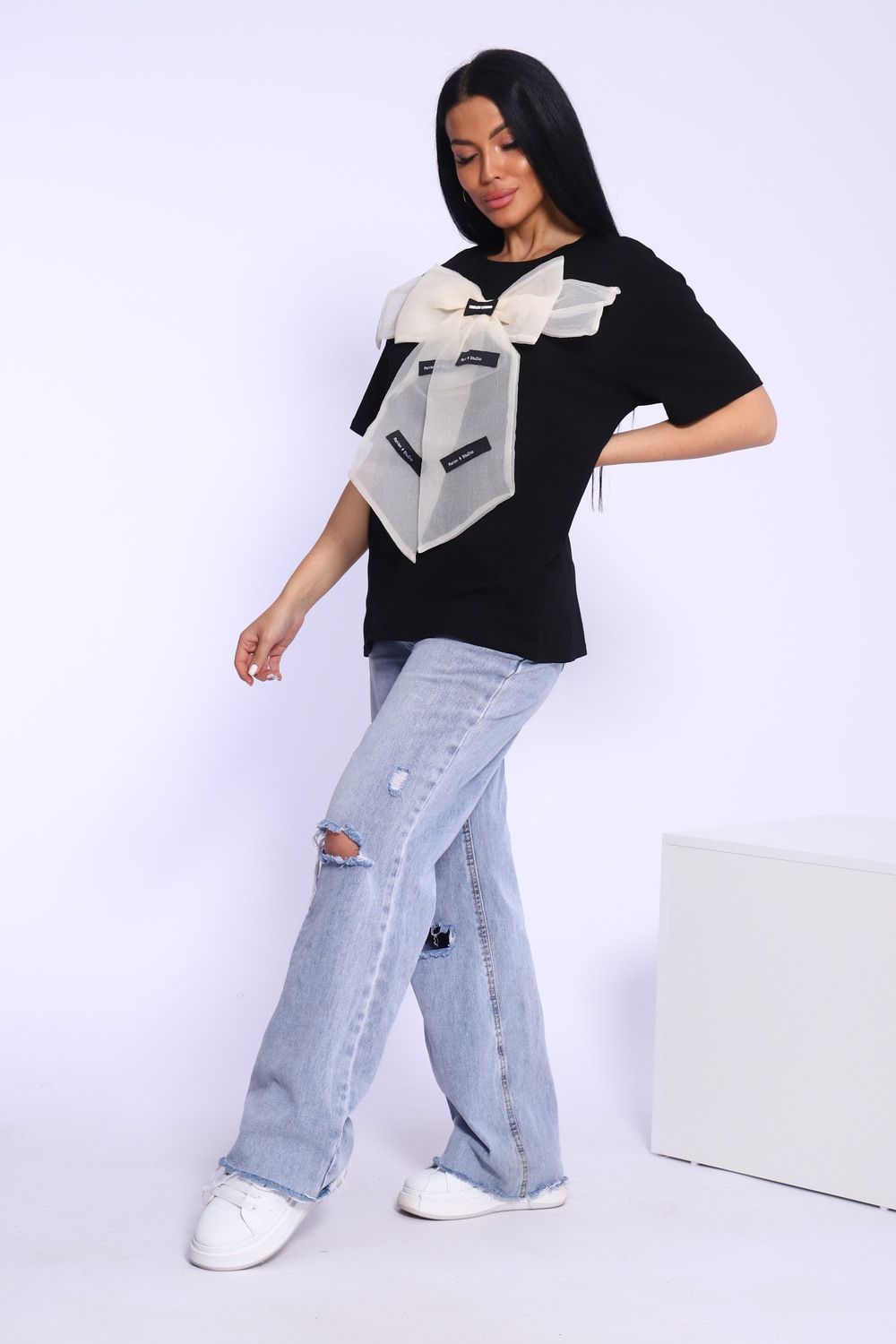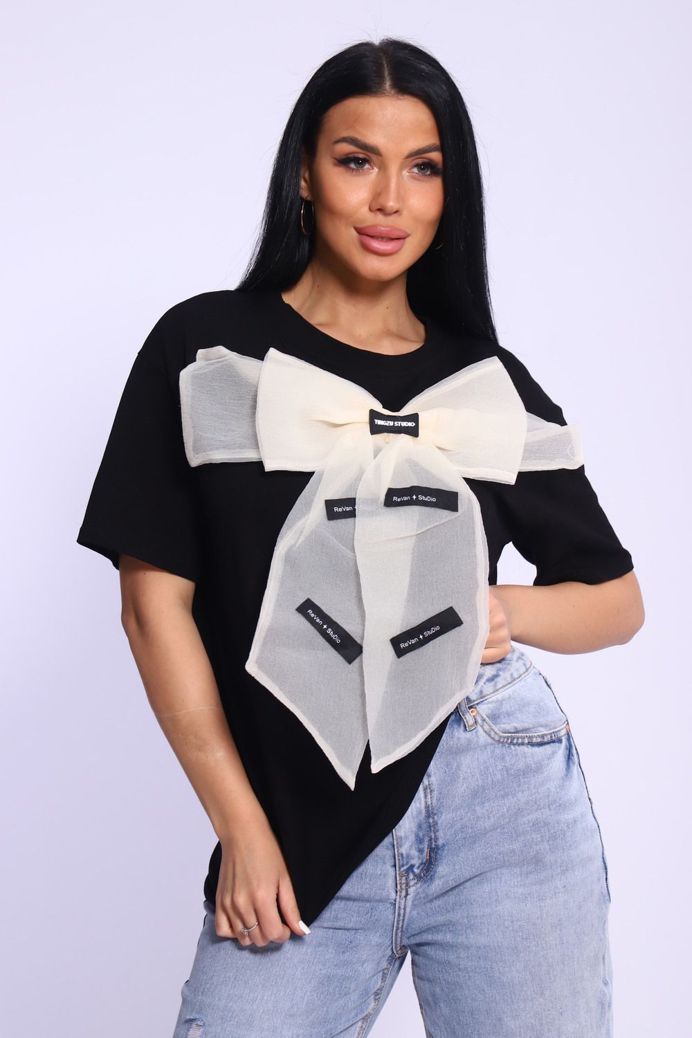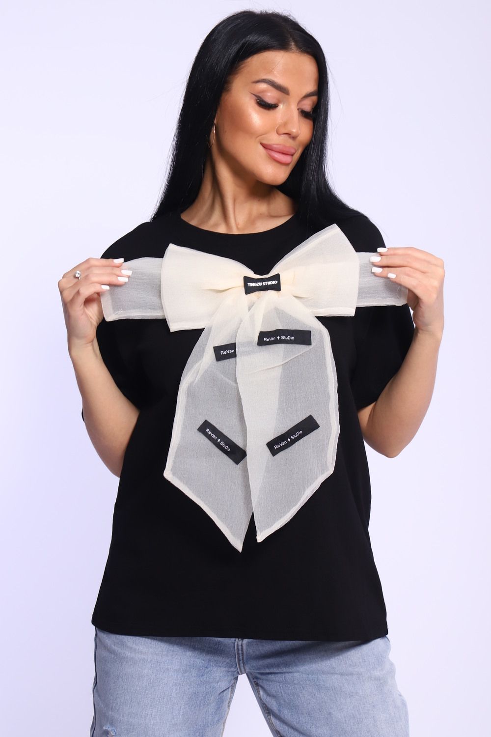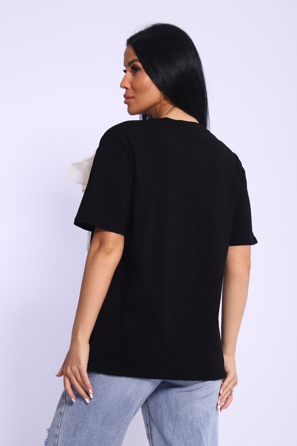 Модная и нарядная футболка с бантом - это стильный элемент вашего гардероба. Бант из тонкой ткани и хорошо держит форму. Футболка с бантом сделает образ изысканным и уникальным. Благодаря уникальному дизайну будет незаменимым элементом вашего гардероба. Подойдет на день рождение, для офиса, как вечерняя, праздничная и повседневная одежда. Рукав спущенный и не сковывает движения. Длина рукава указана от плечевого шва. Перед стиркой вывернуть наизнанку. Производство Китай.