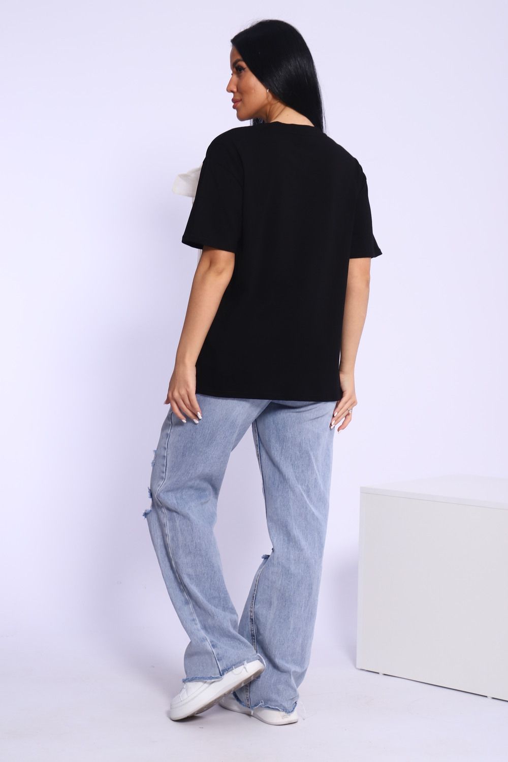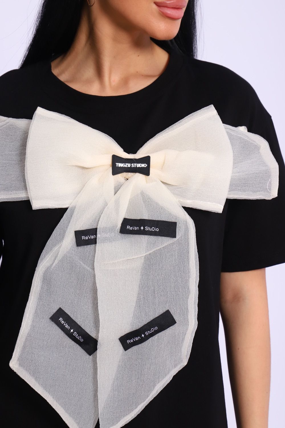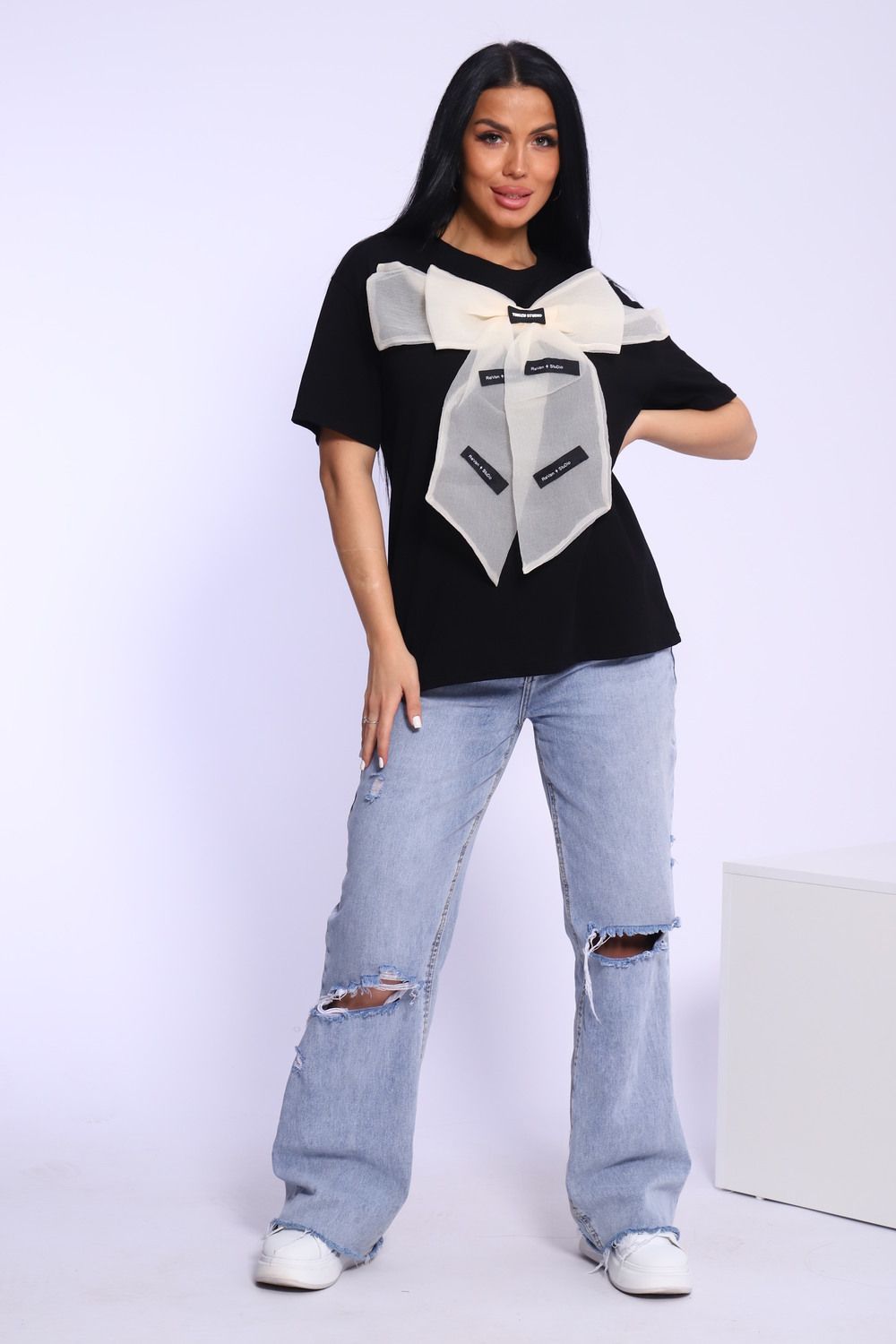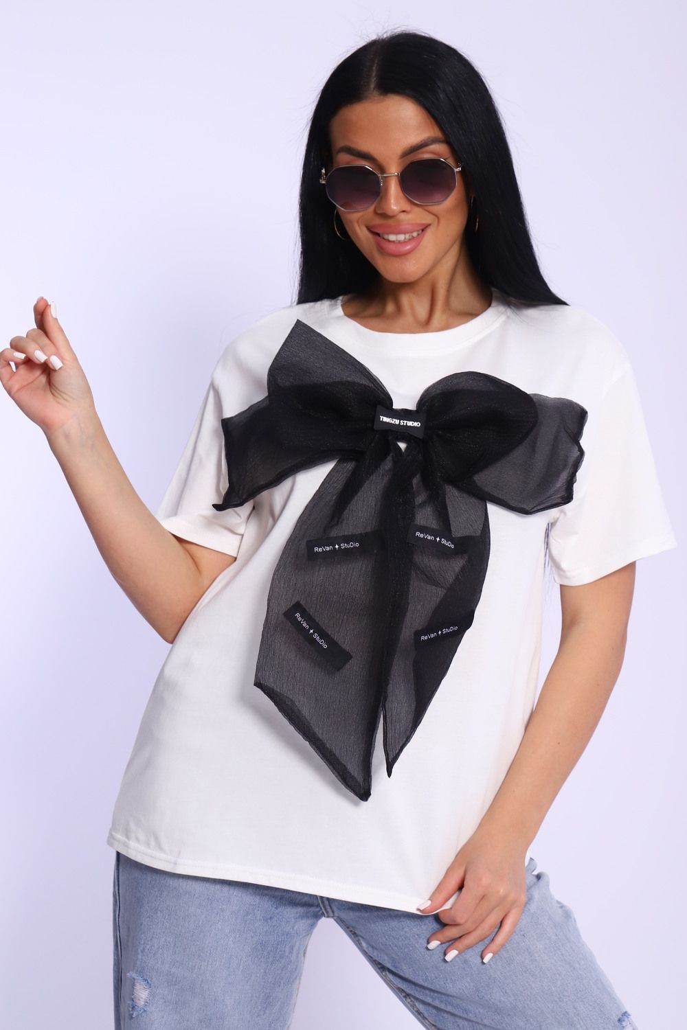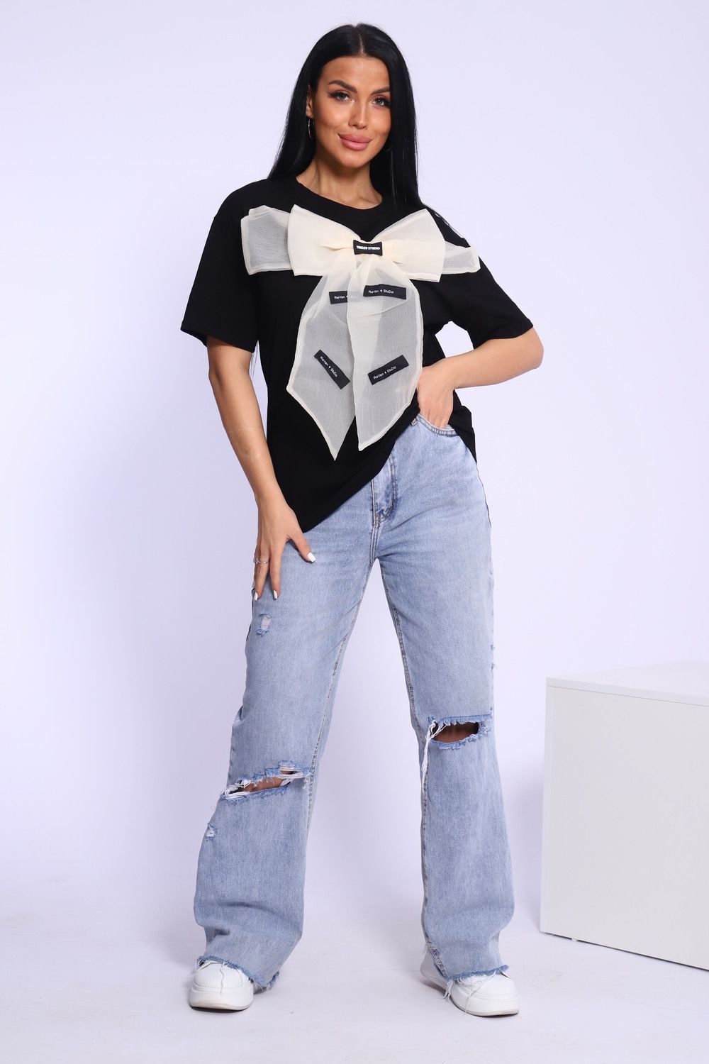 Модная и нарядная футболка с бантом - это стильный элемент вашего гардероба. Бант из тонкой ткани и хорошо держит форму. Футболка с бантом сделает образ изысканным и уникальным. Благодаря уникальному дизайну будет незаменимым элементом вашего гардероба. Подойдет на день рождение, для офиса, как вечерняя, праздничная и повседневная одежда. Рукав спущенный и не сковывает движения. Длина рукава указана от плечевого шва. Перед стиркой вывернуть наизнанку. Производство Китай.