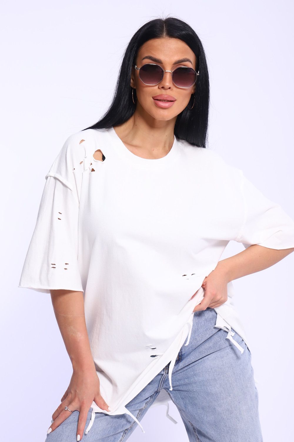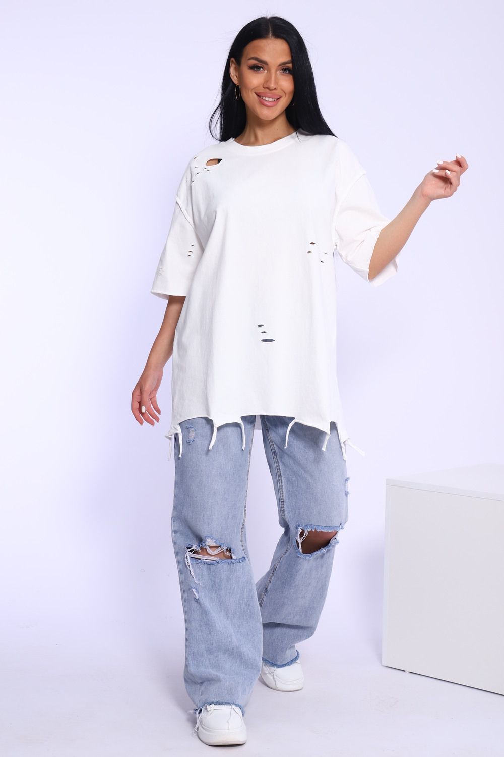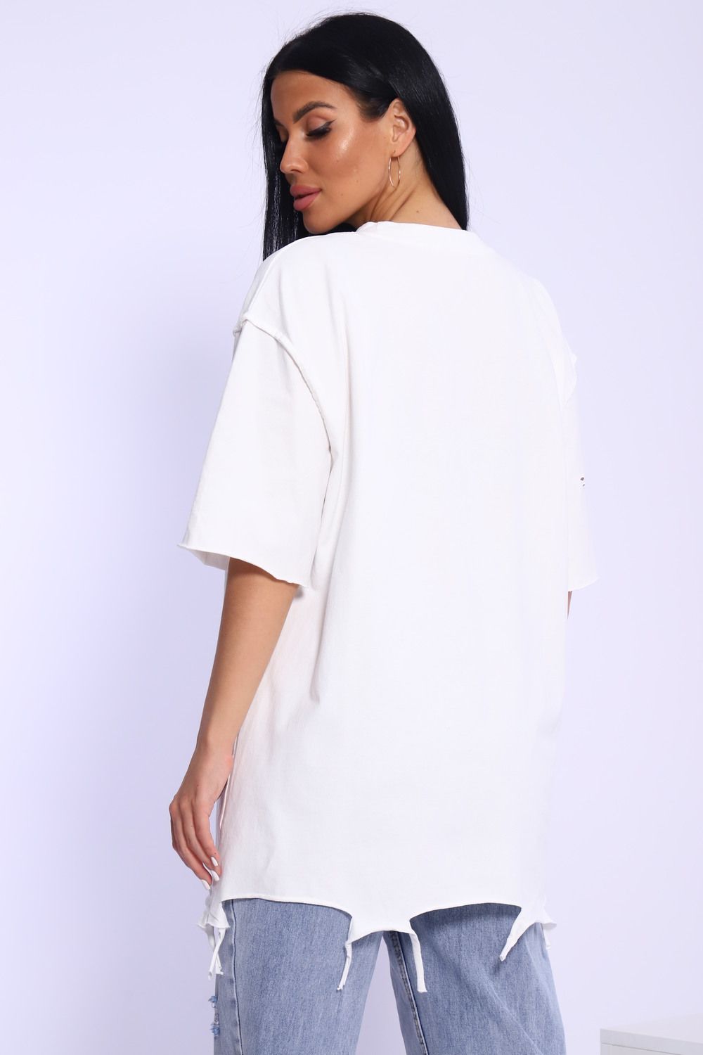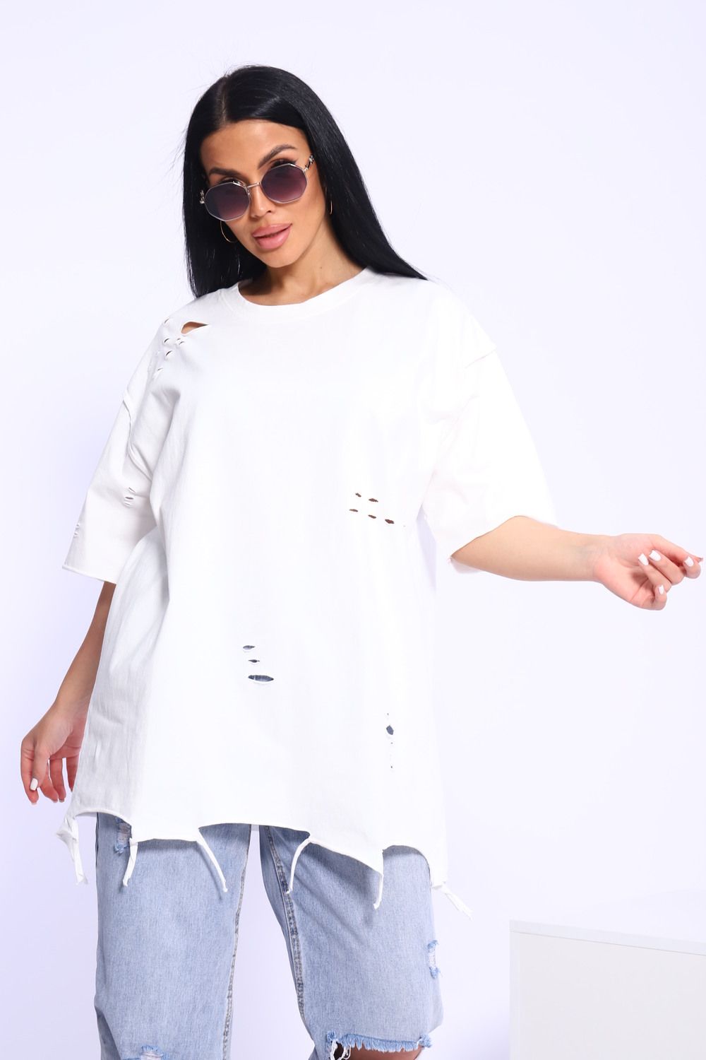 Рваная женская футболка. Oversize подходит всем типам фигур. Изготовлена из хлопка, очень плотная и не просвечивает. Свободная посадка и прямой крой. Длинная хлопковая футболка отлично подойдёт для создания повседневных образов. Дырки расположены на рукавах, плечах и спереди. Рукав спущенный и не сковывает движения. Длина рукава указана от плечевого шва. Производство Китай.