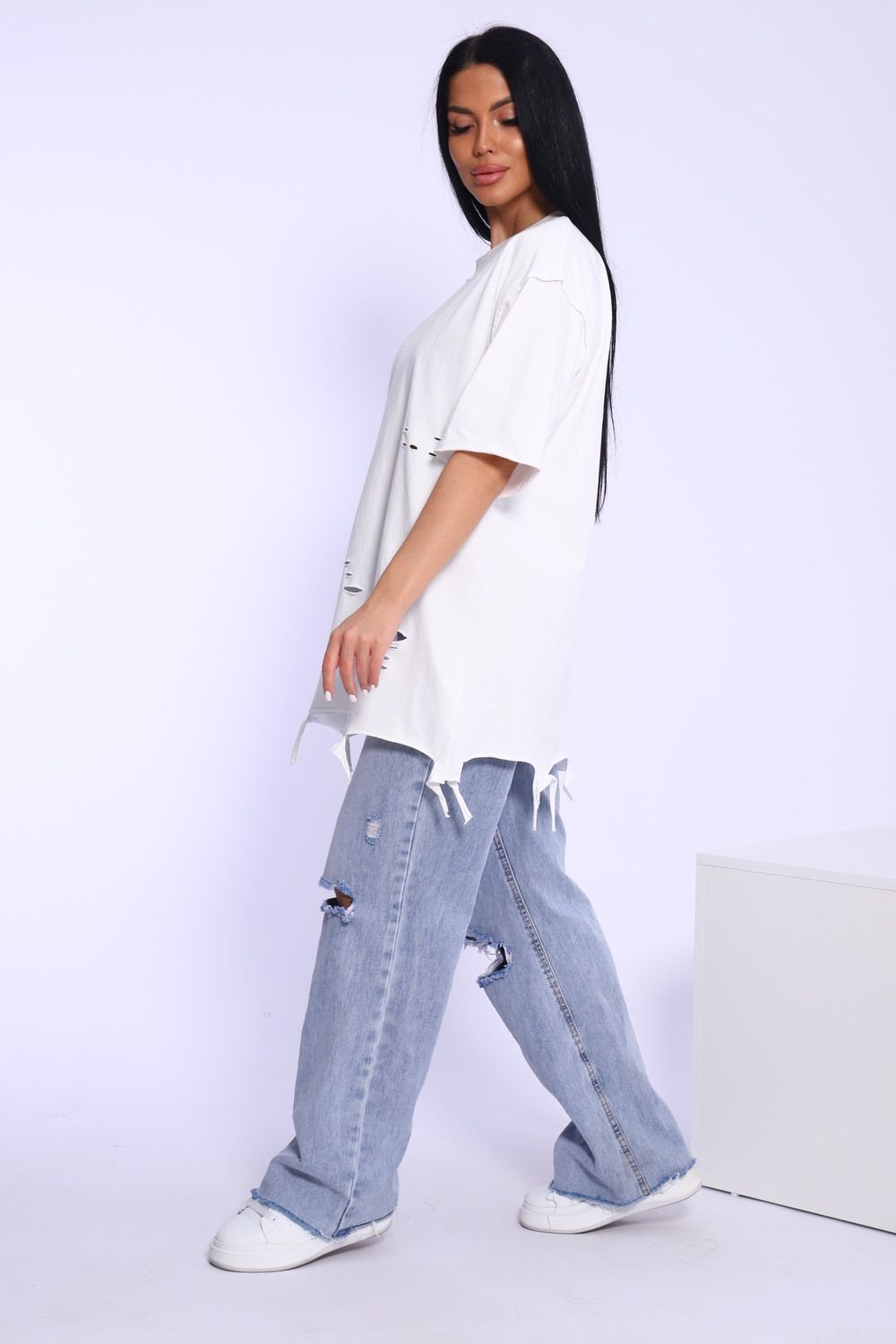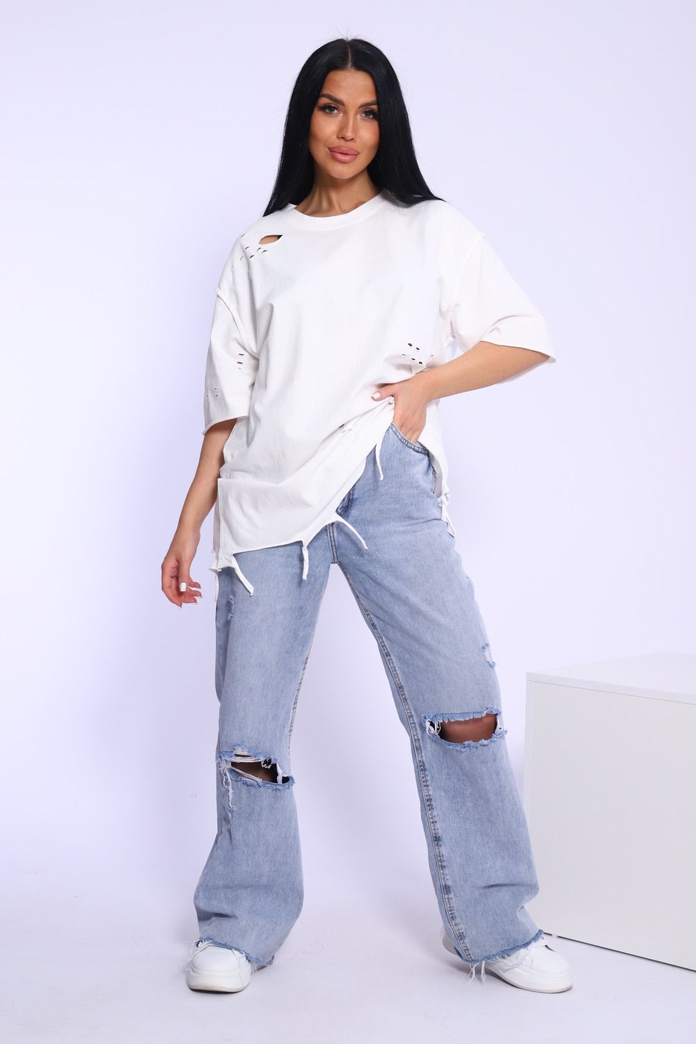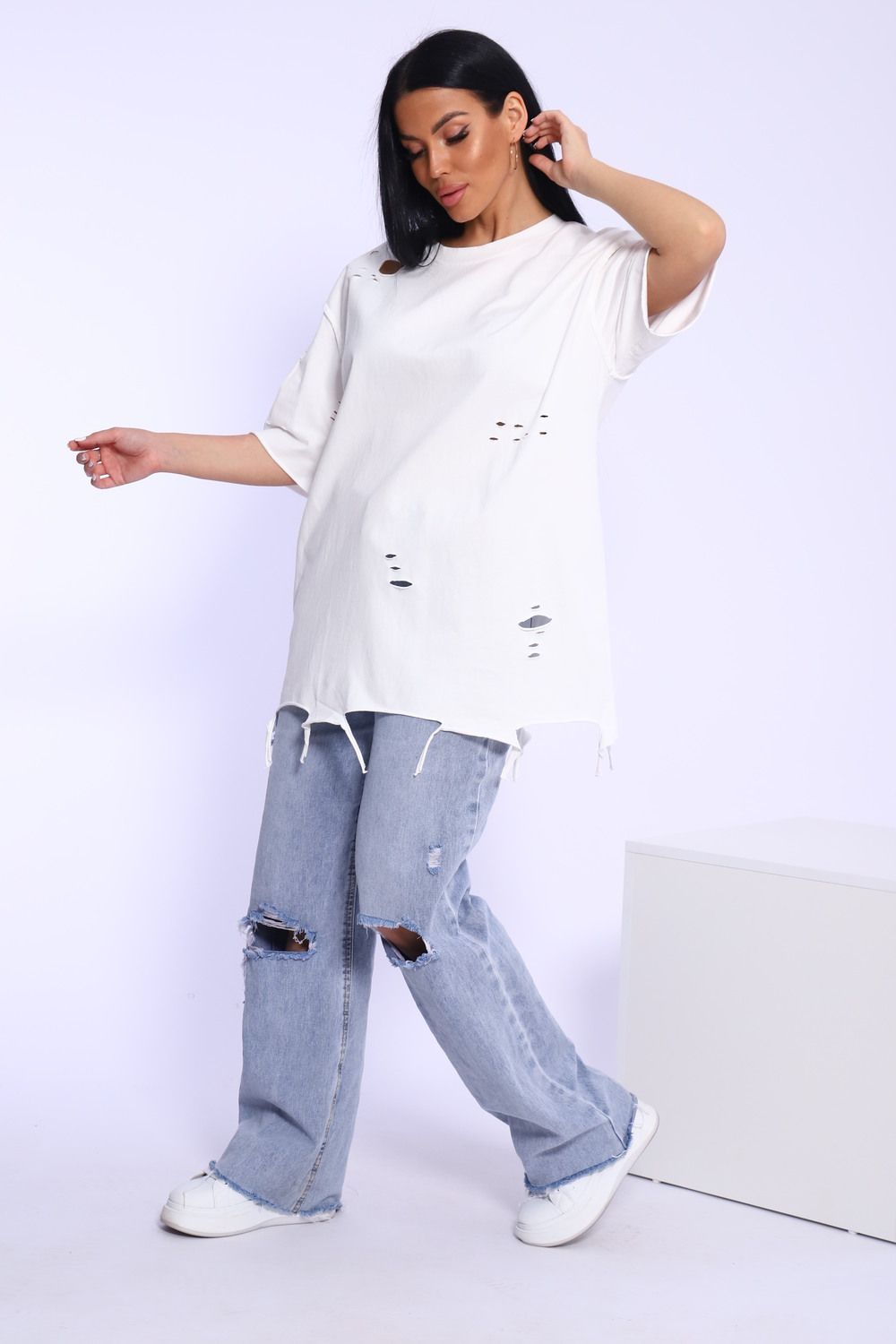 Рваная женская футболка. Oversize подходит всем типам фигур. Изготовлена из хлопка, очень плотная и не просвечивает. Свободная посадка и прямой крой. Длинная хлопковая футболка отлично подойдёт для создания повседневных образов. Дырки расположены на рукавах, плечах и спереди. Рукав спущенный и не сковывает движения. Длина рукава указана от плечевого шва. Производство Китай.