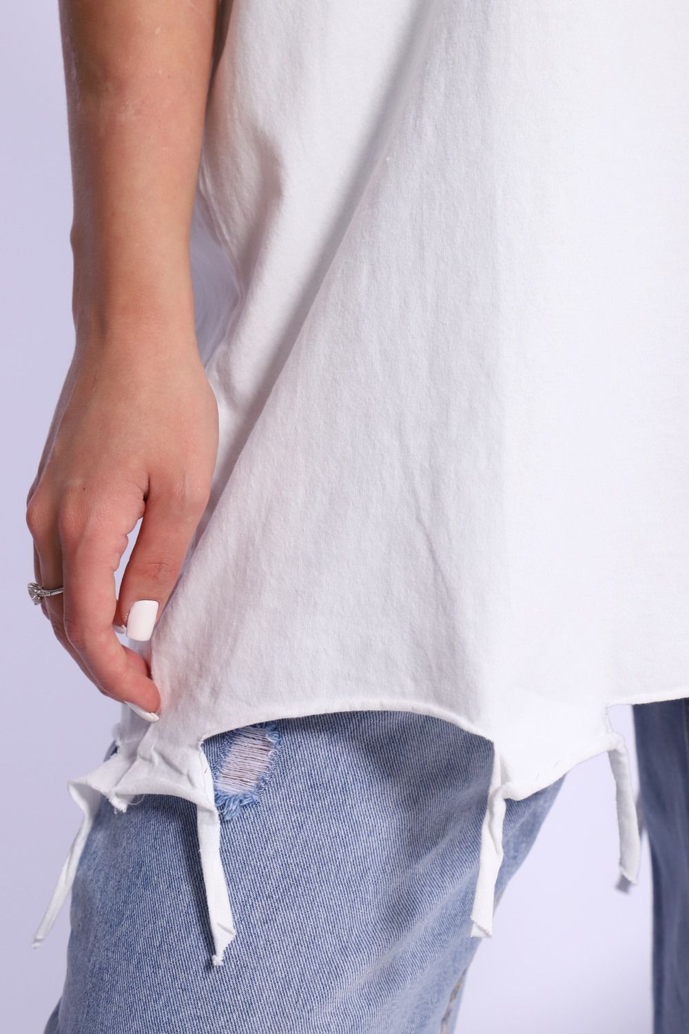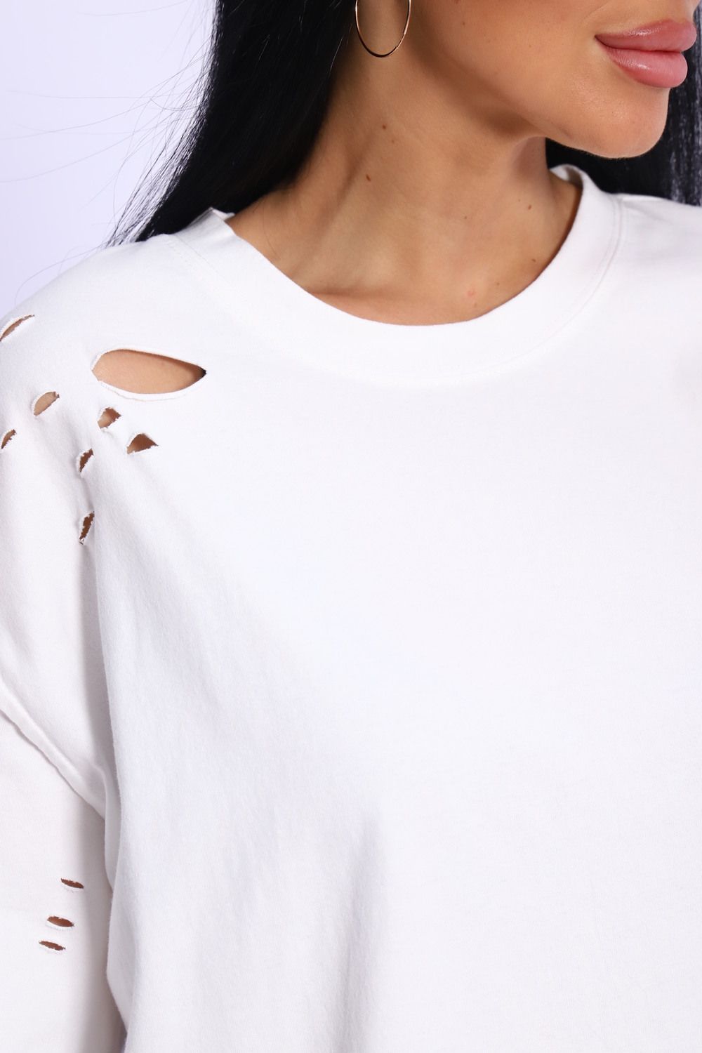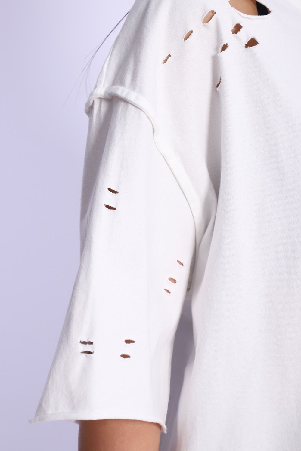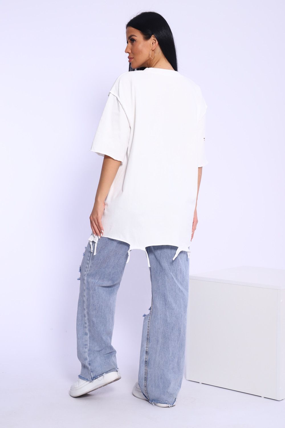 Рваная женская футболка. Oversize подходит всем типам фигур. Изготовлена из хлопка, очень плотная и не просвечивает. Свободная посадка и прямой крой. Длинная хлопковая футболка отлично подойдёт для создания повседневных образов. Дырки расположены на рукавах, плечах и спереди. Рукав спущенный и не сковывает движения. Длина рукава указана от плечевого шва. Производство Китай.