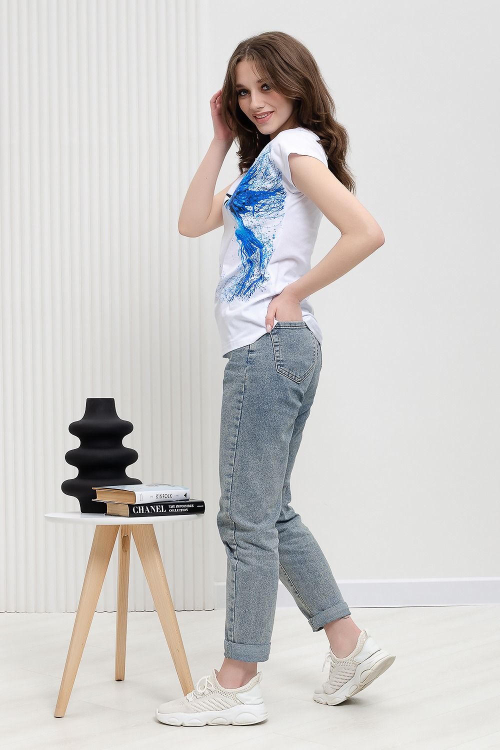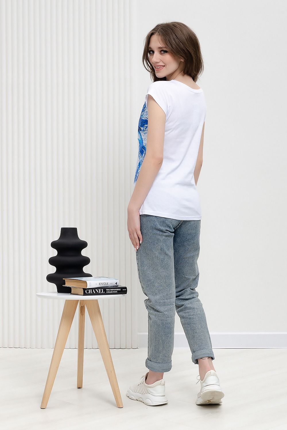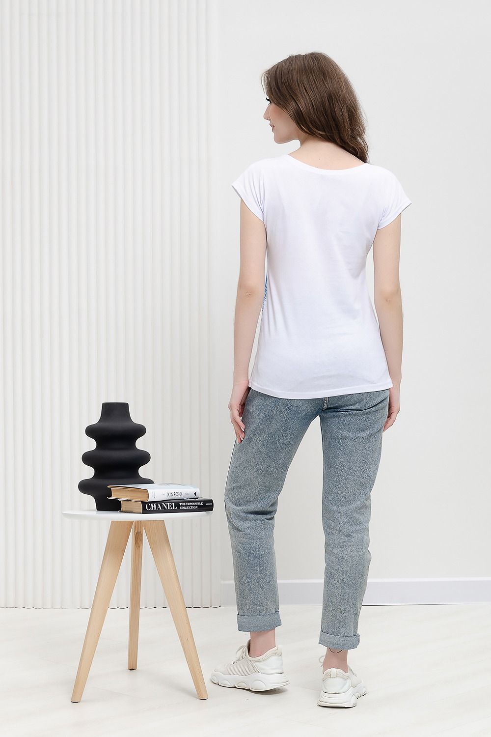 Футболка полуприлегающего силуэта, средней длины, с округлой горловиной. Рукав цельнокроеный, короткий.