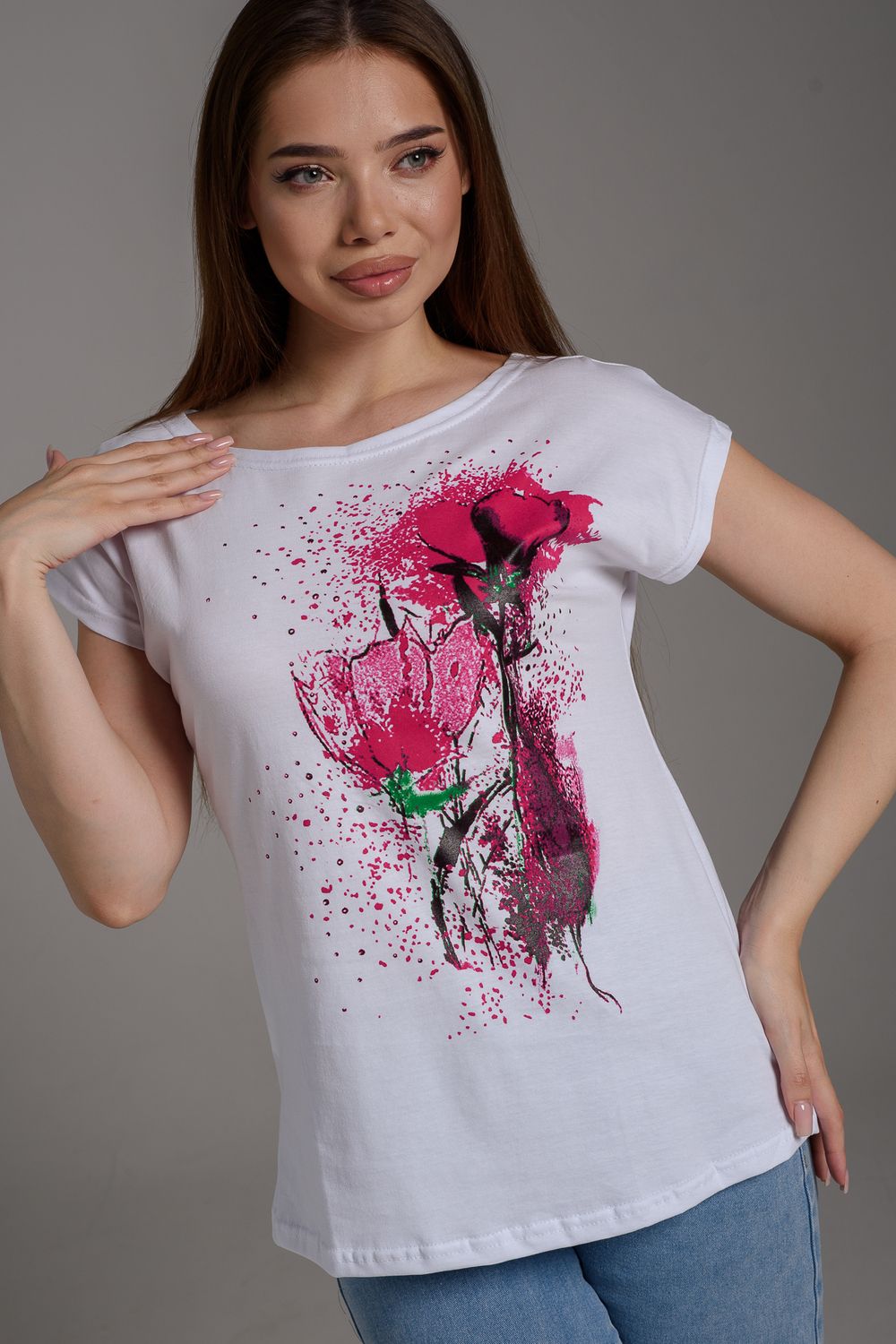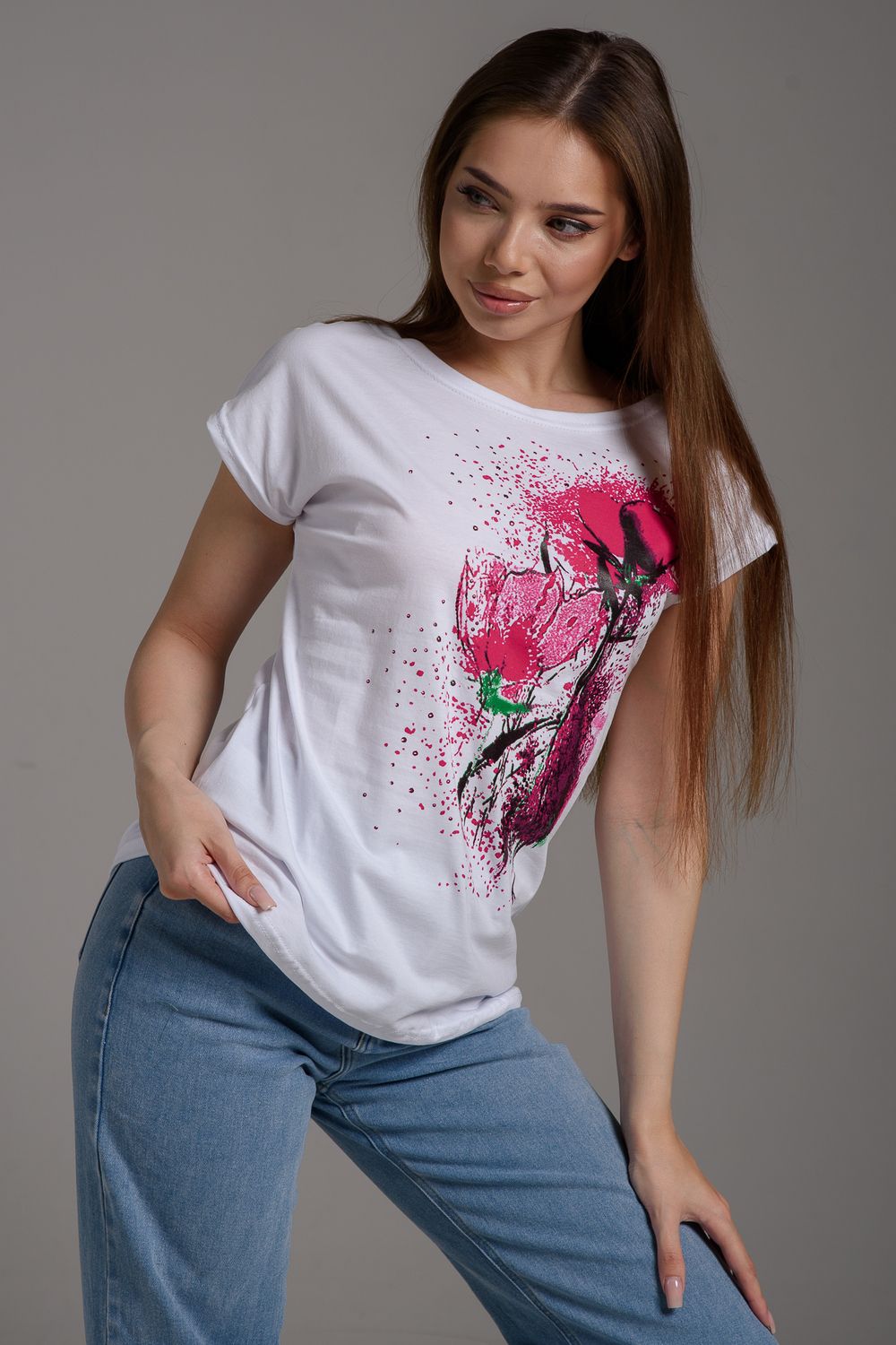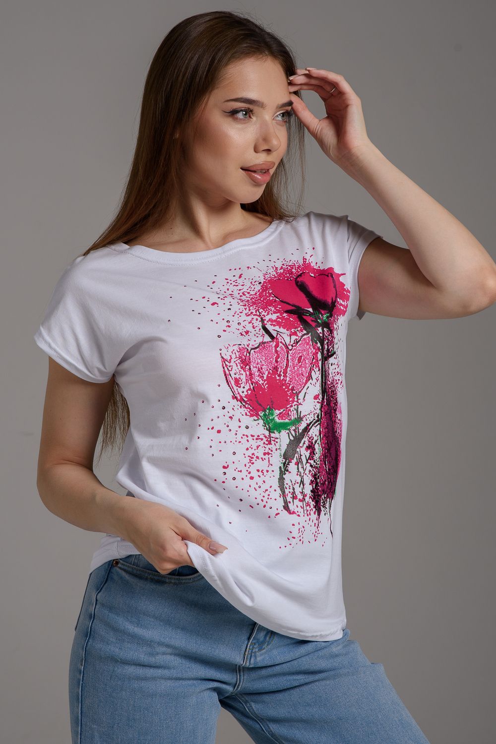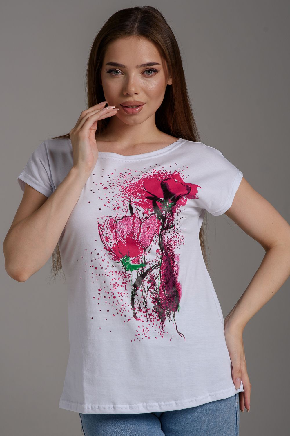 Футболка полуприлегающего силуэта, средней длины, с округлой горловиной. Рукав цельнокроеный, короткий.