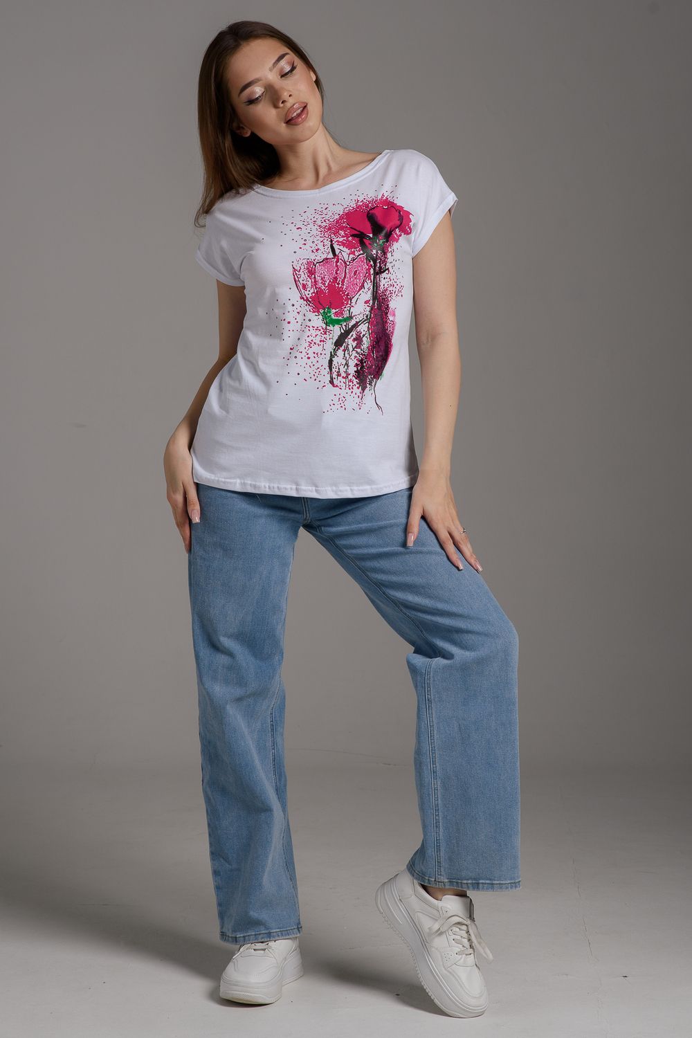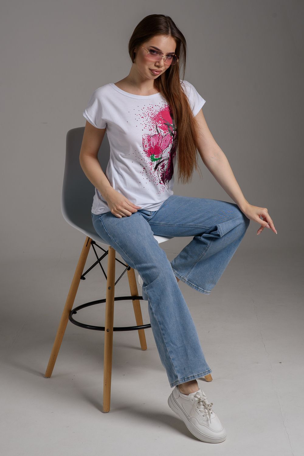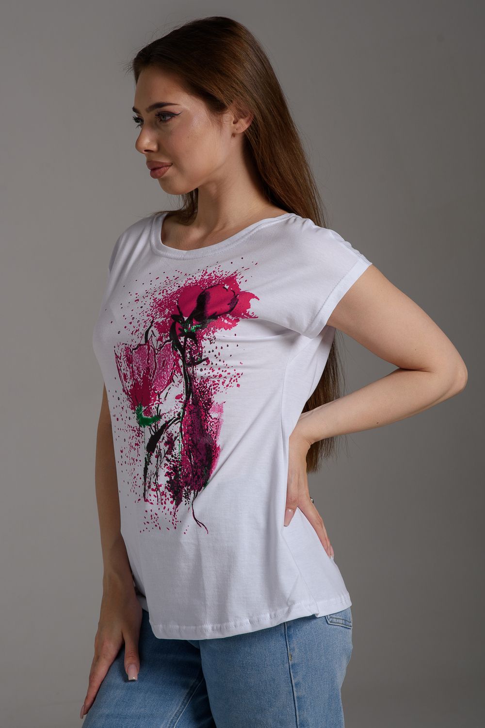 Футболка полуприлегающего силуэта, средней длины, с округлой горловиной. Рукав цельнокроеный, короткий.