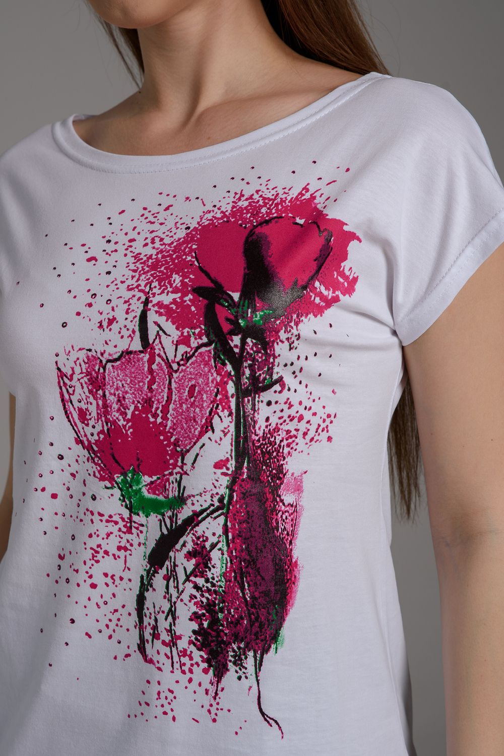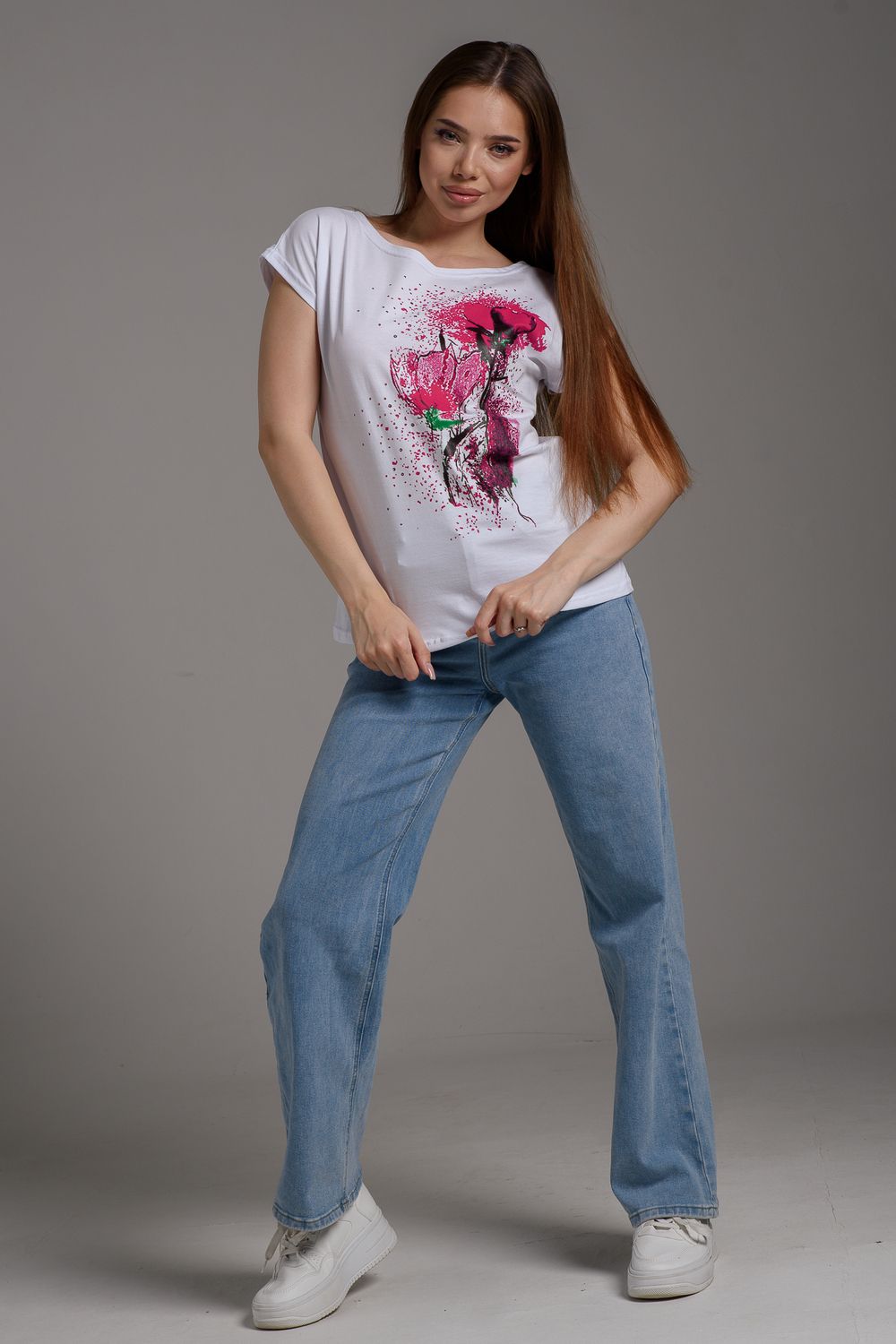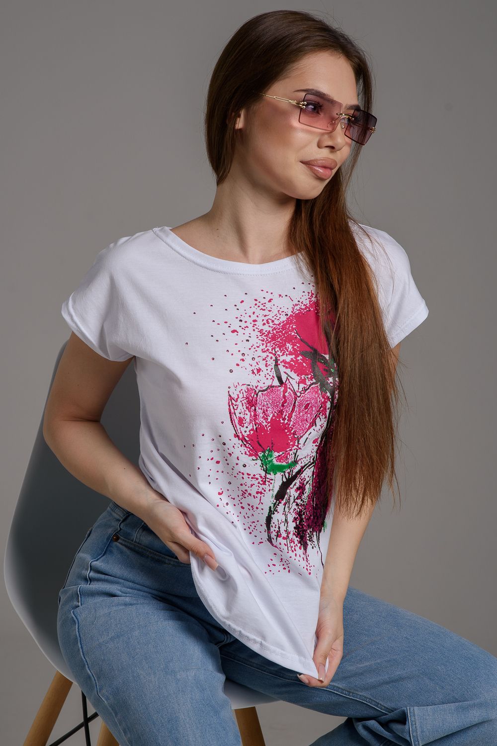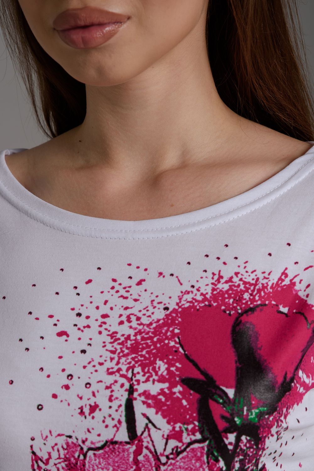 Футболка полуприлегающего силуэта, средней длины, с округлой горловиной. Рукав цельнокроеный, короткий.