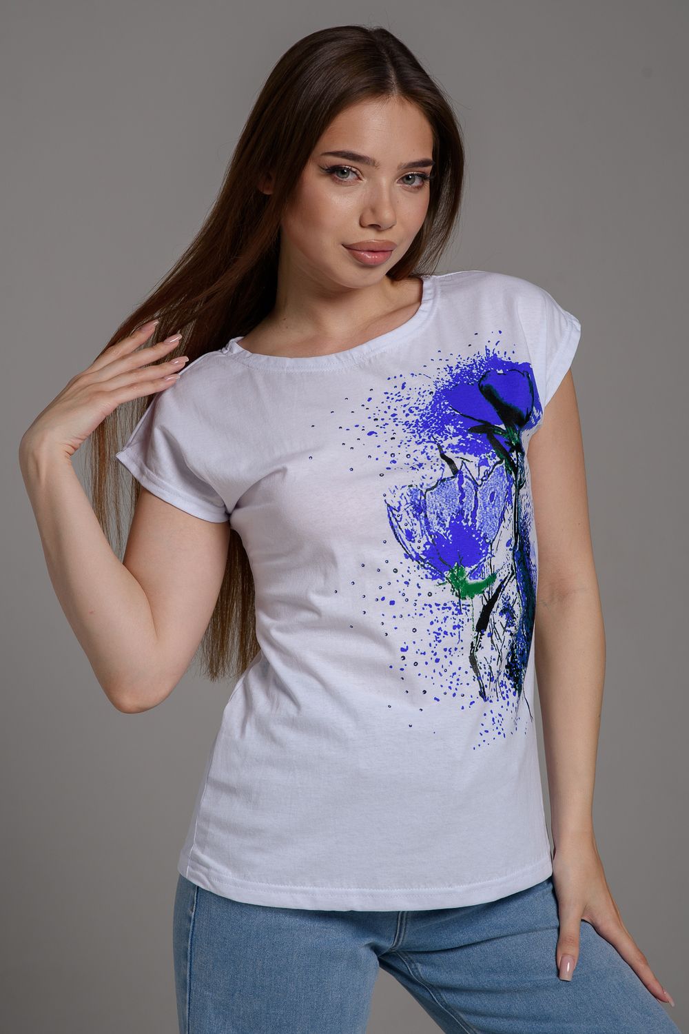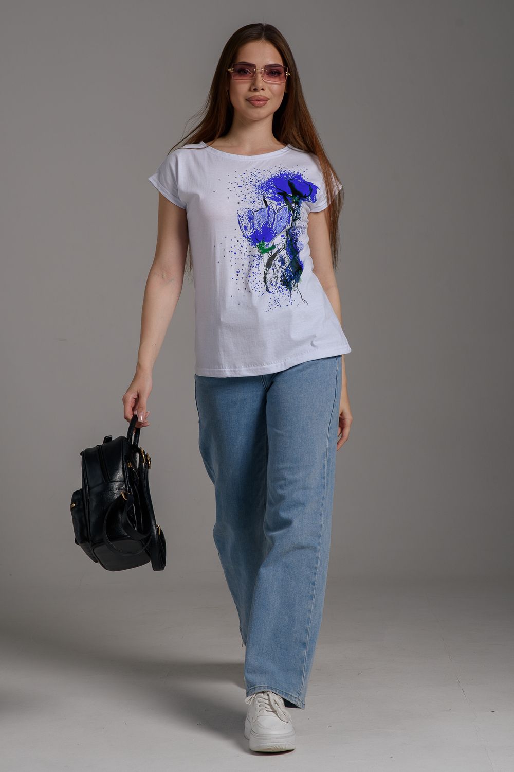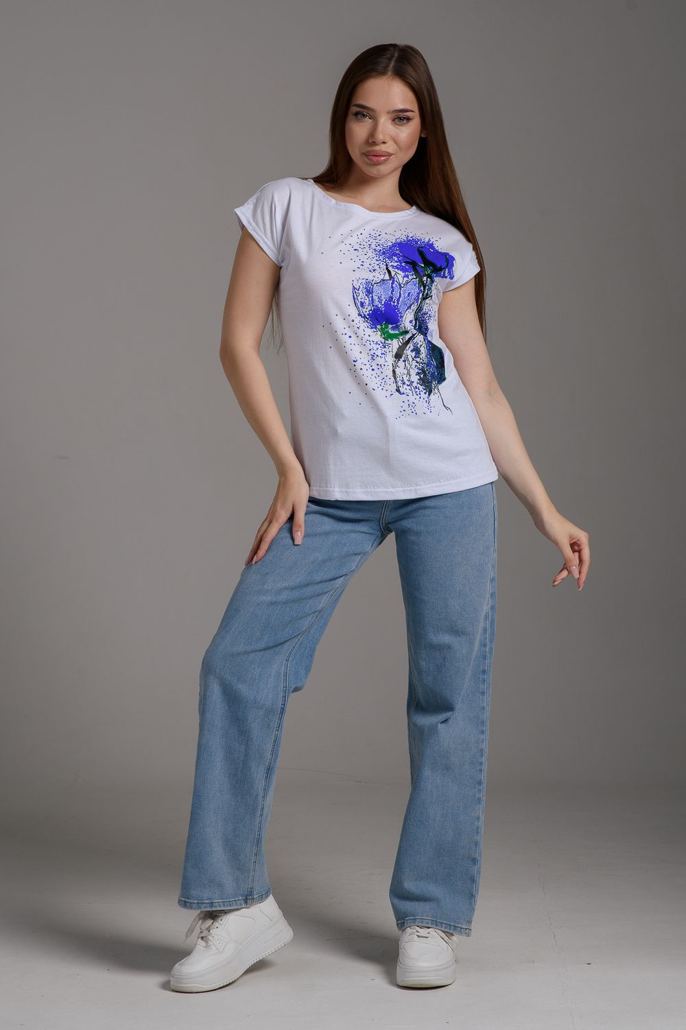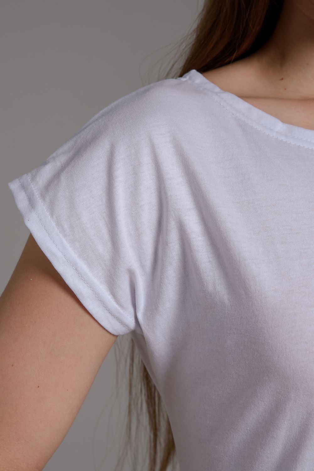 Футболка полуприлегающего силуэта, средней длины, с округлой горловиной. Рукав цельнокроеный, короткий.