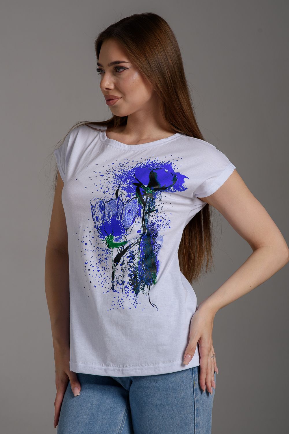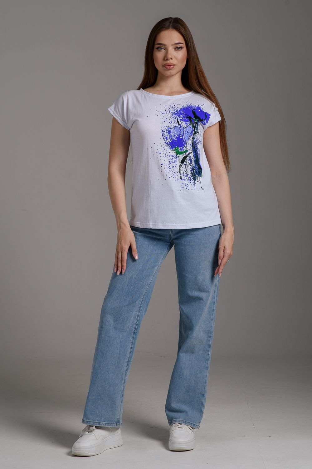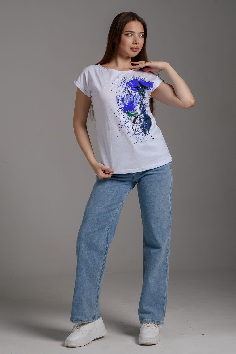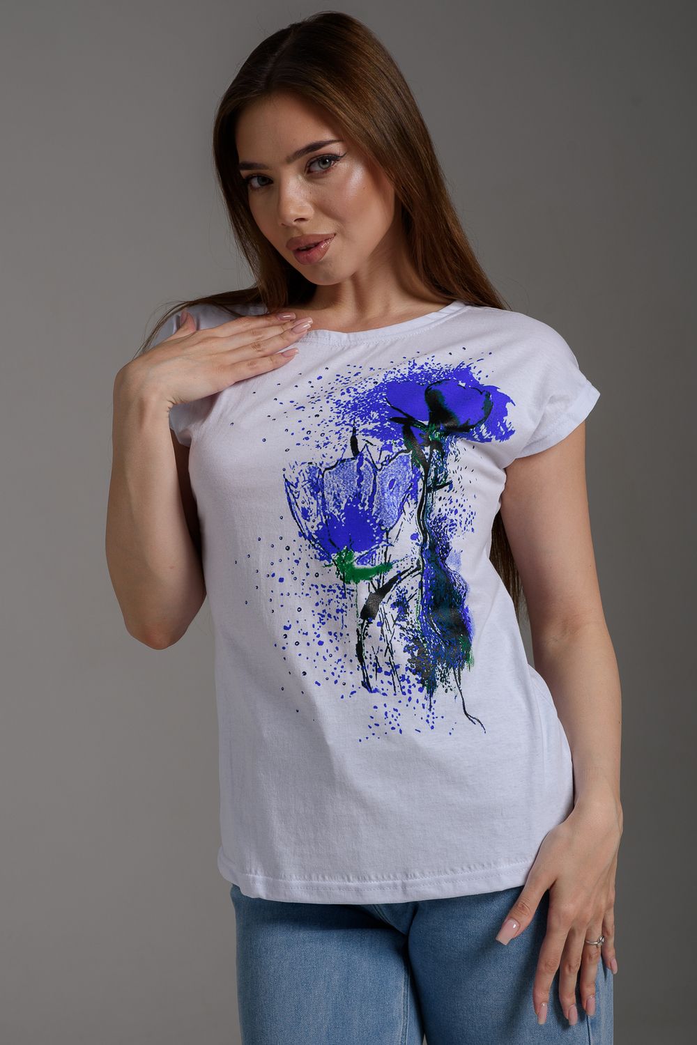 Футболка полуприлегающего силуэта, средней длины, с округлой горловиной. Рукав цельнокроеный, короткий.