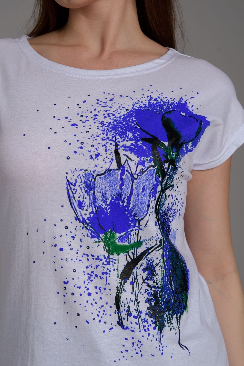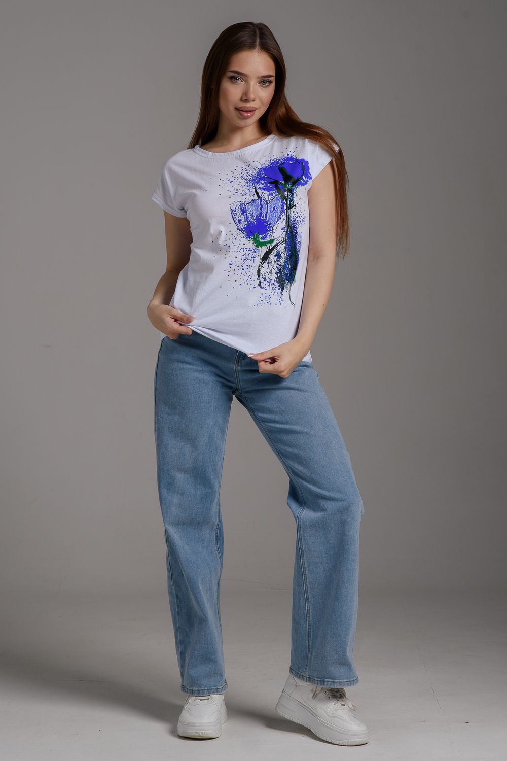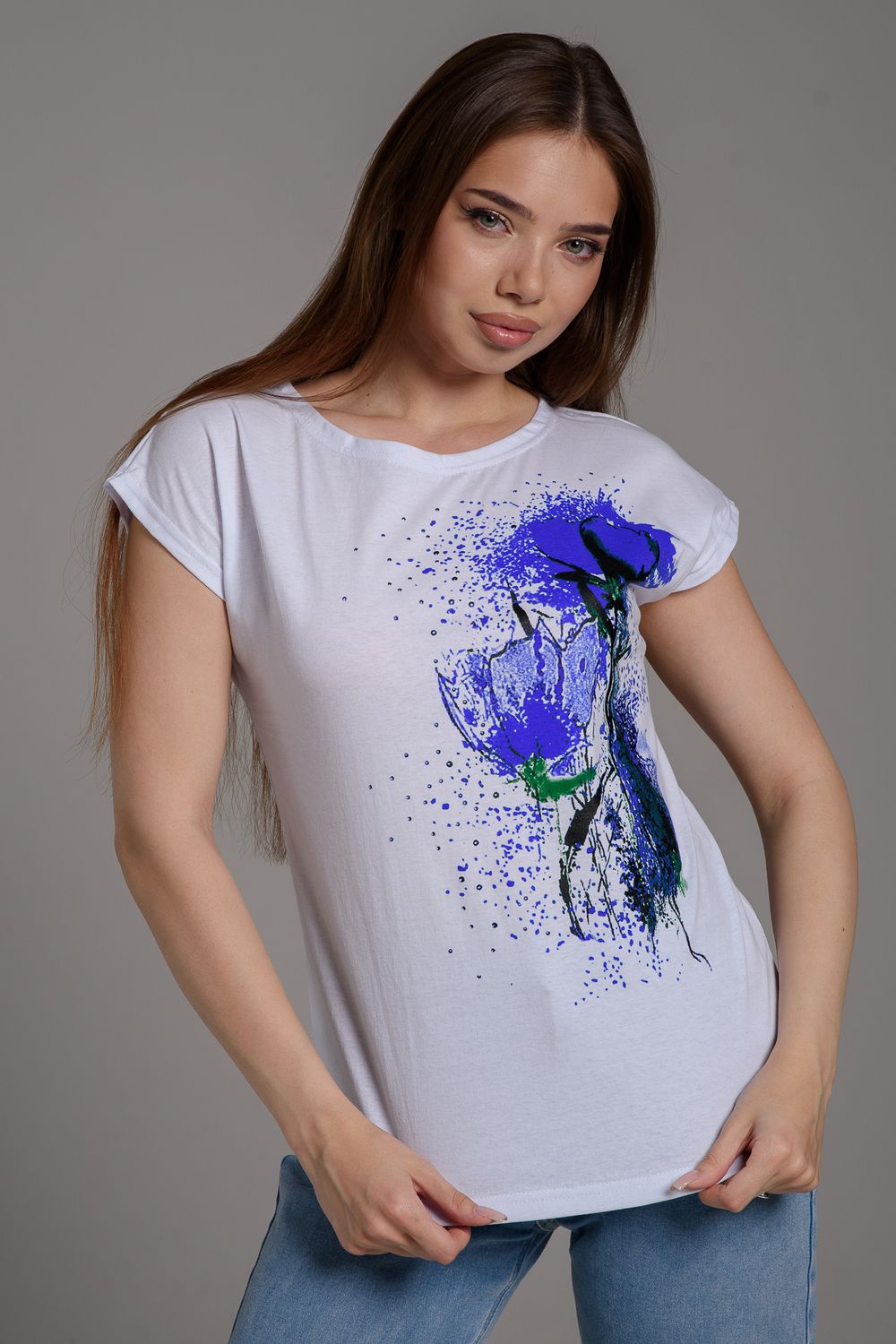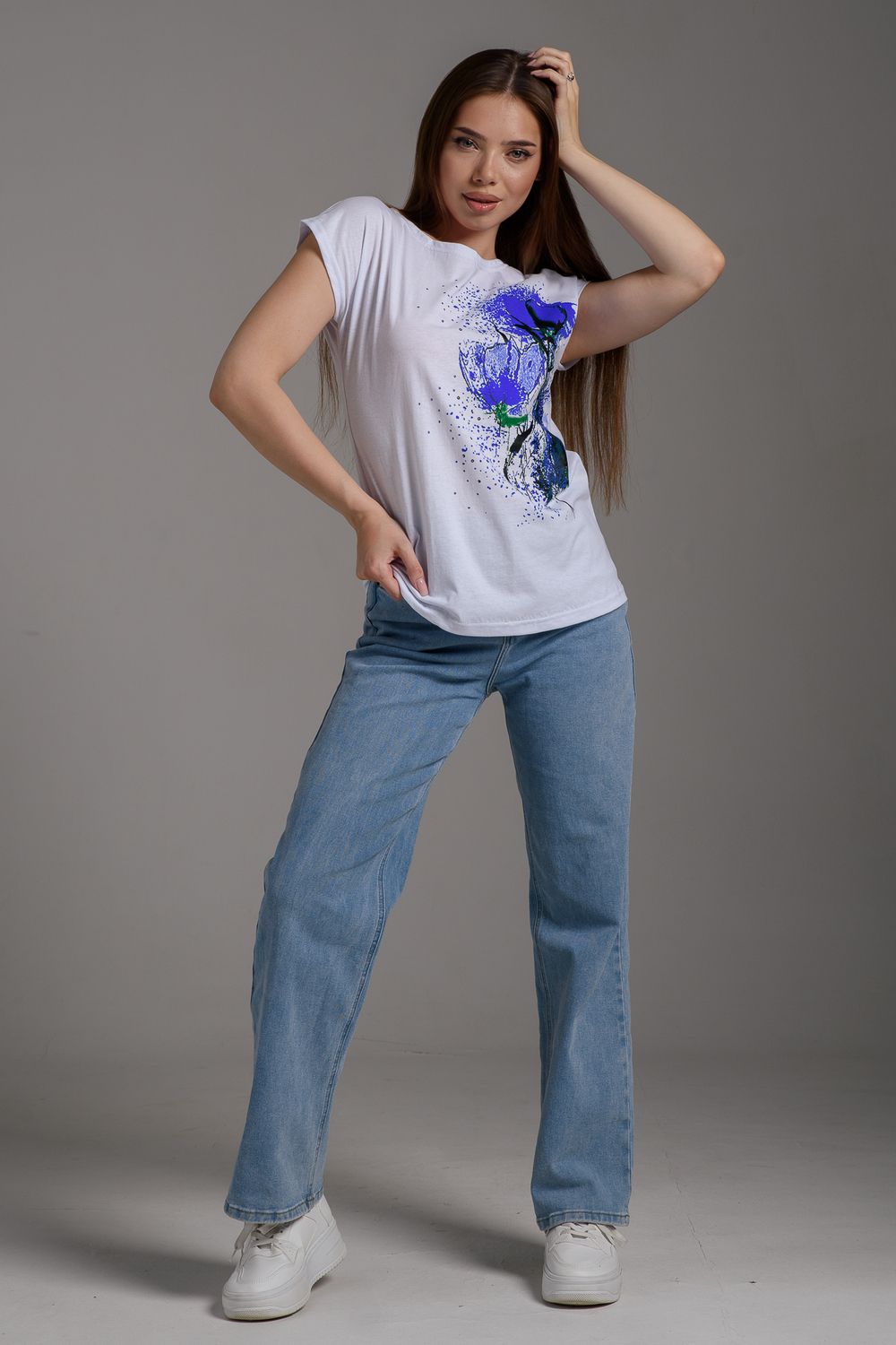 Футболка полуприлегающего силуэта, средней длины, с округлой горловиной. Рукав цельнокроеный, короткий.