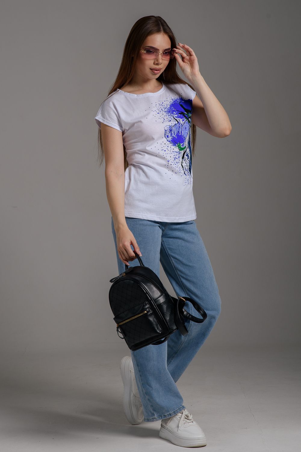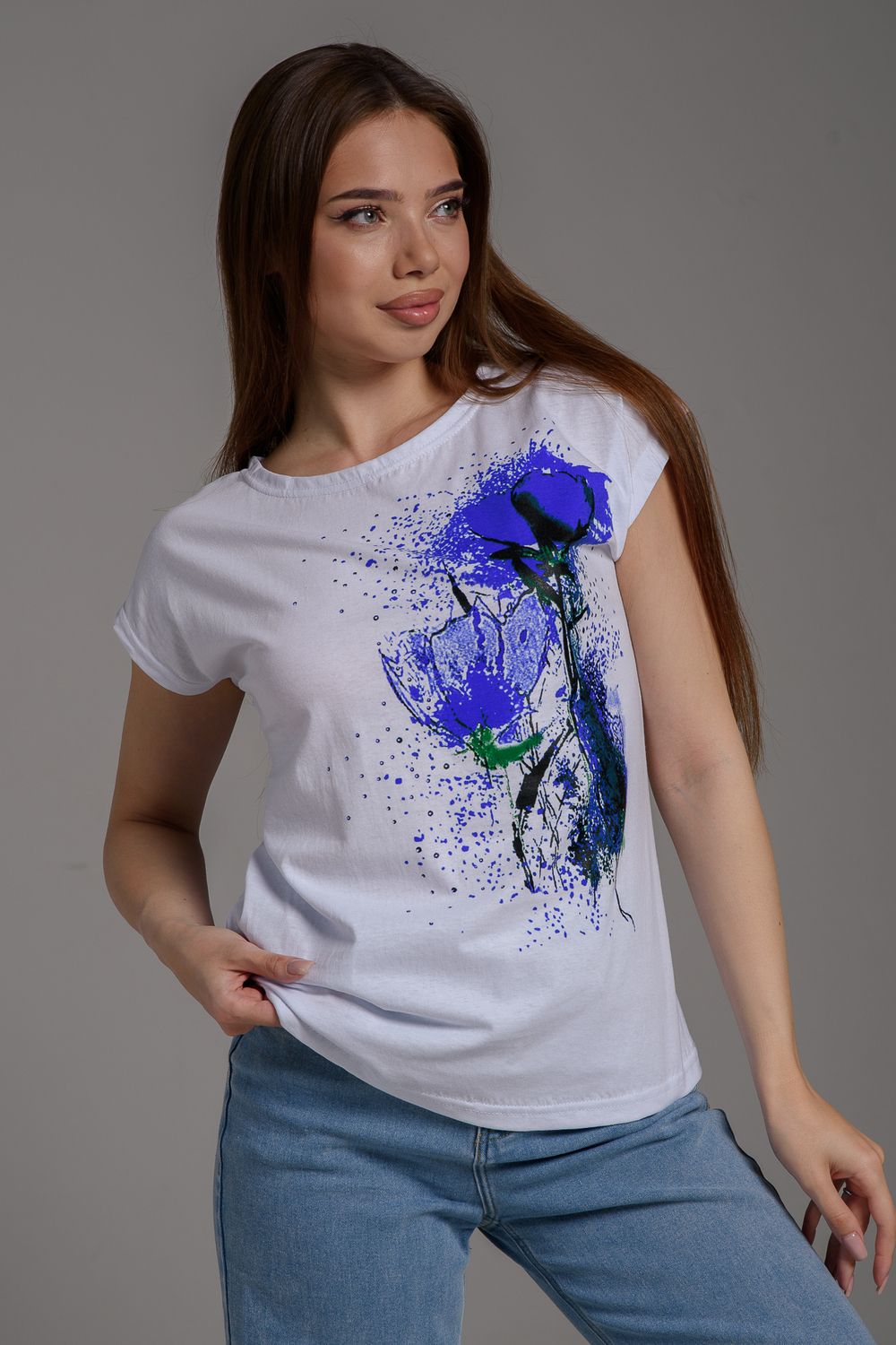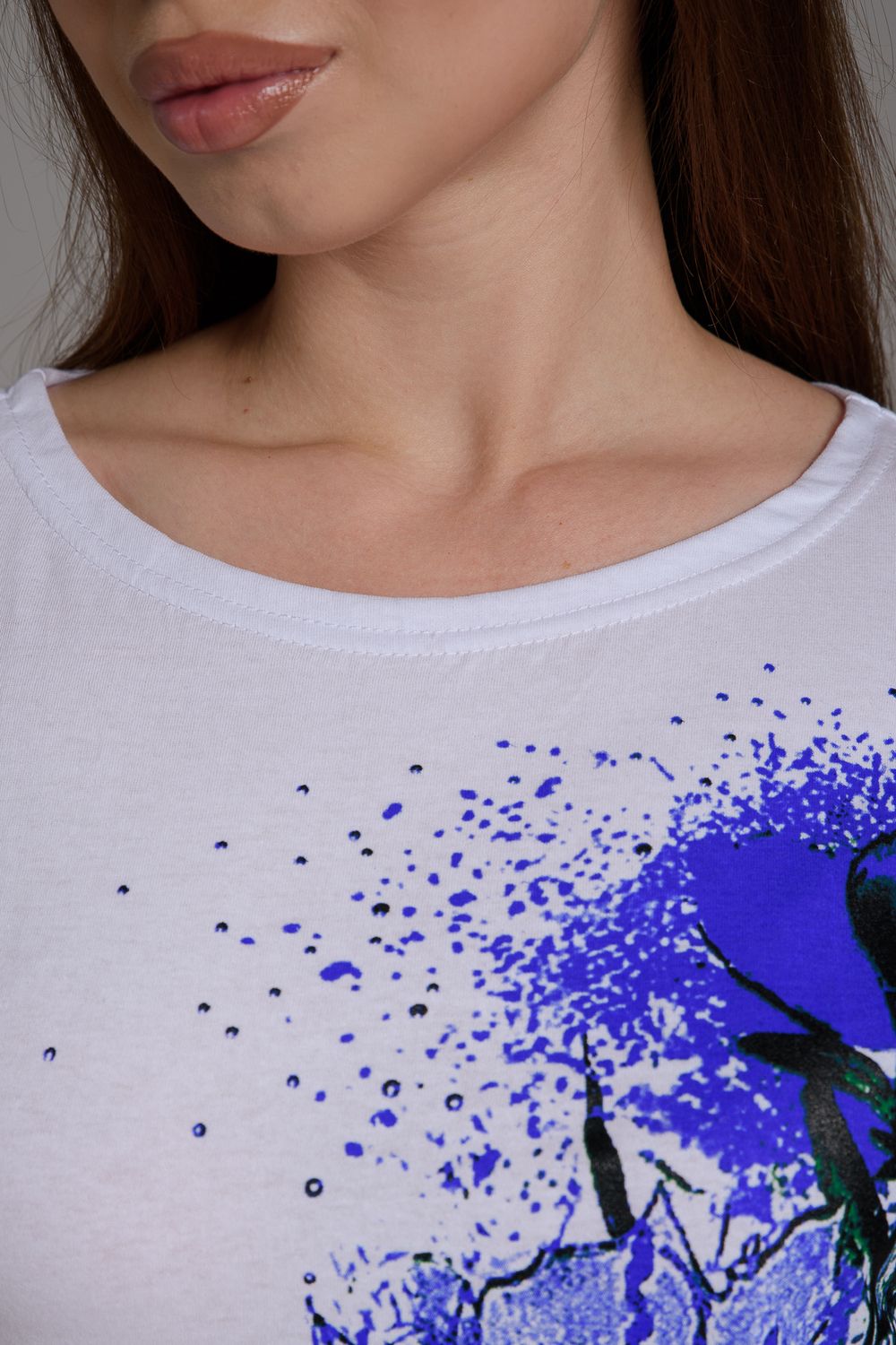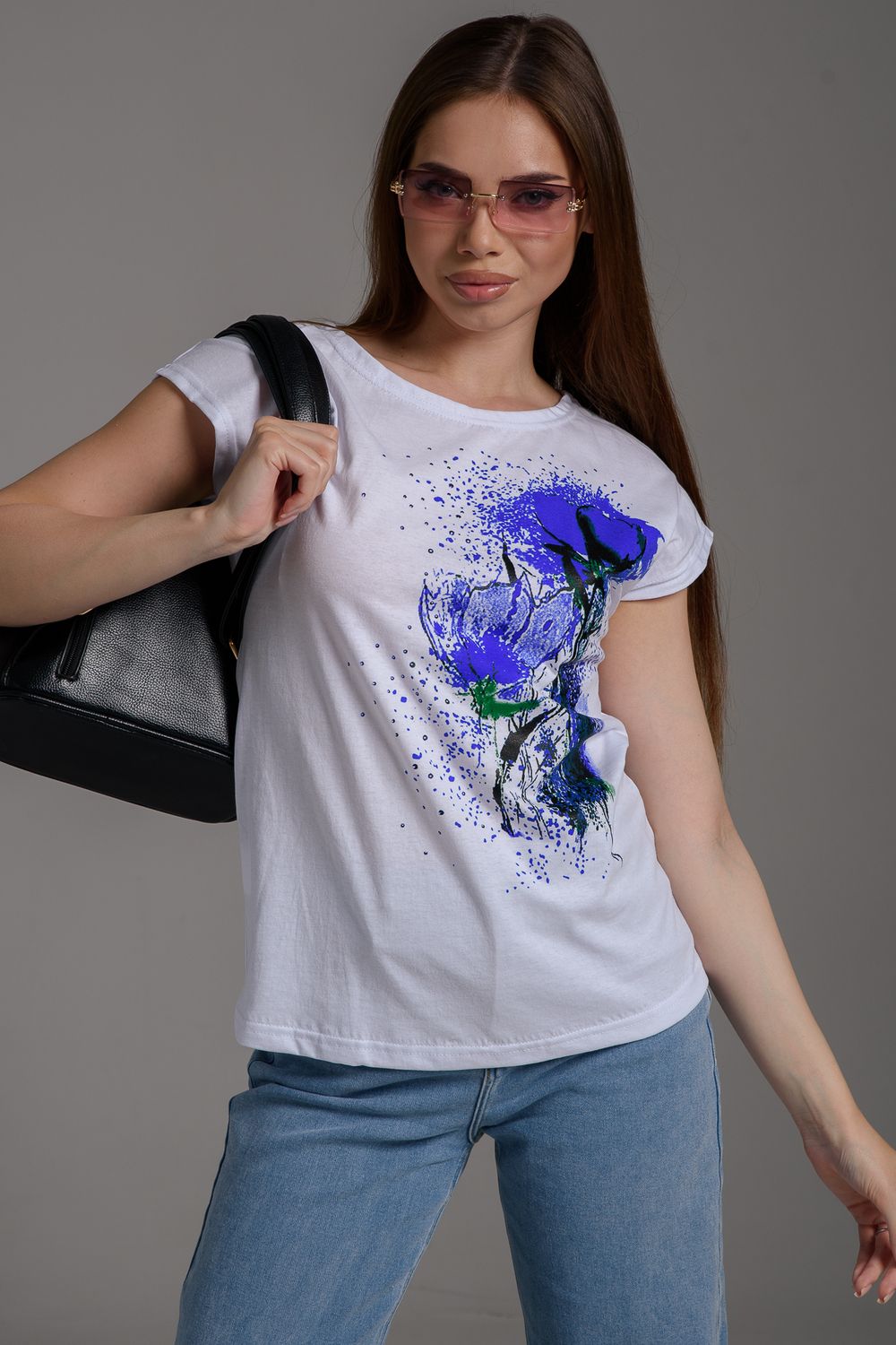 Футболка полуприлегающего силуэта, средней длины, с округлой горловиной. Рукав цельнокроеный, короткий.