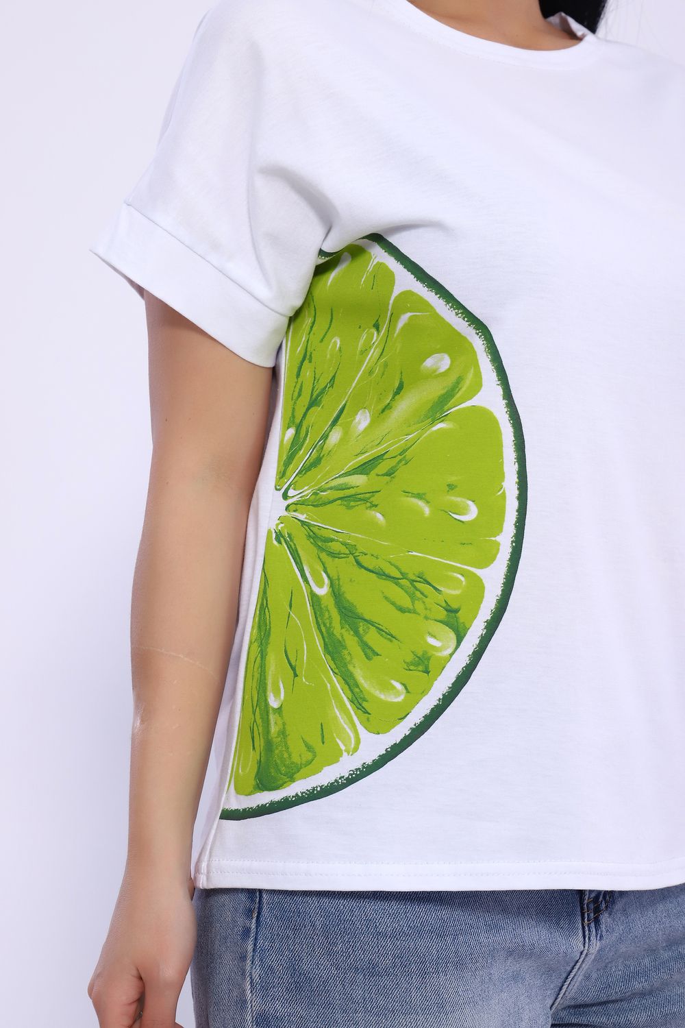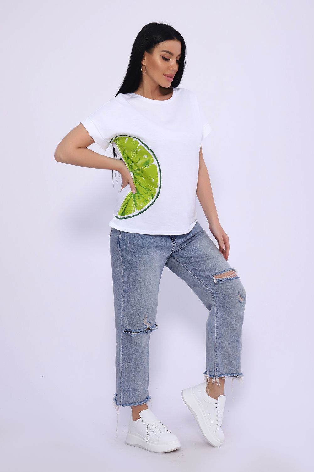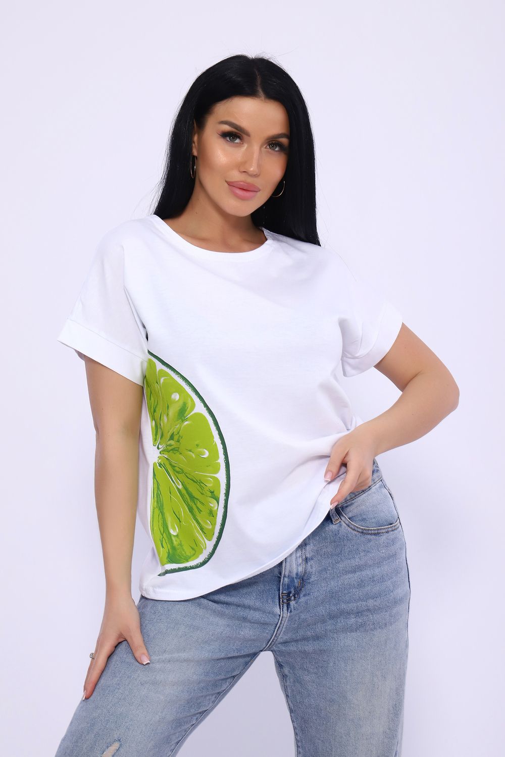 Футболка женская с ярким 3-Д принтом, из кулирки высокого качества пенье компакт. Модель свободного кроя, горловина в виде "лодочки", спущенная пройма на манжете. Стильная, приятная к телу из 100% хлопка футболка необходимая вещь в гардеробе современной девушки.