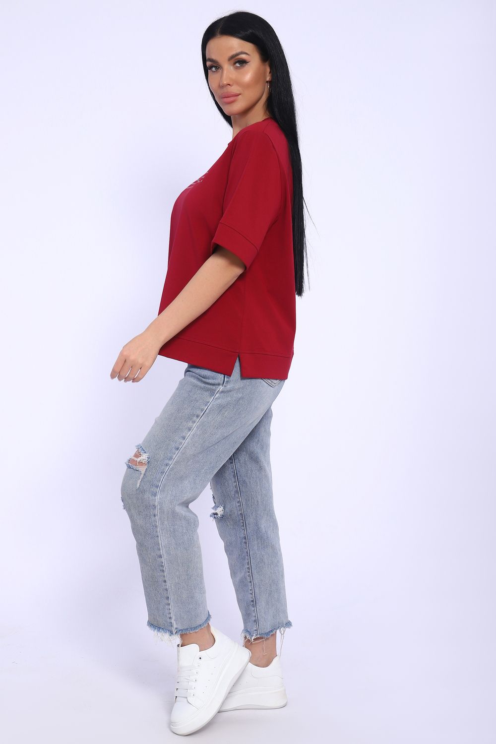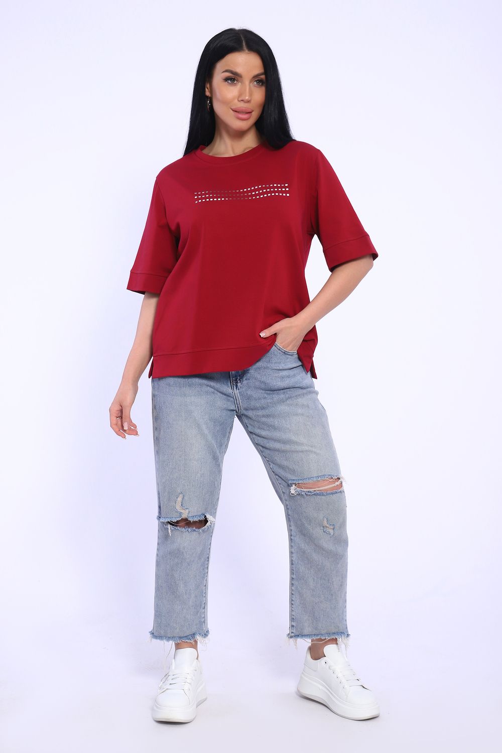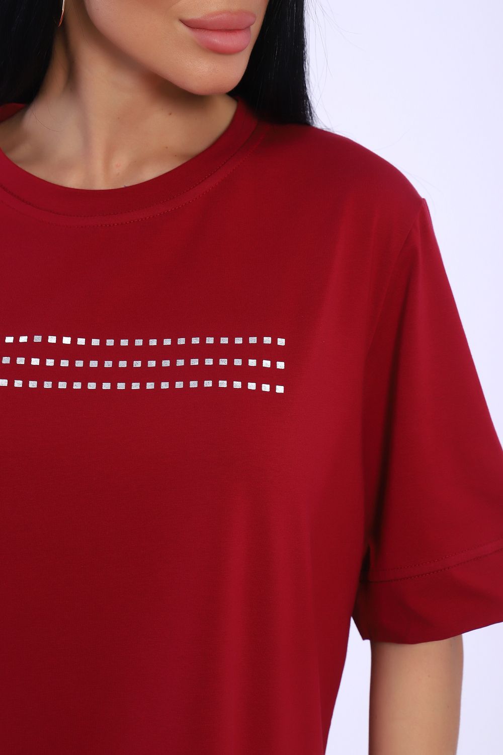 Футболка женская с мерцающим принтом из плотной, высокого качества кулирки с лайкрой пенье. Модель свободного силуэта, короткий рукав с широким манжетом, низ футболки обработан широкой планкой , по бокам небольшие разрезы. Стильная, удобная футболка для девушек разного возраста и фигуры, скроет недостатки и подчеркнёт достоинства.