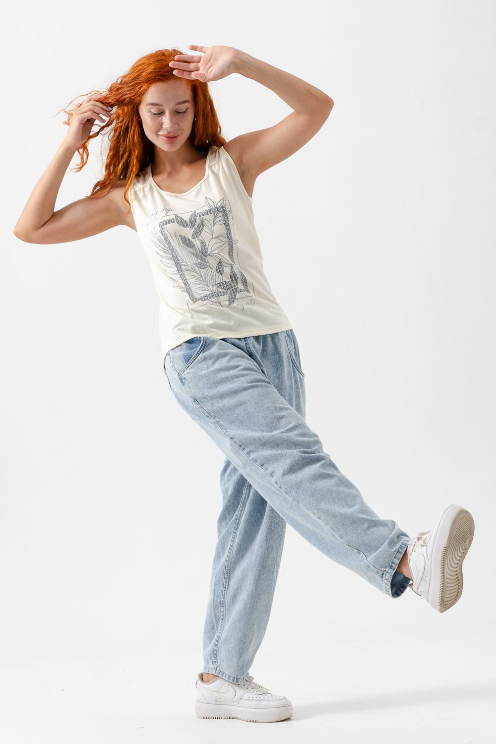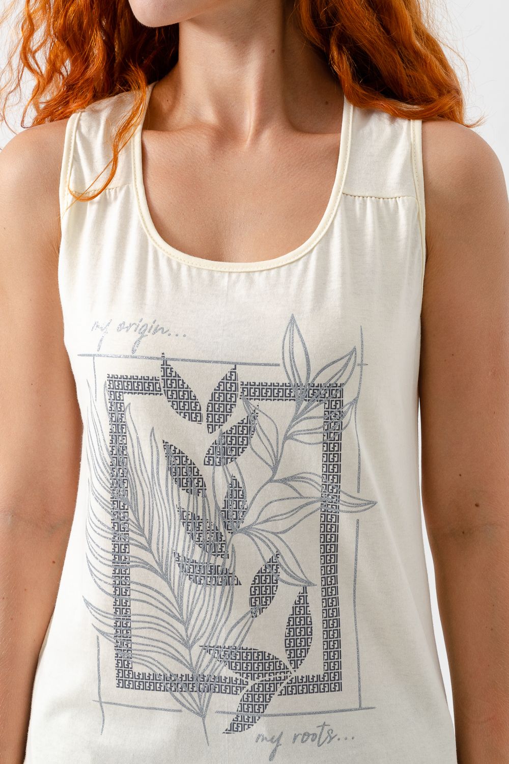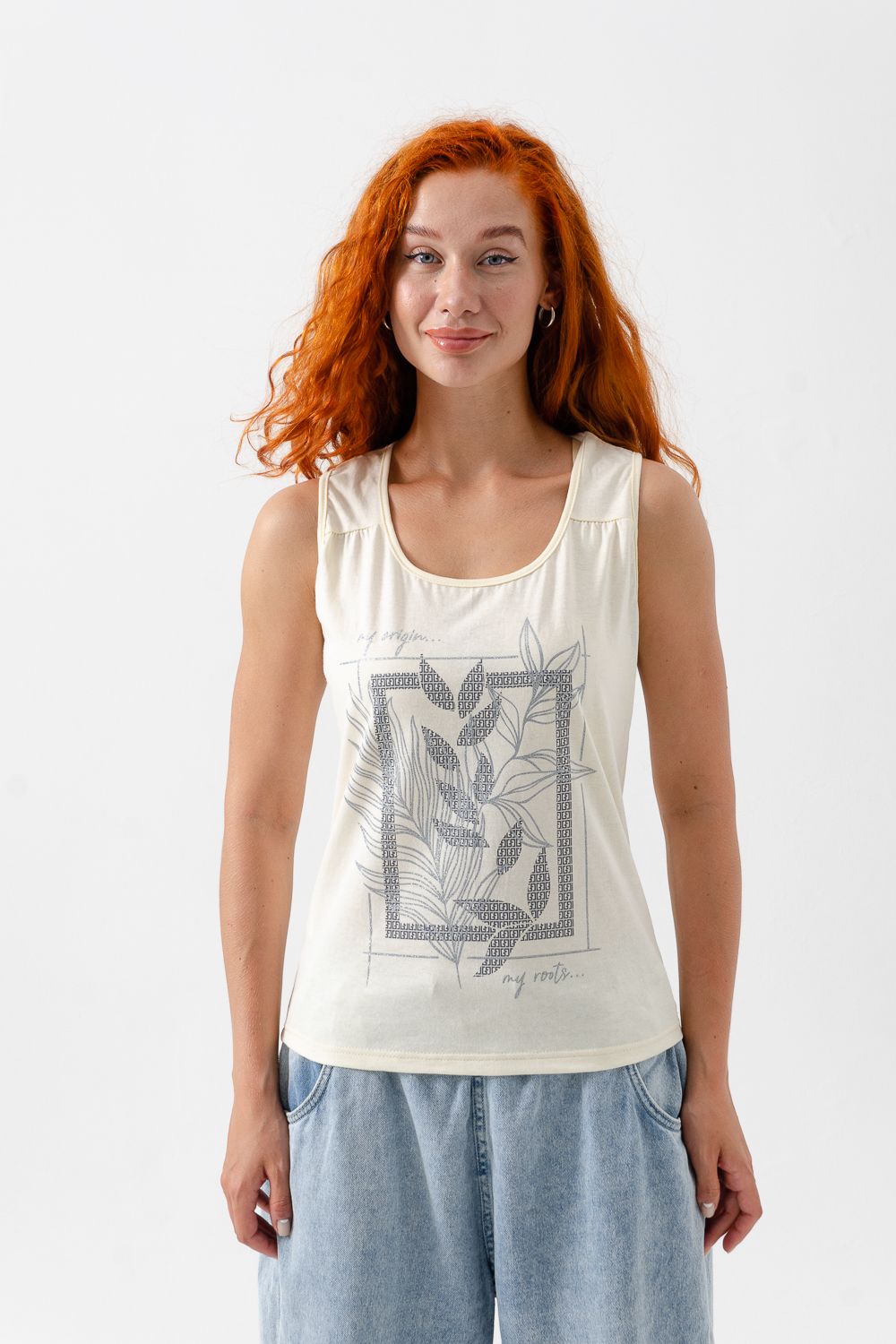 Майка прилегающего силуэта, с округлой горловиной. Полочка с кокетками. Горловина, проймы обработаны бейкой из основного полотна.