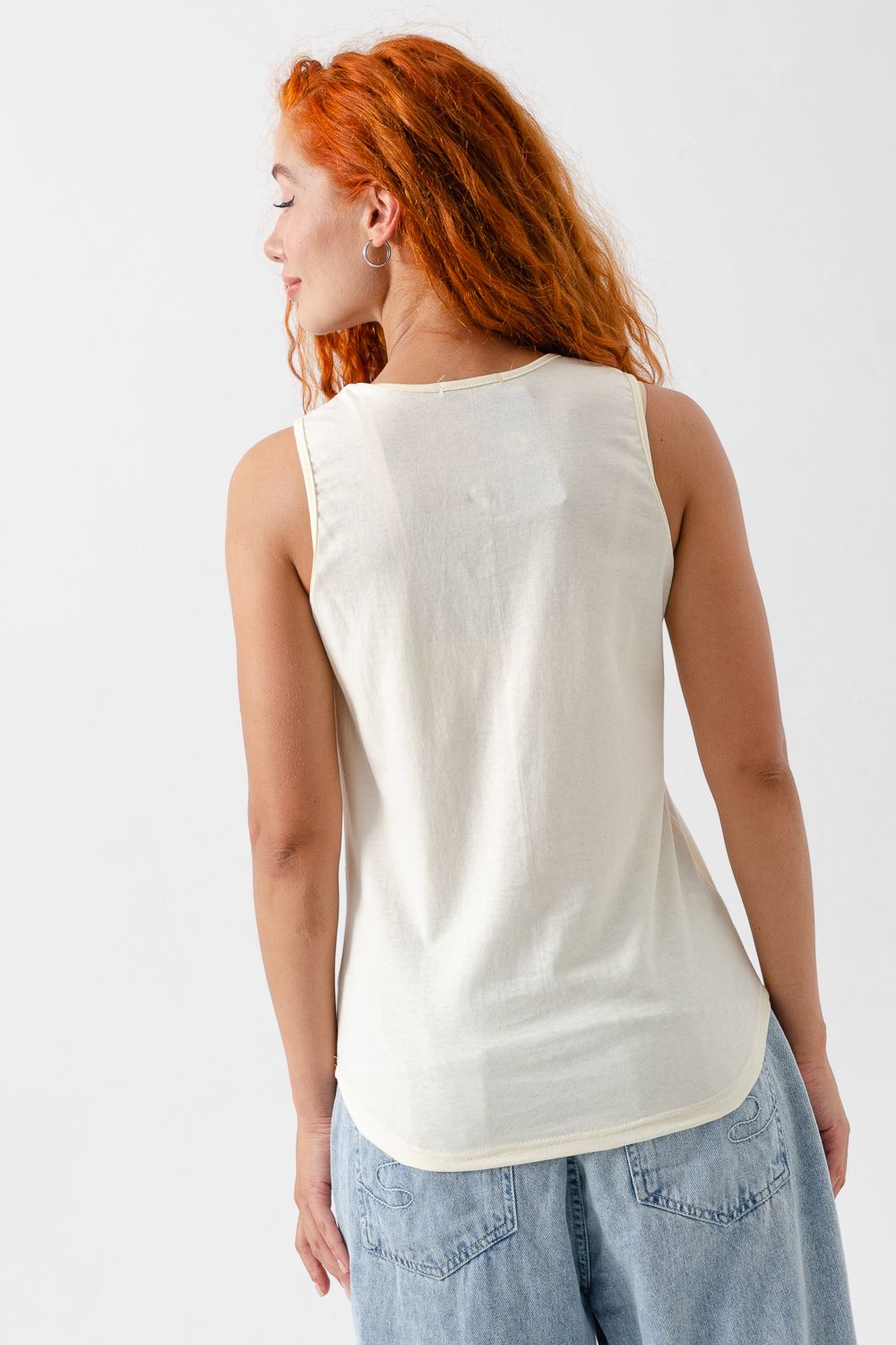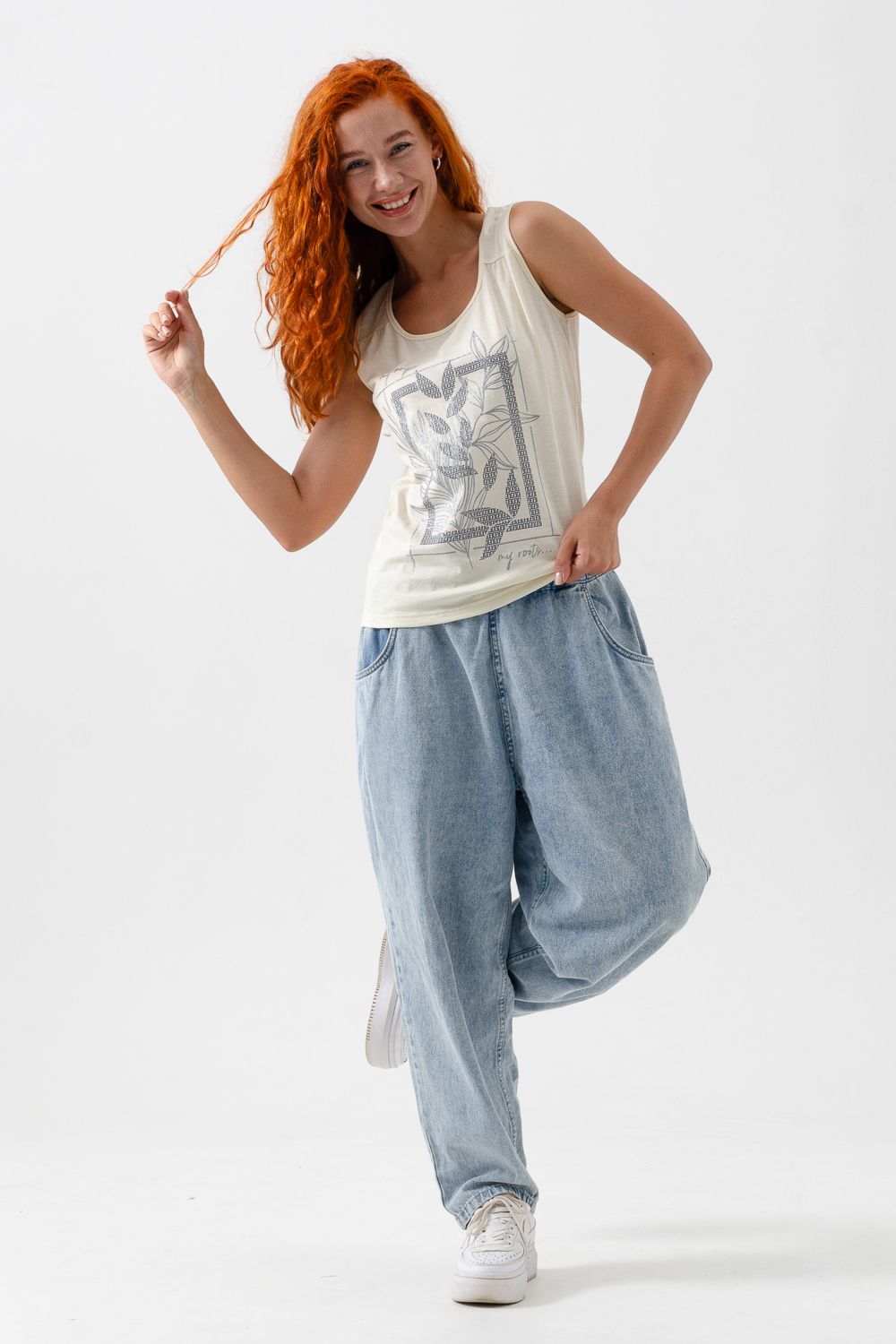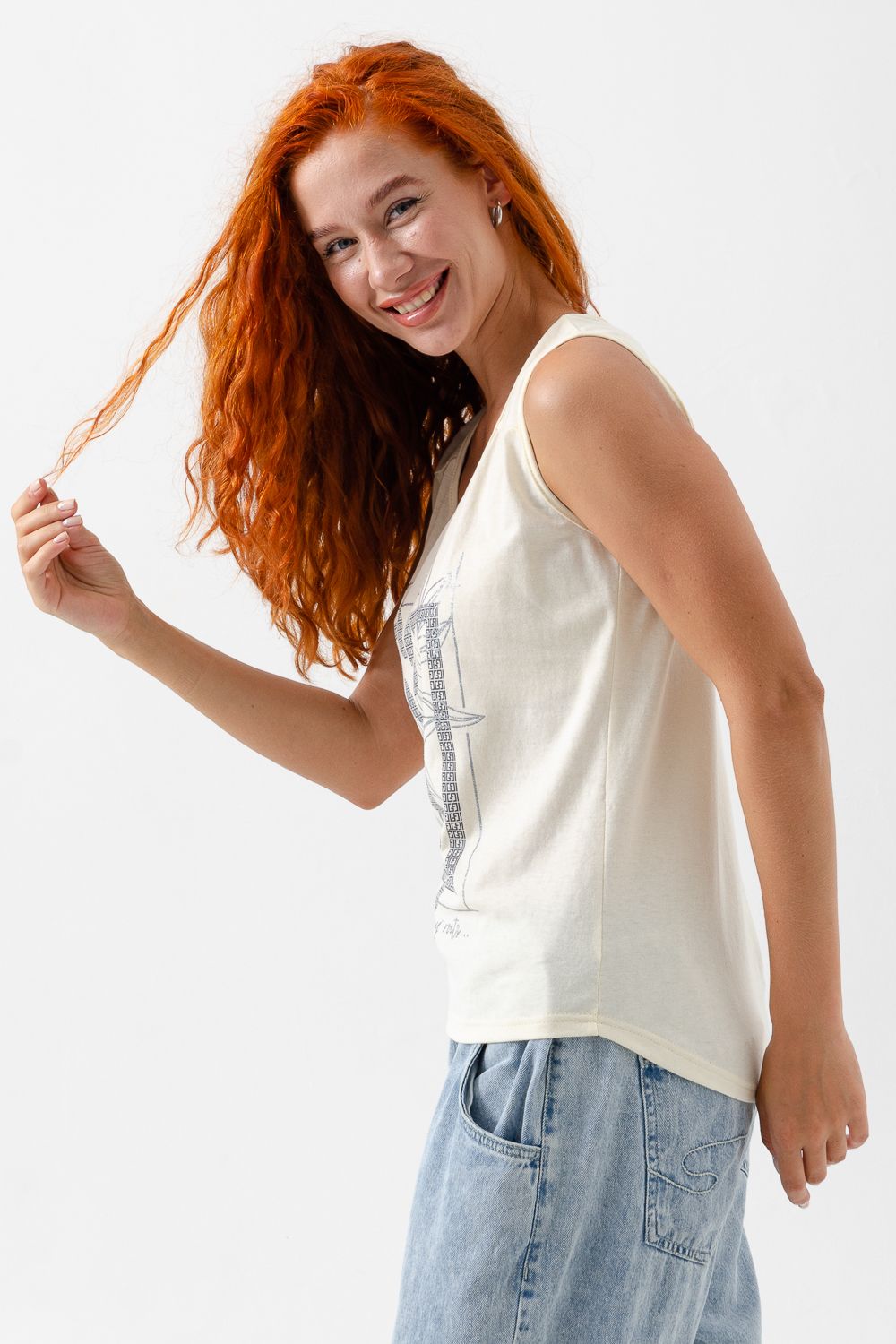 Майка прилегающего силуэта, с округлой горловиной. Полочка с кокетками. Горловина, проймы обработаны бейкой из основного полотна.
