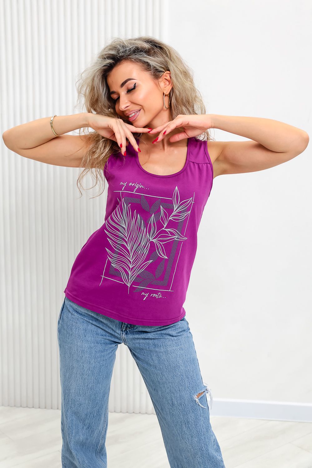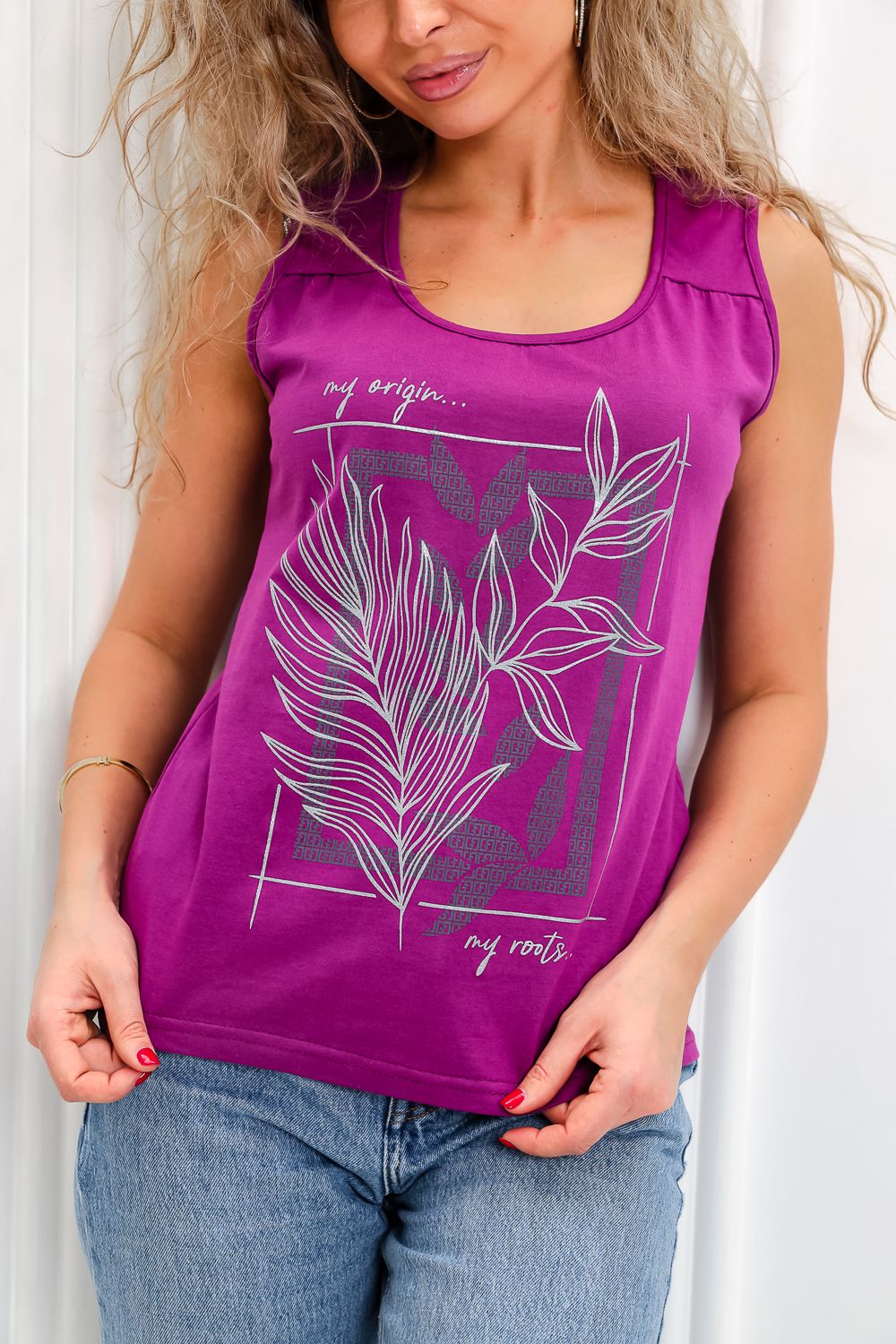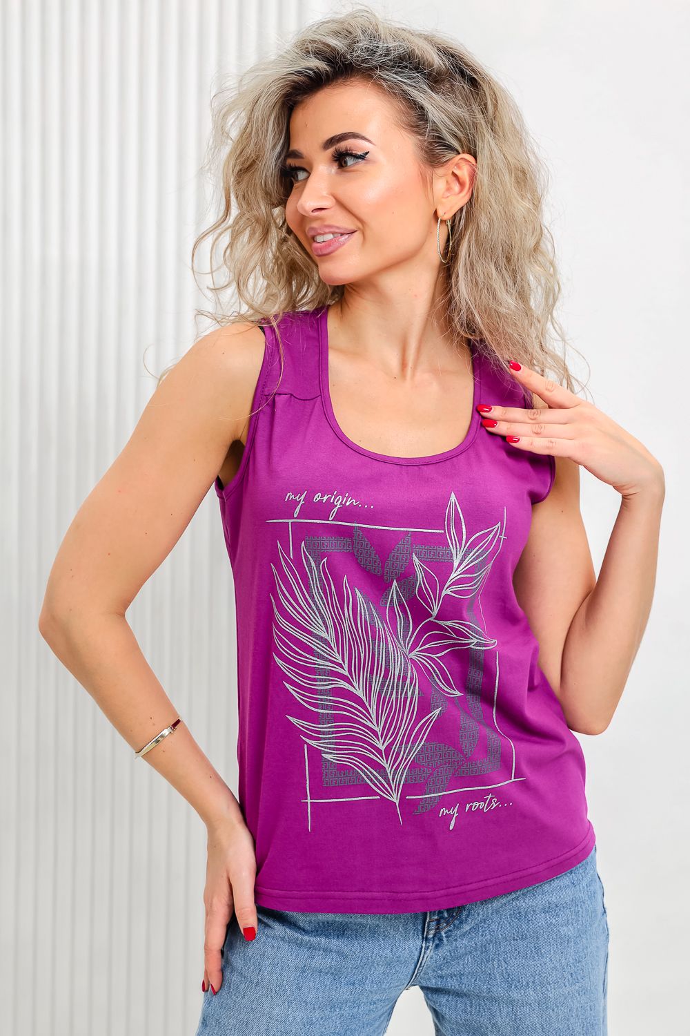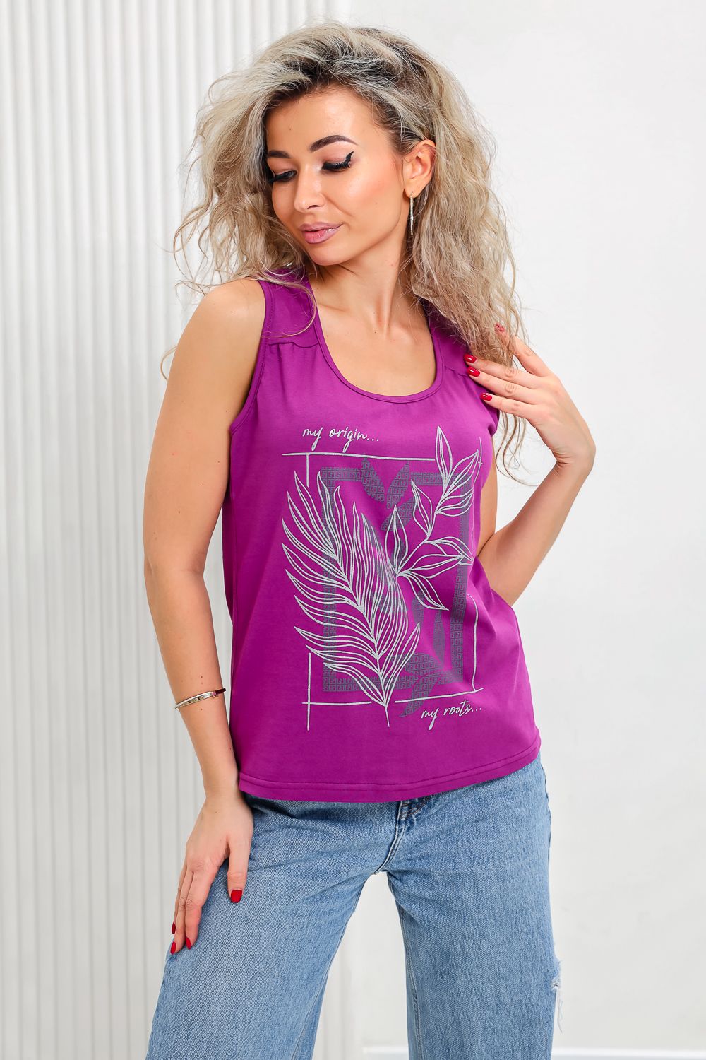 Майка прилегающего силуэта, с округлой горловиной. Полочка с кокетками. Горловина, проймы обработаны бейкой из основного полотна.