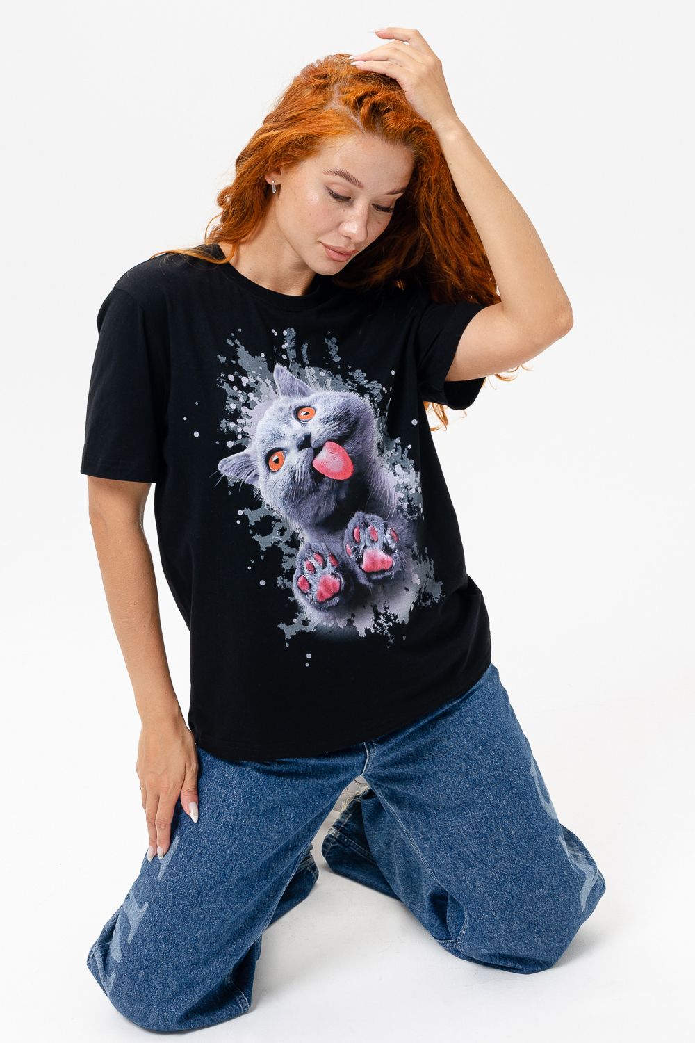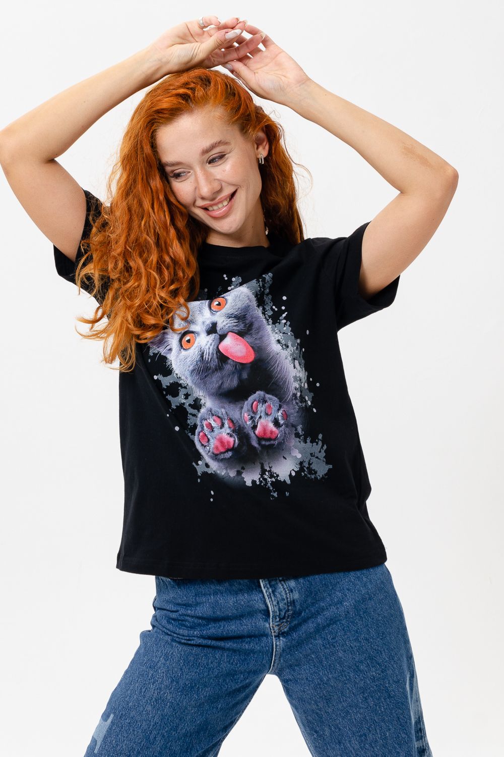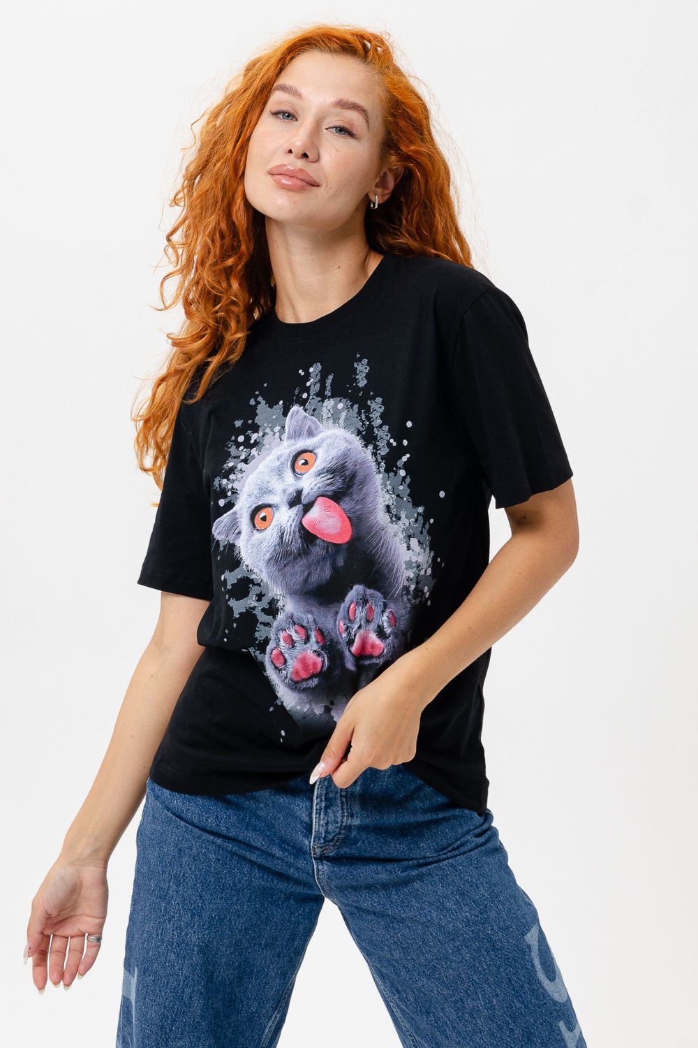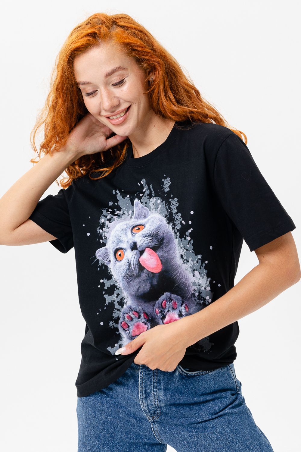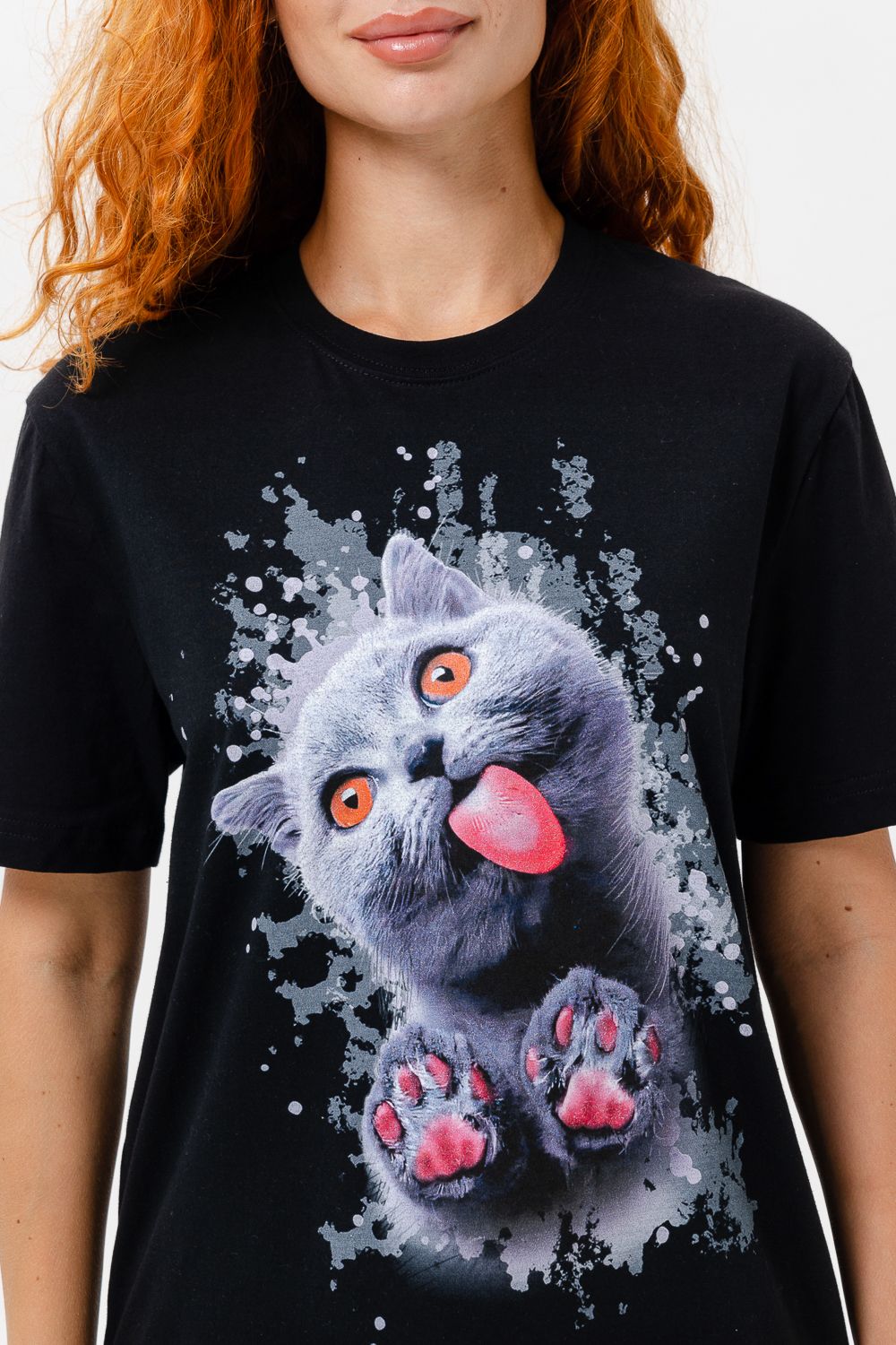 Футболка женская 8488 - черный+кошка