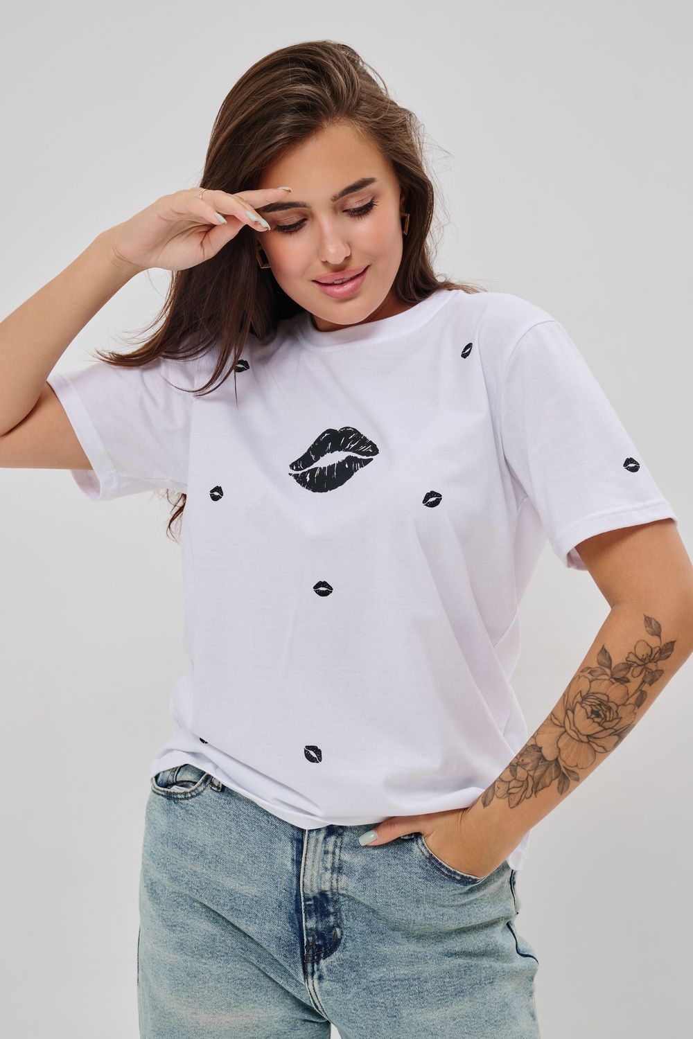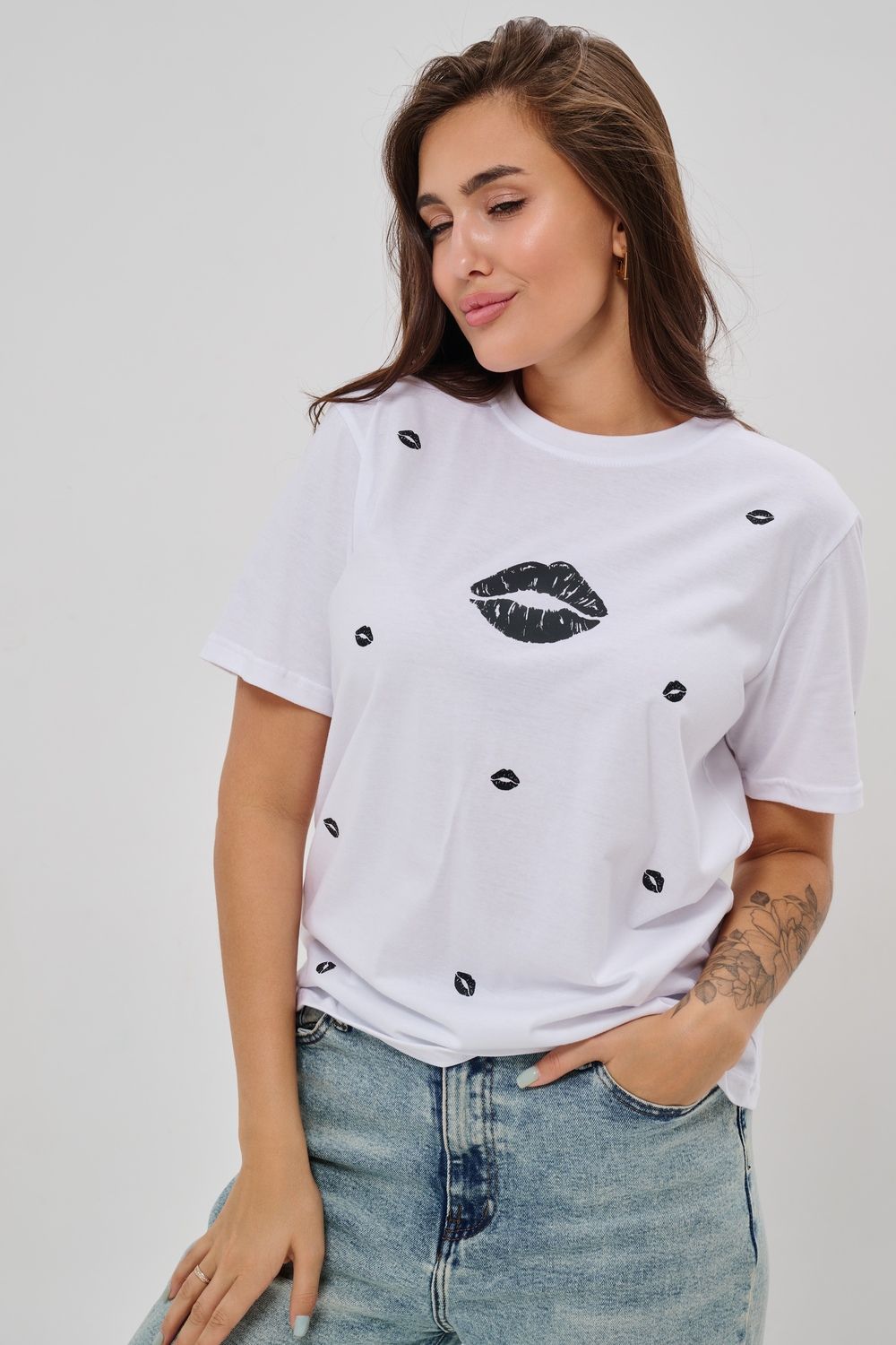 Женская футболка приталенного силуэта, выполненная из мягкой и приятной к телу кулирки. Модель отличается лаконичностью и удобством благодаря укороченным рукавам и аккуратному круглому вырезу горловины. Изюминкой изделия являются маленькие минималистичные принты в виде груб, выполненные в чёрном оттенке. Футболка универсальна, легко сочетается с различными элементами гардероба и станет отличным выбором для повседневной носки, подчёркивая женственную фигуру и индивидуальность своей обладательницы.