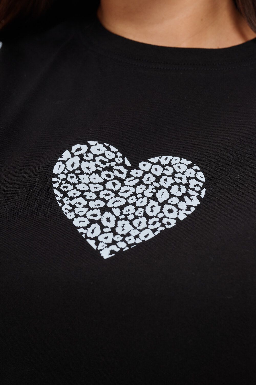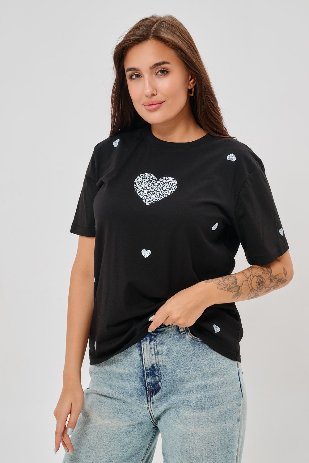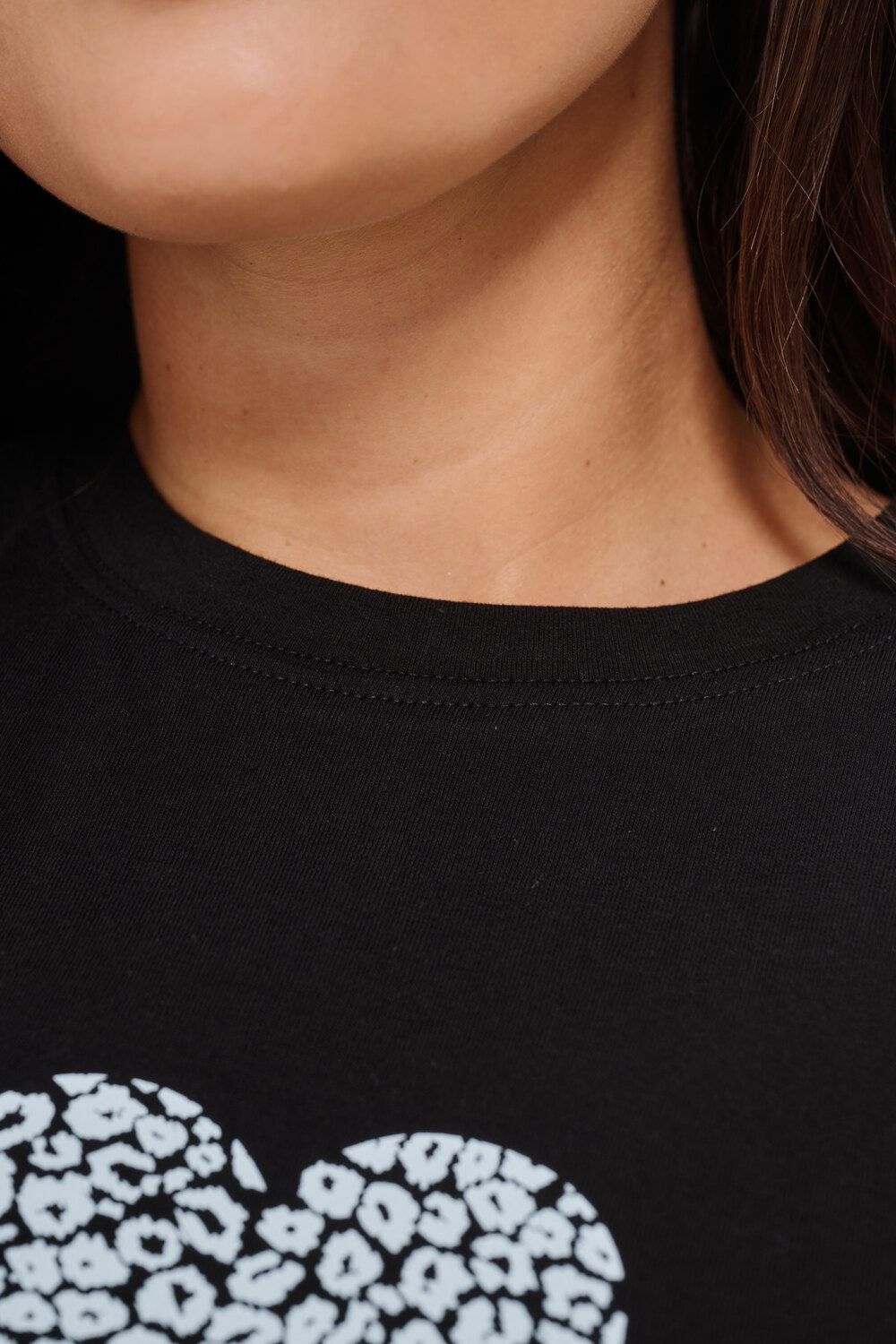 Женская футболка элегантного приталенного кроя с короткими рукавами и классическим круглым вырезом горловины. Минималистичный дизайн дополнен нежными маленькими принтами в форме сердец с леопардовым узором, создающими тонкий акцент на образ. Материал приятен к телу, обеспечивает комфорт и свободу движений. Идеально подойдет для повседневного стиля, подчеркивая женственность и утонченность облика обладательницы.