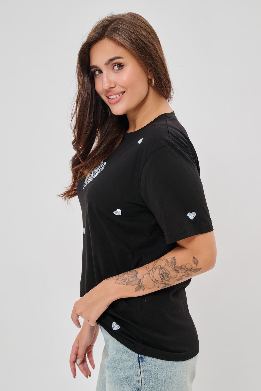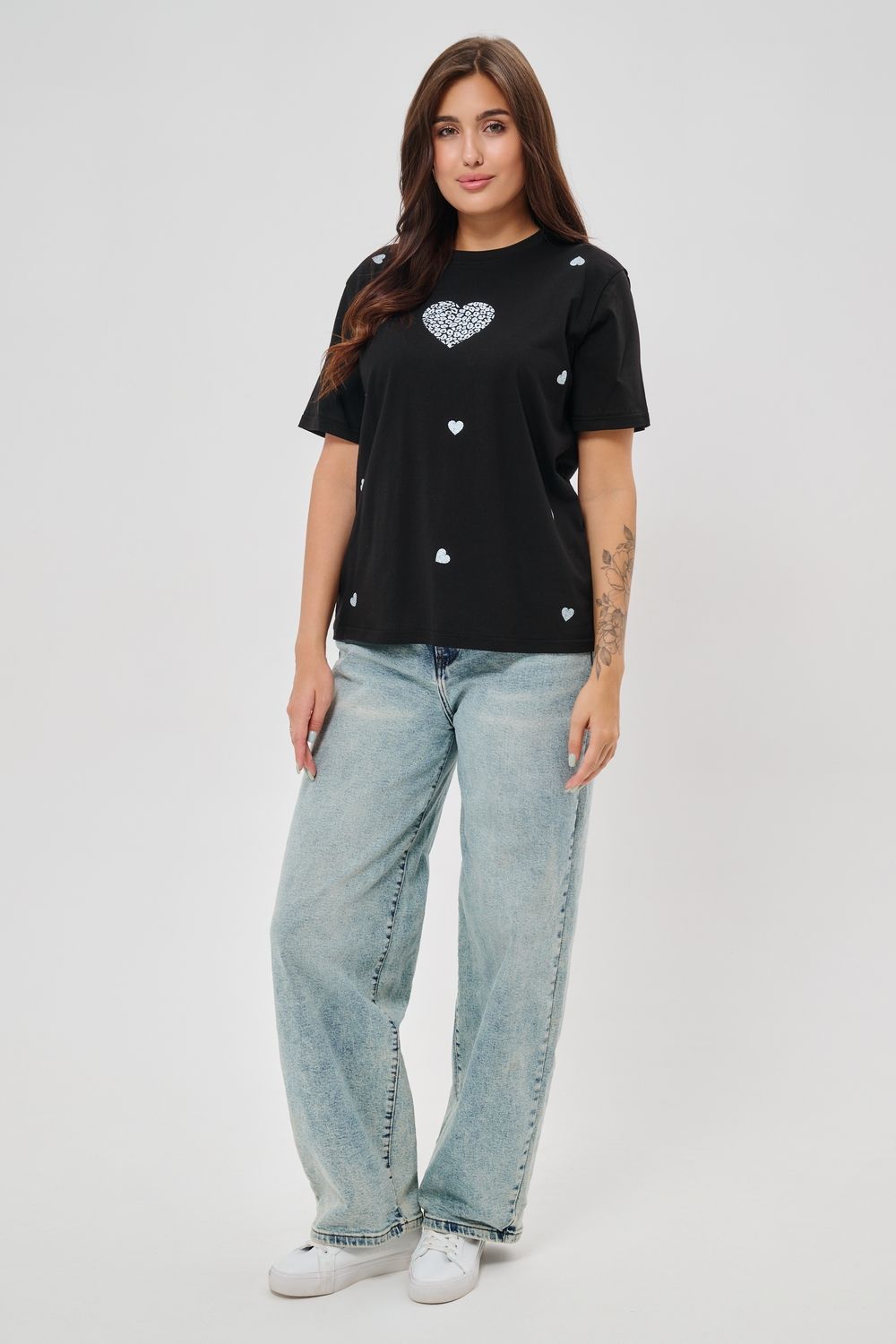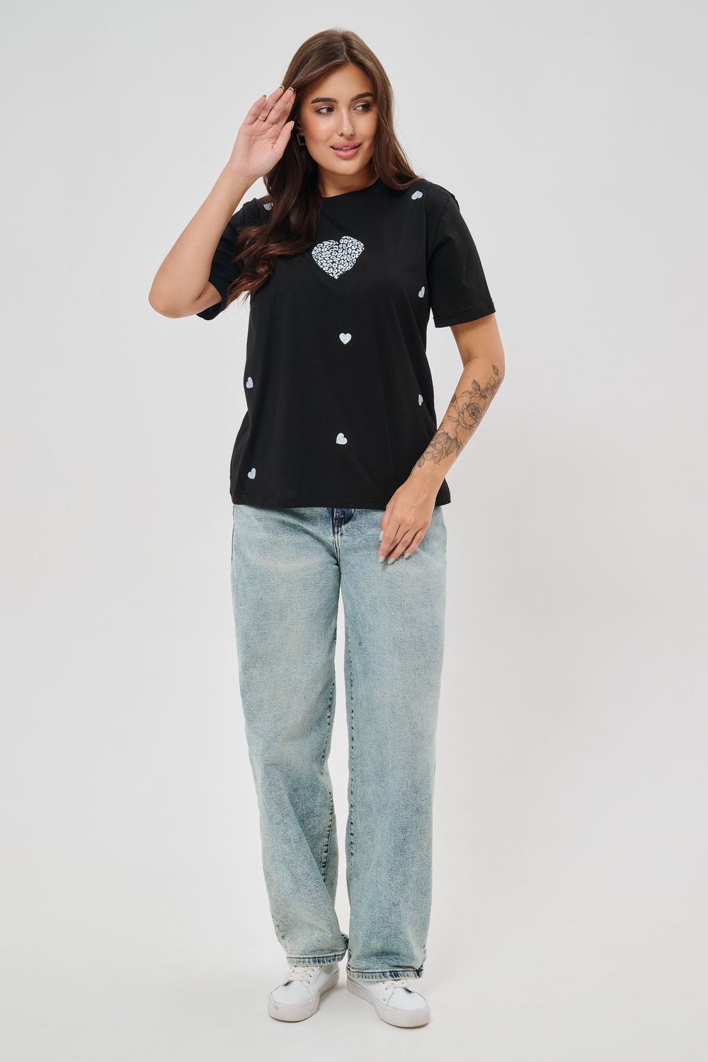 Женская футболка элегантного приталенного кроя с короткими рукавами и классическим круглым вырезом горловины. Минималистичный дизайн дополнен нежными маленькими принтами в форме сердец с леопардовым узором, создающими тонкий акцент на образ. Материал приятен к телу, обеспечивает комфорт и свободу движений. Идеально подойдет для повседневного стиля, подчеркивая женственность и утонченность облика обладательницы.