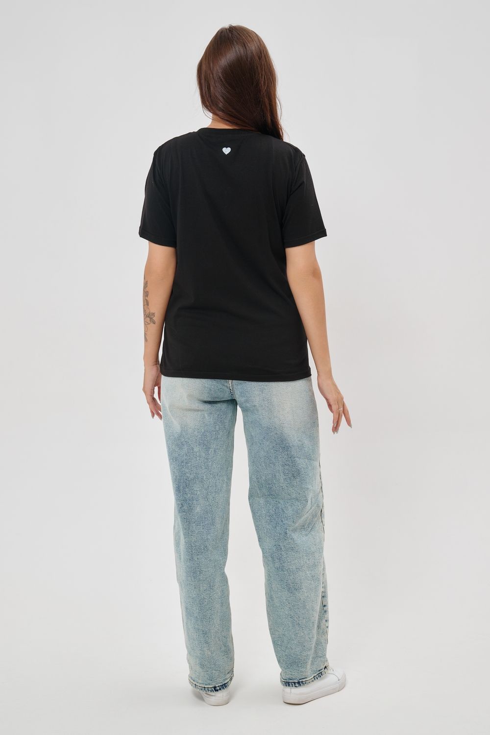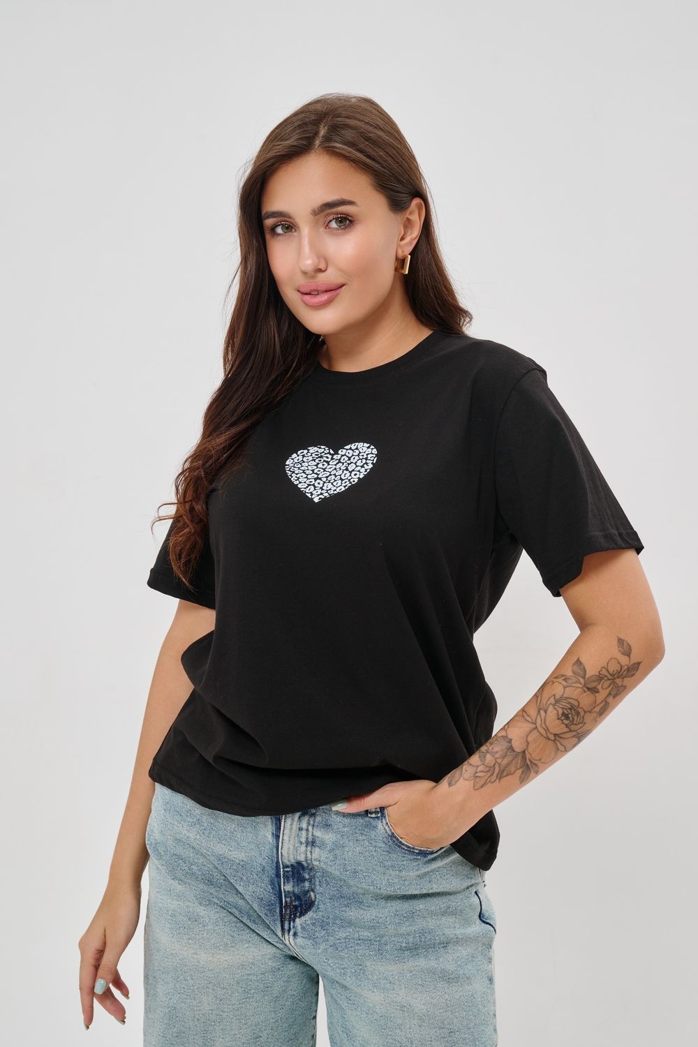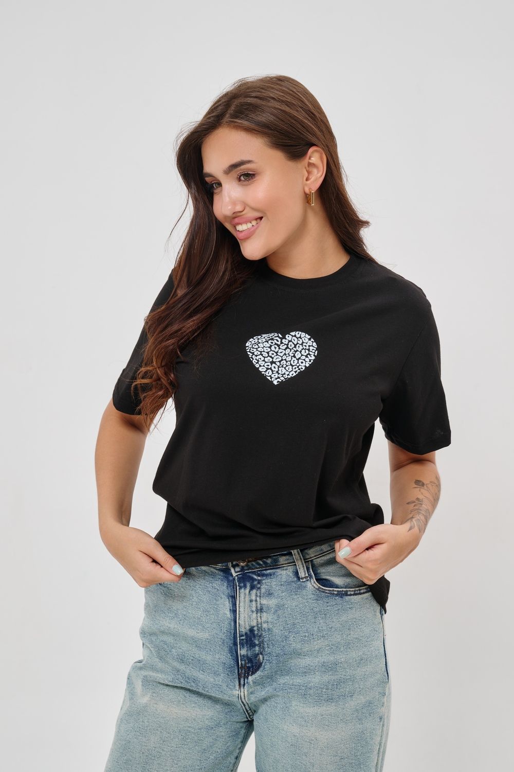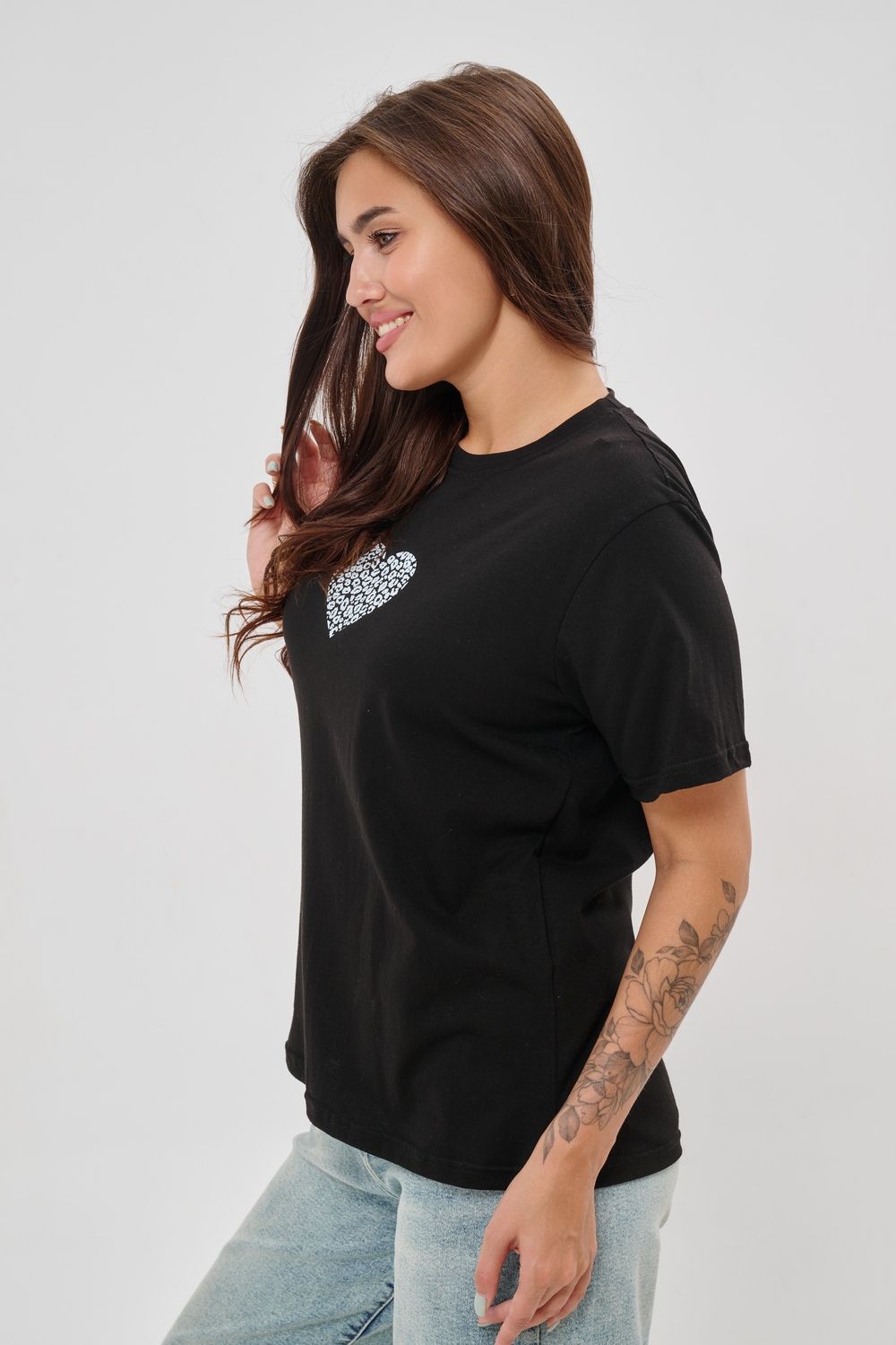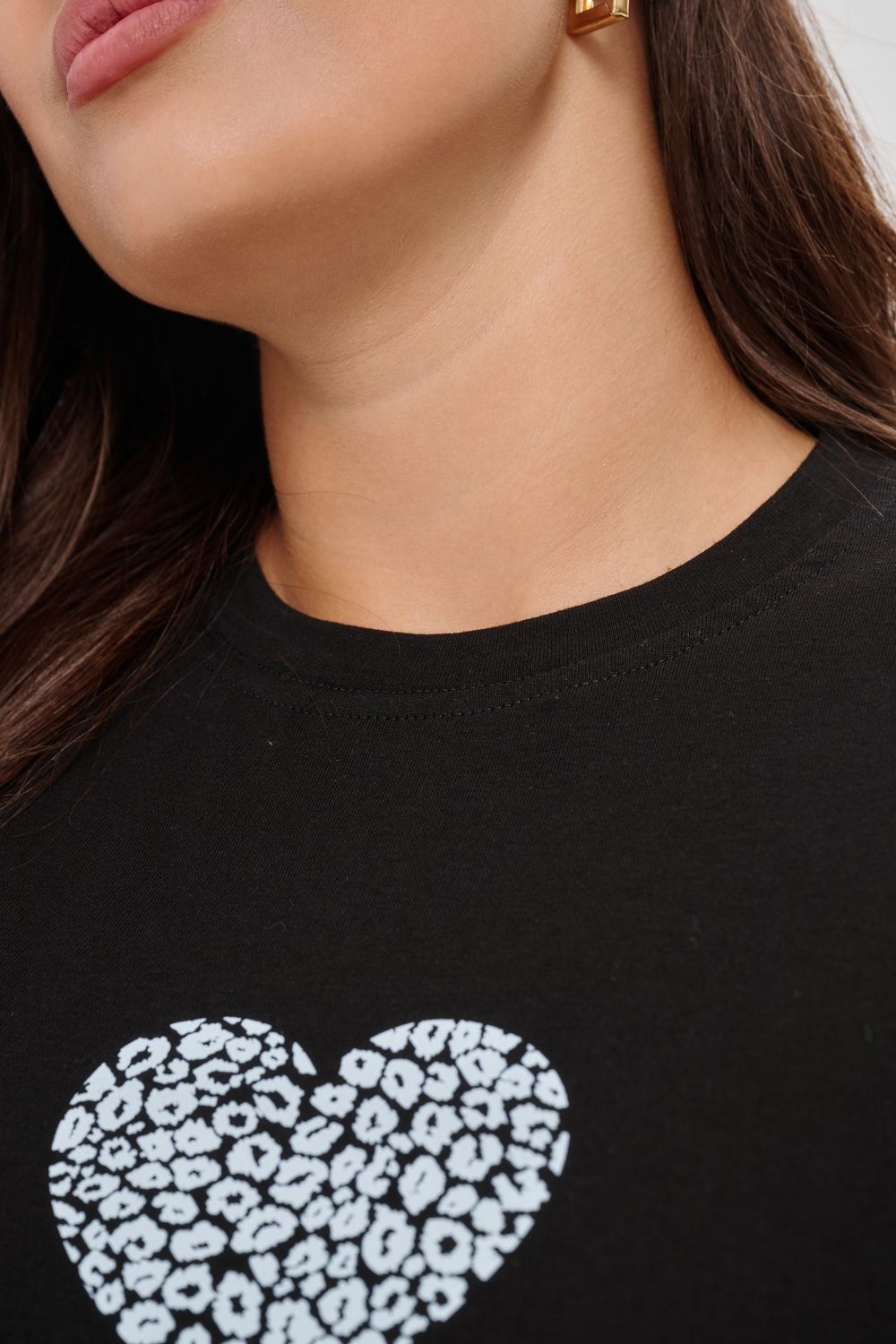 Женская футболка элегантного приталенного кроя с короткими рукавами и классическим круглым вырезом горловины. Минималистичный дизайн дополнен нежным принтом в форме сердца с леопардовым узором, создающими тонкий акцент на образ. Материал приятен к телу, обеспечивает комфорт и свободу движений. Идеально подойдет для повседневного стиля, подчеркивая женственность и утонченность облика обладательницы.