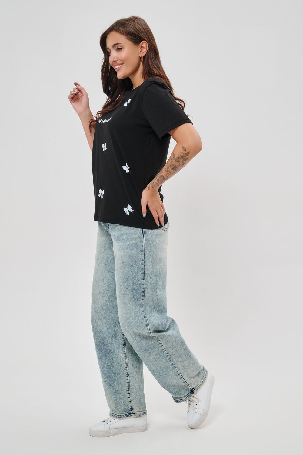 Женская футболка приталенного кроя, изготовлена из мягкого материала — кулирки. Элегантная форма с короткими рукавами и аккуратным круглым вырезом создают ощущение лёгкости и свежести образа. Особенное внимание привлекает надпись на груди, украшенная минималистичными маленькими бантиками в сдержанном чёрном цвете. Такая деталь добавляет образу шарма и игривости, оставаясь одновременно простой и изысканной. Футболка легко впишется в гардероб современной девушки, добавив нотку кокетства любому образу.