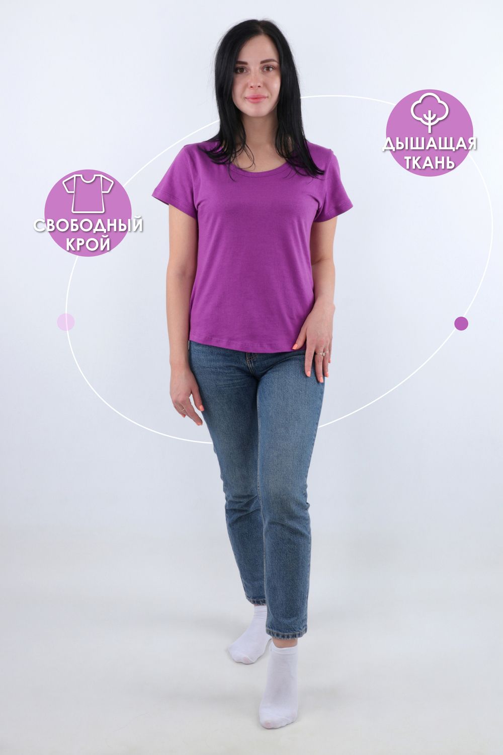Женская базовая однотонная футболка из 100% натурального хлопка. Универсальная модель свободного покроя с короткими рукавами и округлым вырезом горловины прекрасно смотрится с джинсами, брюками и юбкой, ее можно надеть в офис под кардиган или пиджак.