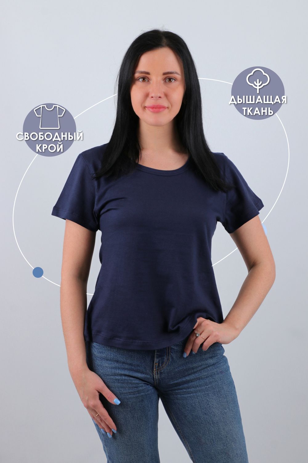 Женская базовая однотонная футболка из 100% натурального хлопка. Универсальная модель свободного покроя с короткими рукавами и округлым вырезом горловины прекрасно смотрится с джинсами, брюками и юбкой, ее можно надеть в офис под кардиган или пиджак.
